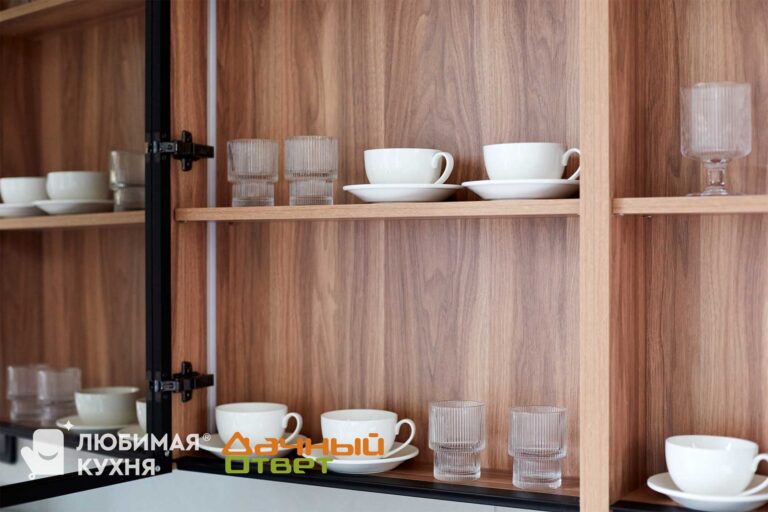 В основе модулей – влагостойкие ЛДСП. Снаружи – термостойкие МДФ-плиты. В напольных тумбах разместились многочисленные выдвижные ящики, а вместо ручки графичный профиль Гола. Кухонную композицию дополняют две верхние секции в оттенке «орех», дополненные подсветкой. Они хоть и узкие, но довольно вместительные, с несколькими полками в каждой. От посторонних глаз их скрывают навешенные на усиленные петли зеркальные дверцы с символом проекта – кругом.
