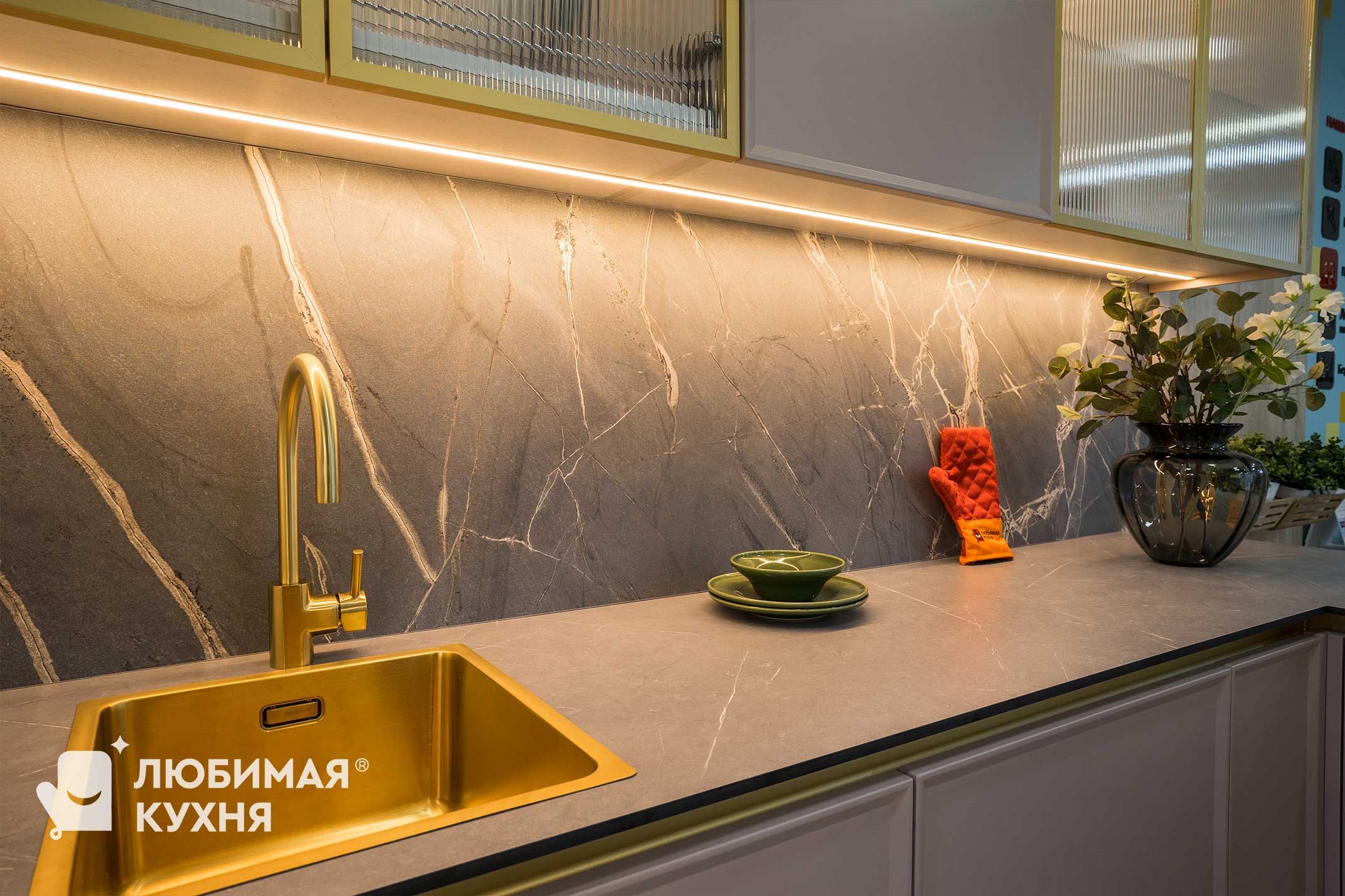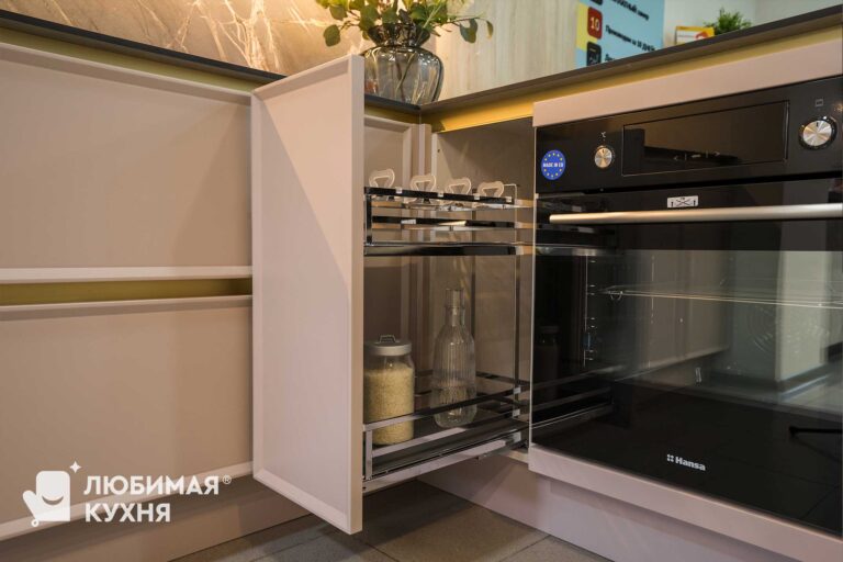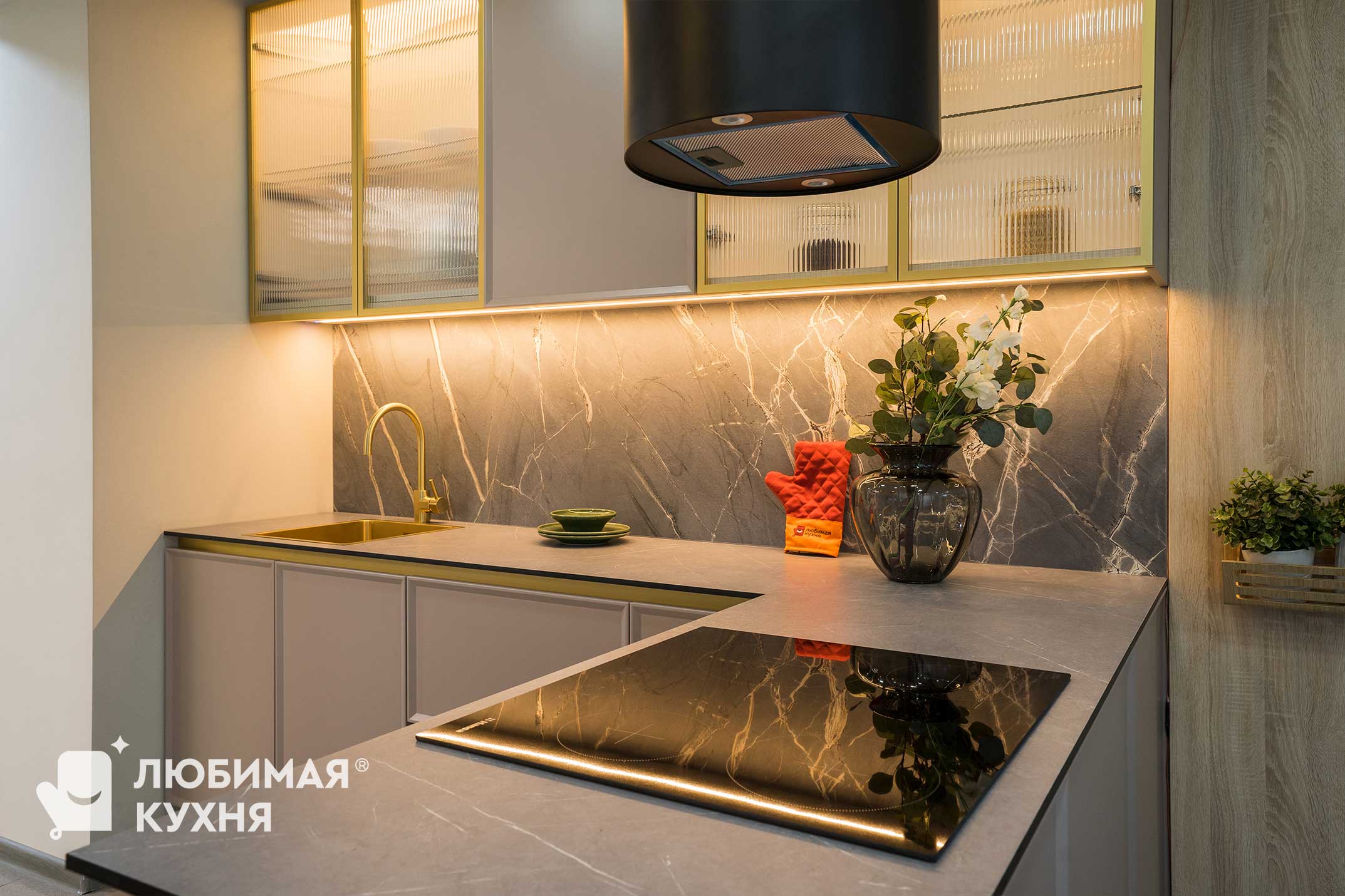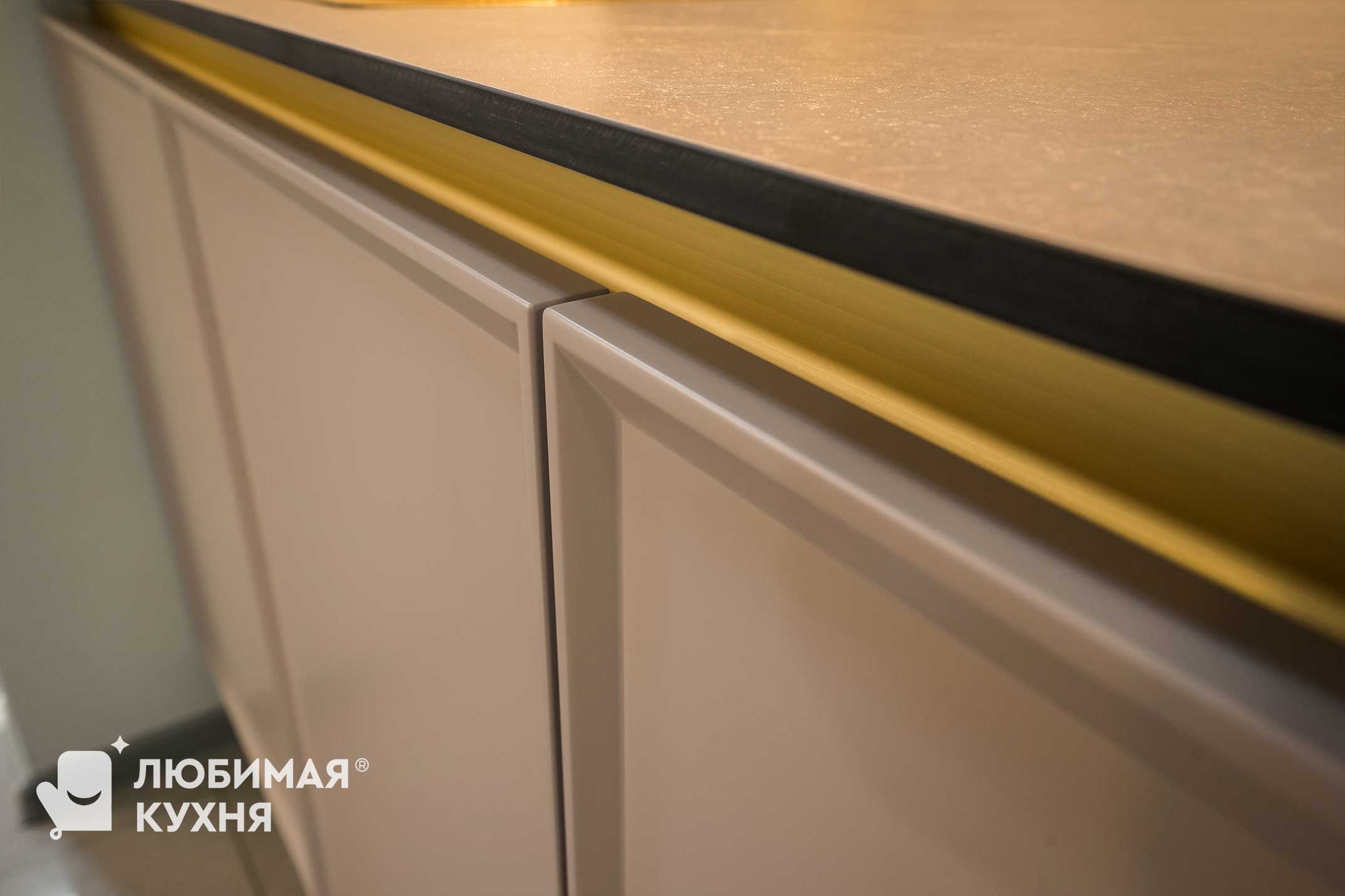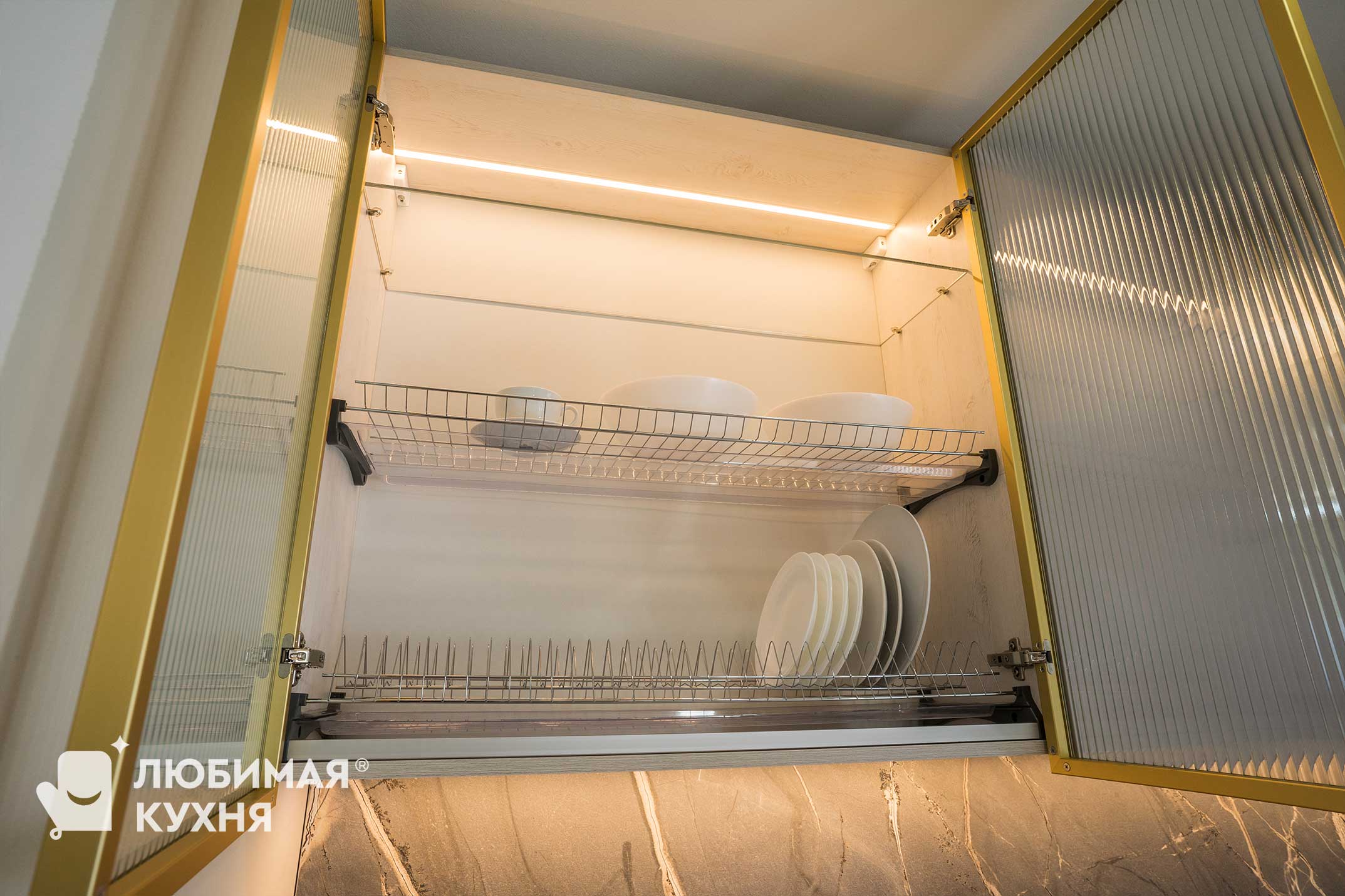 Красотой этой кухни можно наслаждаться вечно. Нежнейшие оттенки фасада в сочетании с золотыми деталями составляют оригинальное сочетание. А рифленые стекла — самый последний тренд в дизайне мебельных коллекций