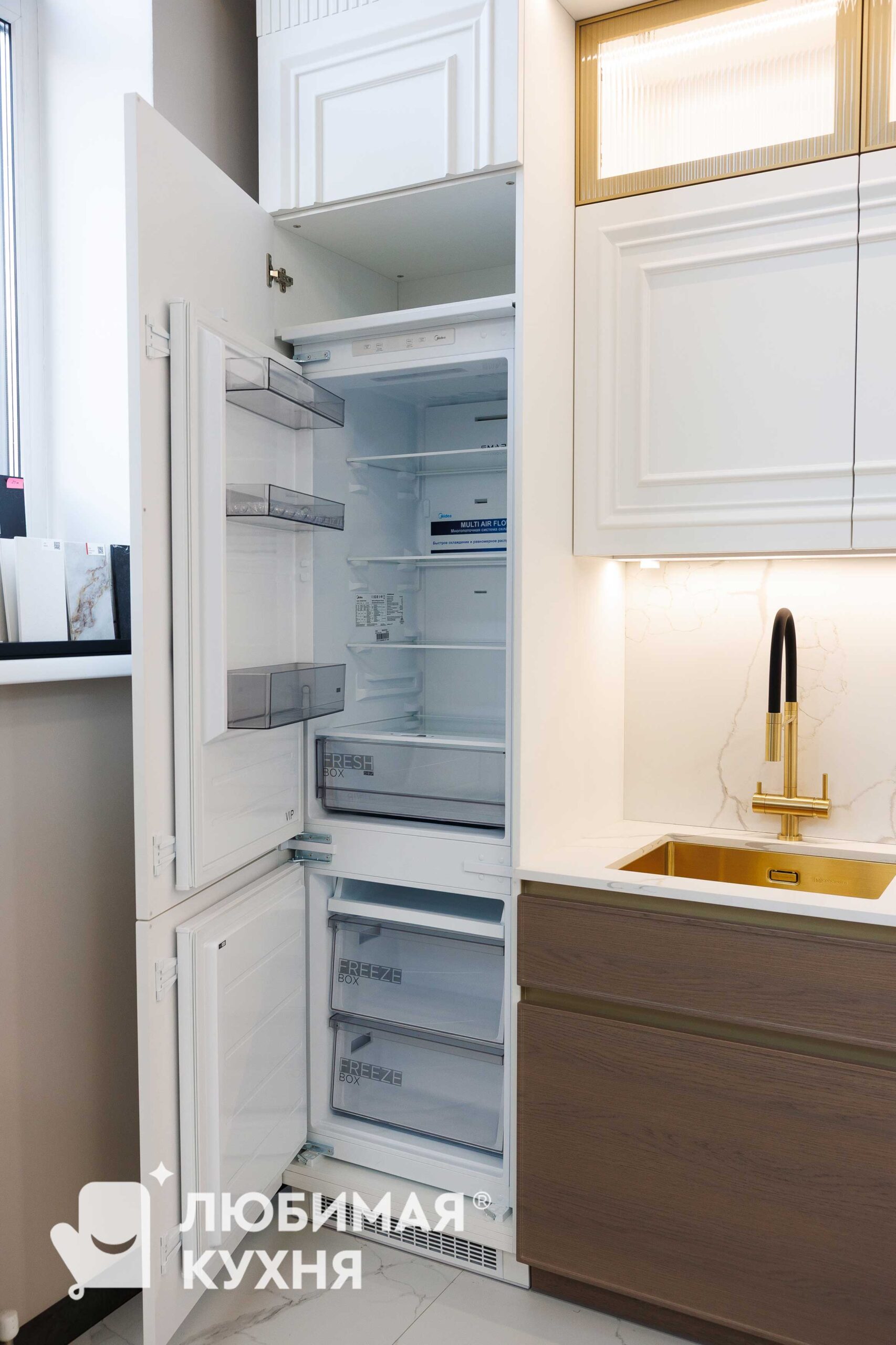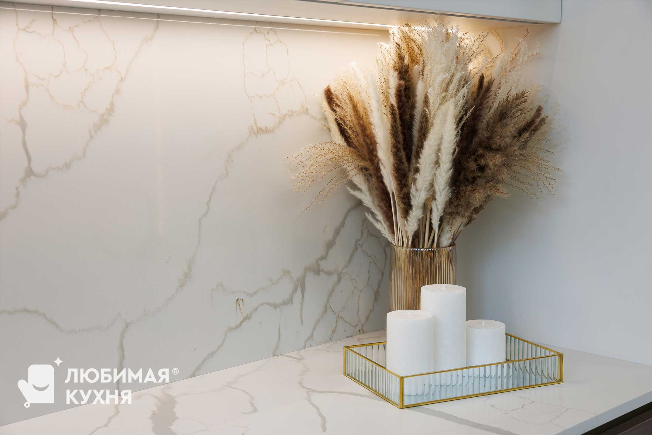 Светлые фасады с классической фрезеровкой, доходящими до потолка, визуально увеличивают высоту помещения и создают ощущение цельного архитектурного объёма. Витринные вставки с подсветкой добавляют лёгкости и декоративности. Карниз и вертикальные панели подчёркивают классический характер композиции.