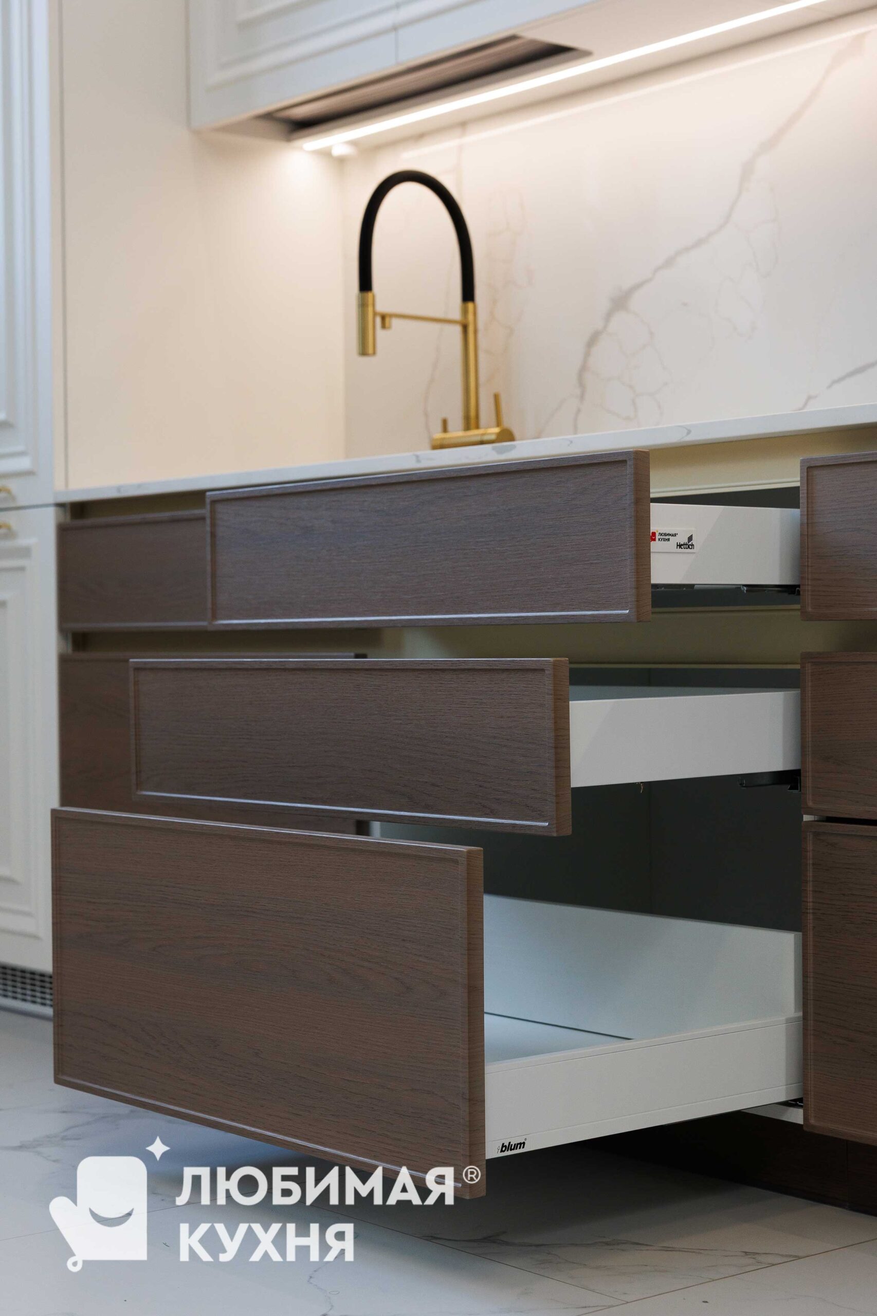 Нижние шкафы выполнены в оттенке темного дерева, что создаёт стильный контраст и балансирует классический верх современным низом. Лаконичные горизонтальные ручки поддерживают минималистичный настрой. Фартук и столешница с выразительной, но ненавязчивой текстурой светлого мрамора, объединяя всю композицию.