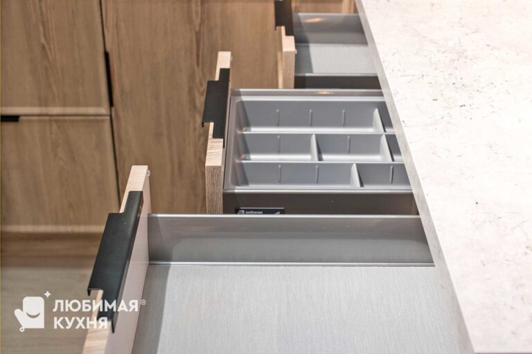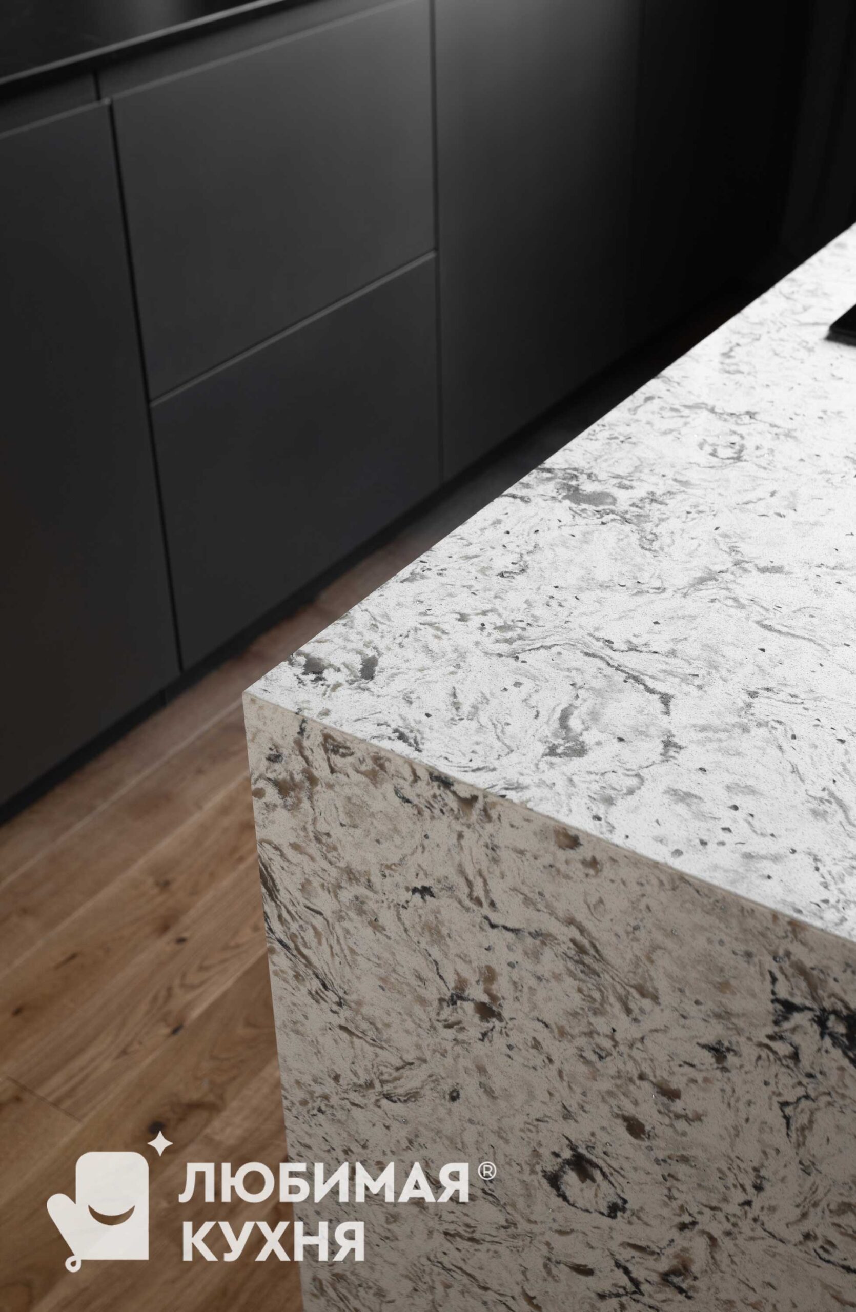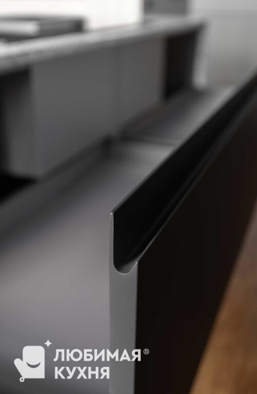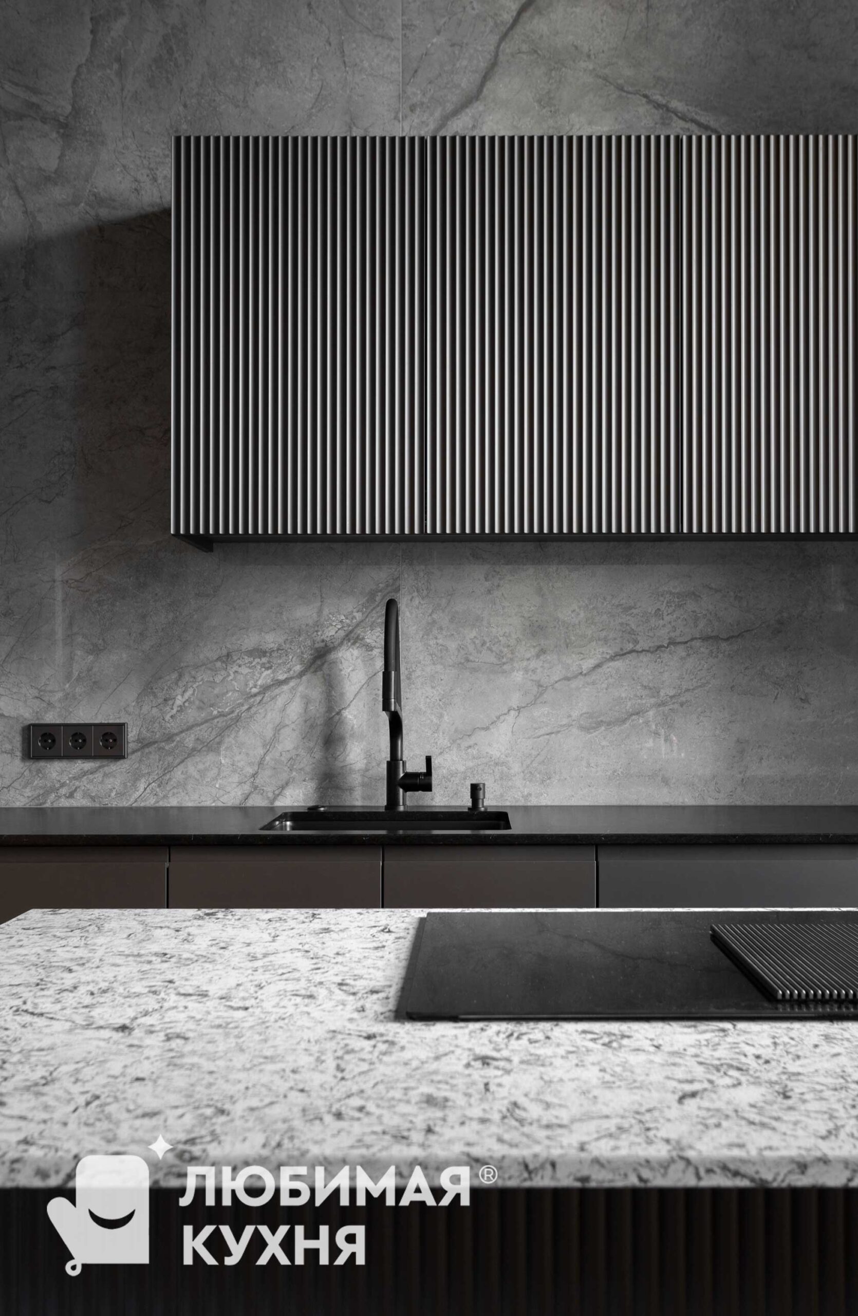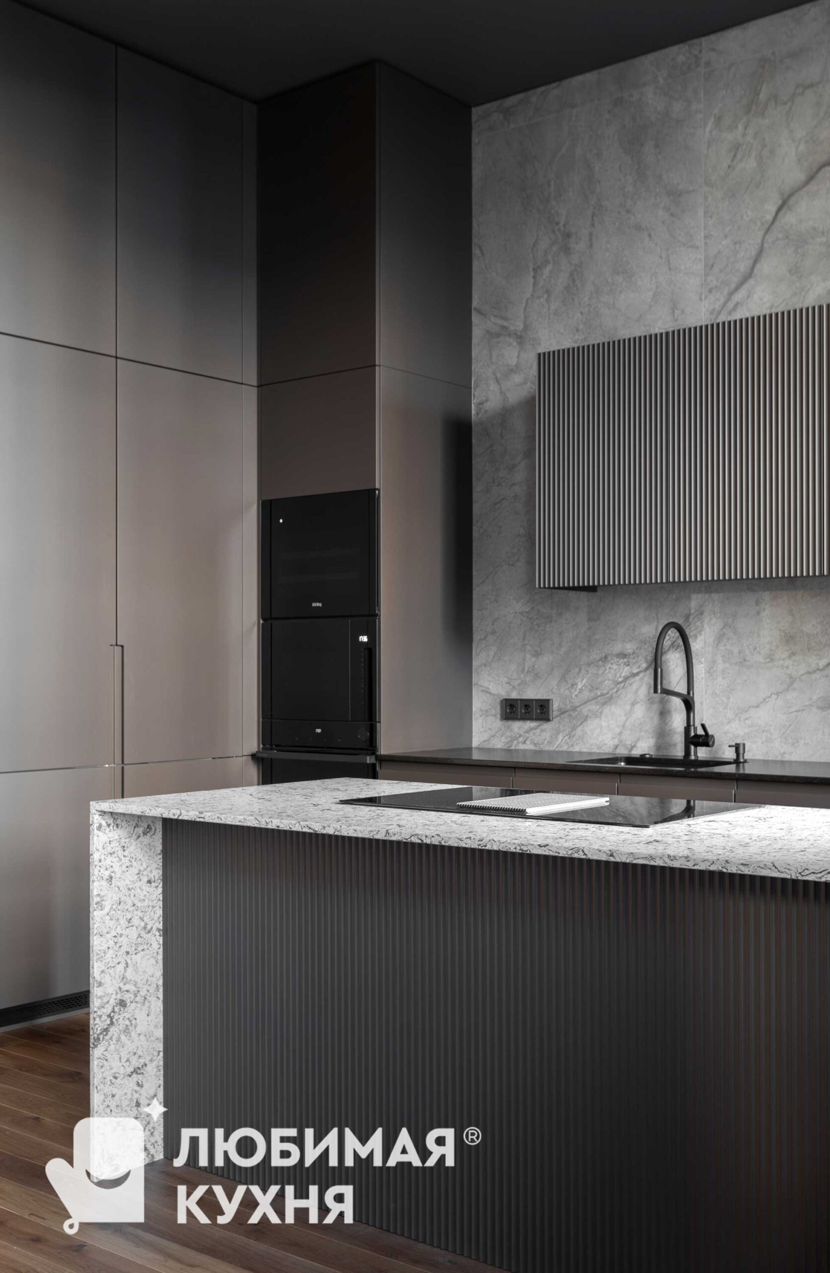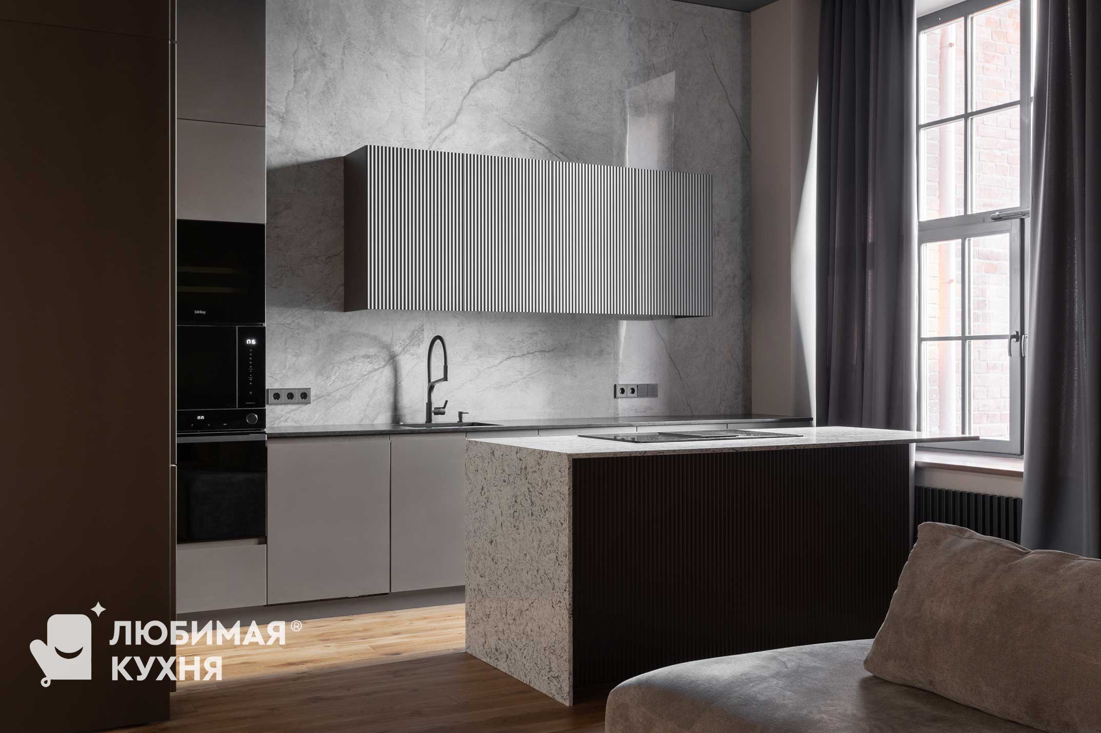 Кухня вне времени: Искусство утонченного минимализма.В этой кухне царит атмосфера утонченного минимализма, где каждый элемент продуман до мелочей. Серые матовые фасады шкафов создают монолитное пространство, сливаясь с фоновой плиткой под мрамор с выразительными прожилками. Акцент делается на подвесном модуле над рабочей зоной, выполненном с четкой вертикальной фрезеровкой, напоминающей строгий шрифт или ритмичный рисунок. Центральным элементом, вносящим в интерьер нотку природной текстуры, выступает кухонный остров. Черный смеситель с лаконичным изгибом идеально гармонирует с рабочей поверхностью и встроенной техникой.