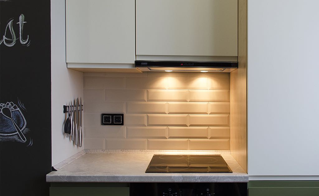 Пример очень стильного оформления небольшой кухни! Верхние шкафы до потолка, полновстроенная вытяжка и барная стойка задействует пространство помещения по максимуму, что делает кухню очень функциональной и компактной.
