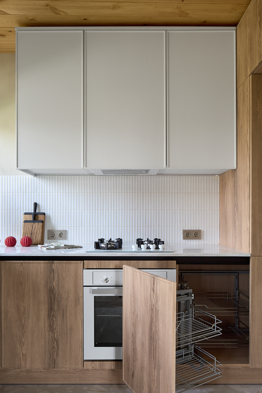 На такой кухне не только приятно будет готовить, но и функционально. Помимо верхних шкафов, ещё появился волшебный уголок, куда можно убрать кухонный инвентарь и антресоль под потолком