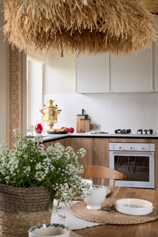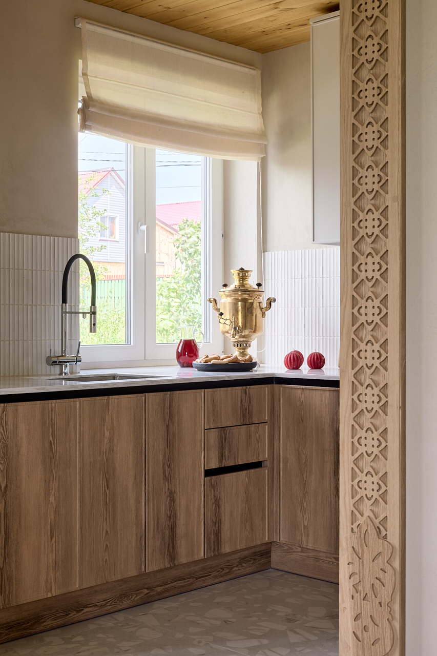 В июльском проекте “Дачный ответ” семья Корнеевых обзавелась новой кухней с элементами русского стиля. Большой круглый стол, панорамное окно, удобное расположение холодильника и ящики под мойкой — то, о чём мечтали хозяева дома, но боялись сказать. Благодаря этому проекту их теперь встречает минимализм на кухне с использованием дерева — символа русской избы. Кухонный гарнитур от “Любимой кухни” из ДСП «Ламарти» с ламинацией под дерево в оттенке «орех Неаполь».