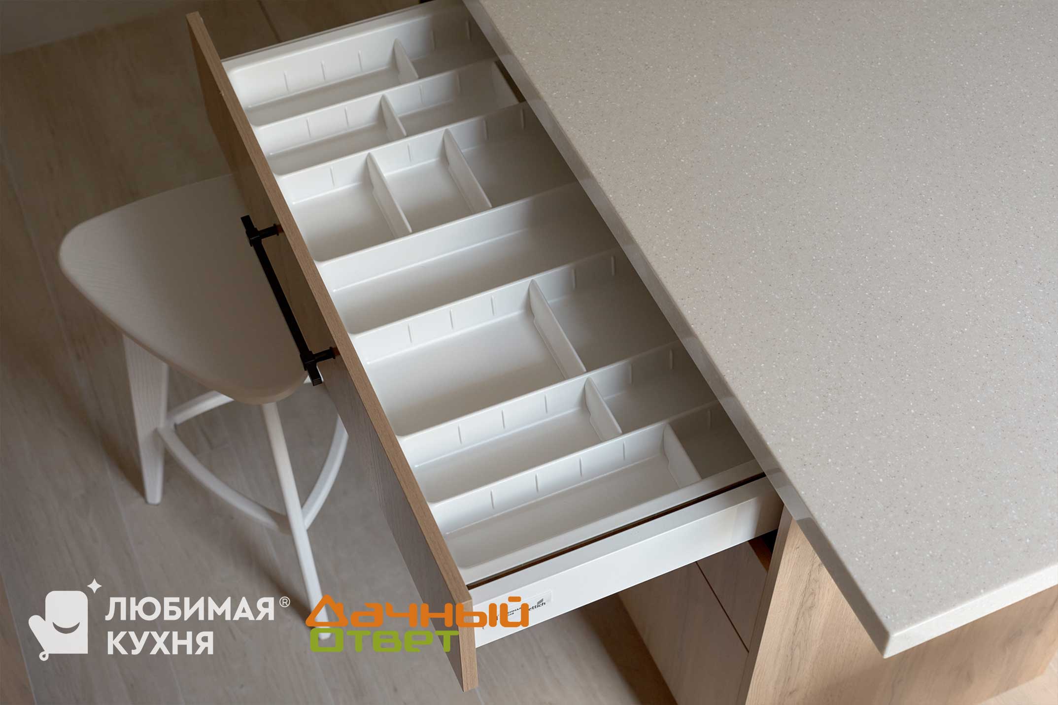 Основание кухонного островаочень функциональное –здесь можно хранить полезную утварь. Ящики в нижней базе немецкого производителя Hettich обеспечивают плавное и бесшумное закрывание. Снабжены фирменным лотком под столовые приборы с удобными регулируемыми перегородками, позволяющими создать нишу нужной длины под конкретные размеры.