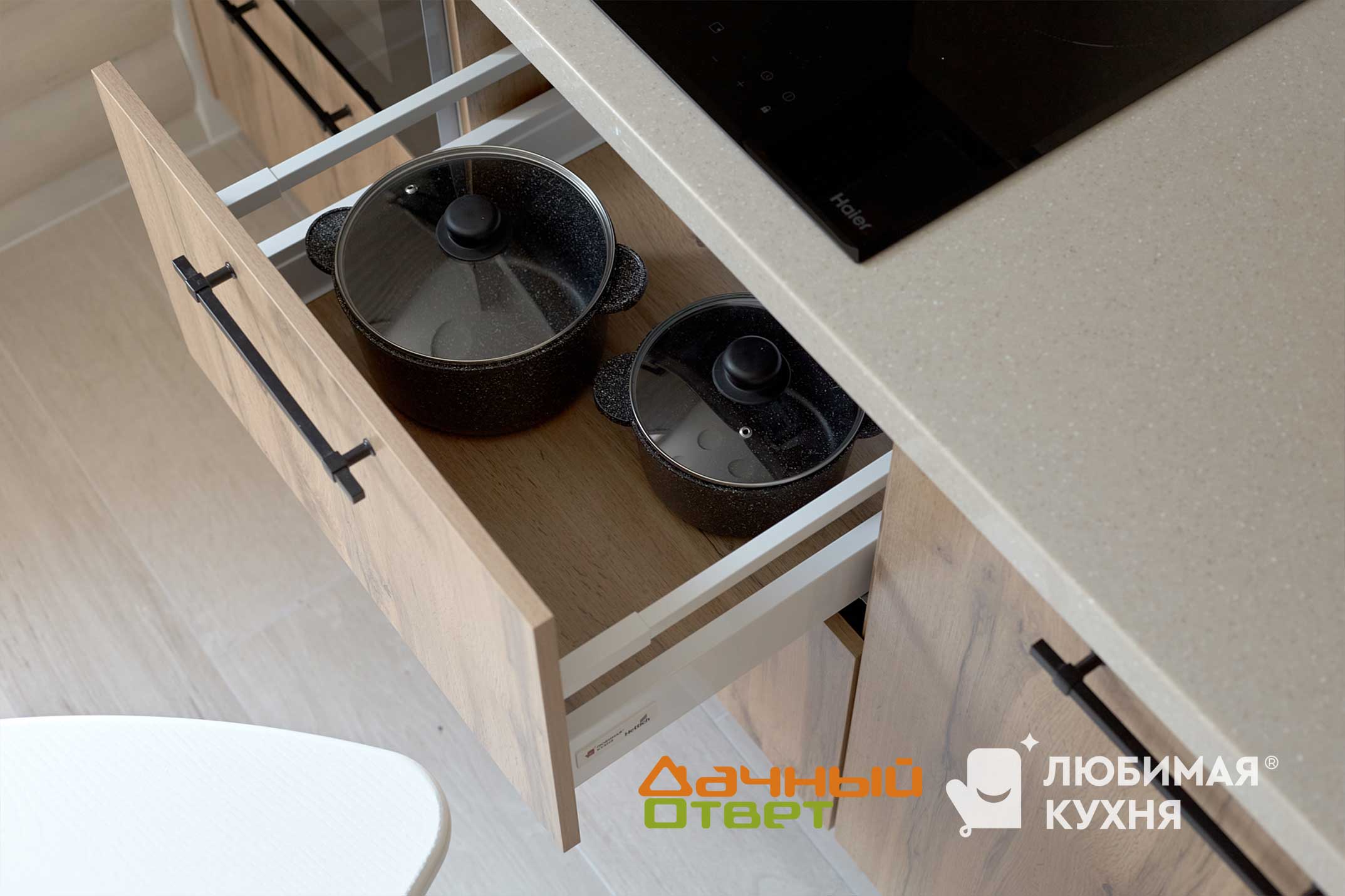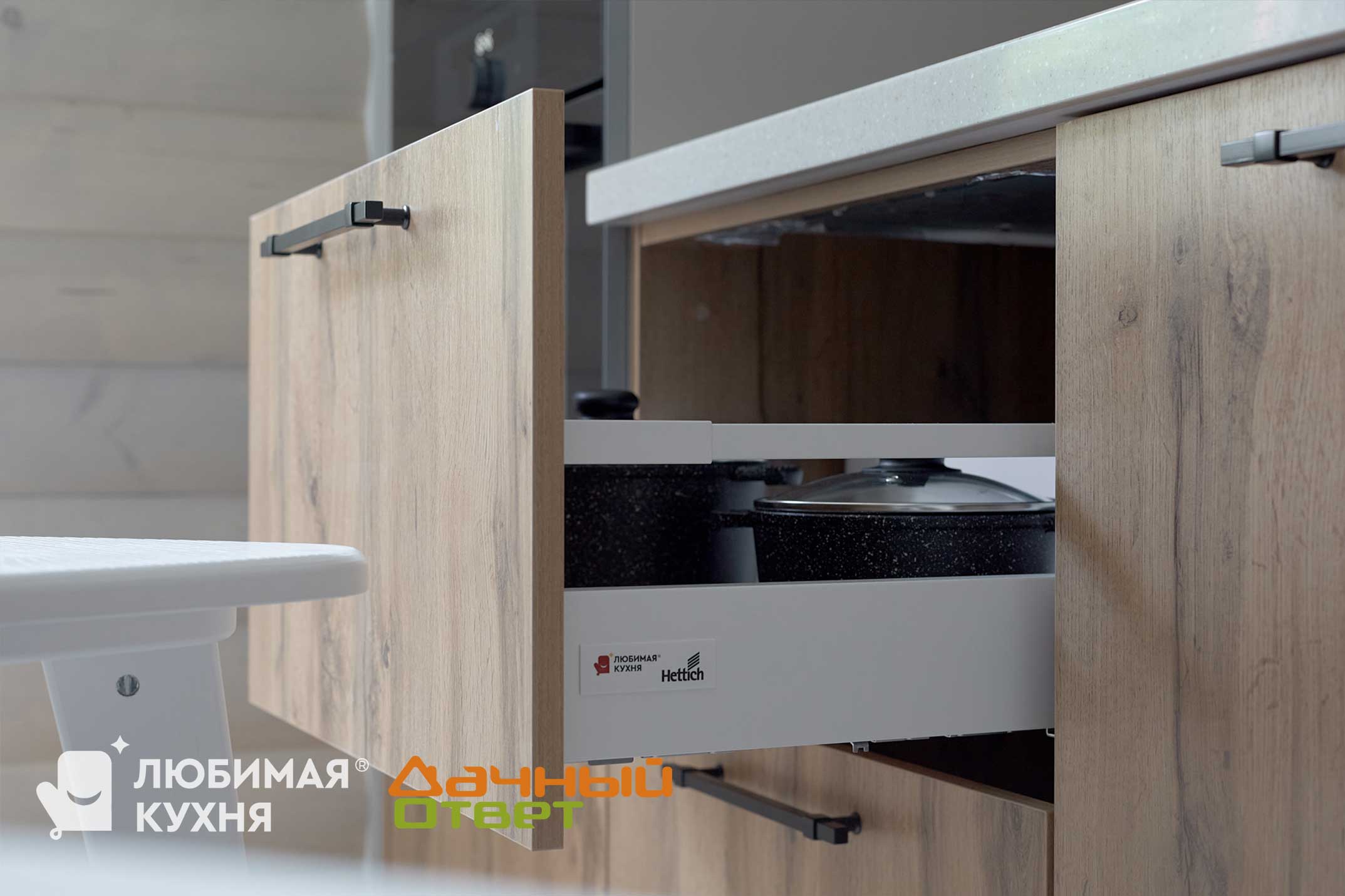 Корпус из ЛДСП в двух цветах – белом и под дерево. Ящики и шкафы выстроились в два плотных ряда, так что мест для хранения у наших героев теперь много. Фурнитура австрийская, качественная. С такой дверцы хлопать не будут, и работают плавно и бесшумно.