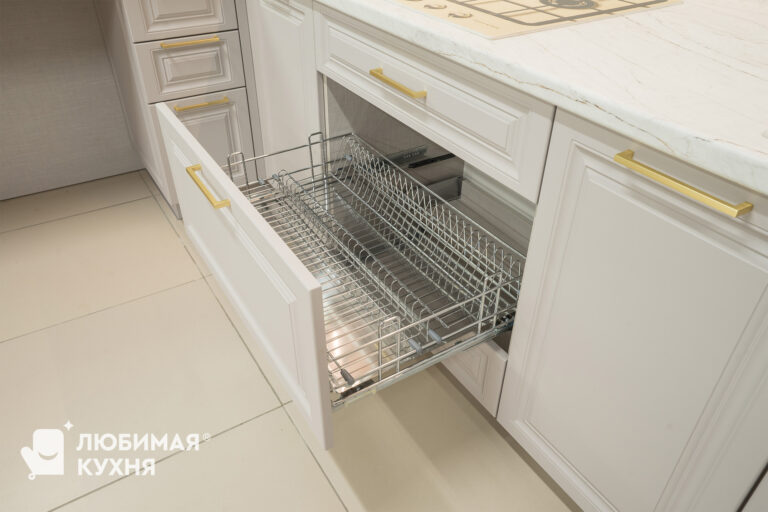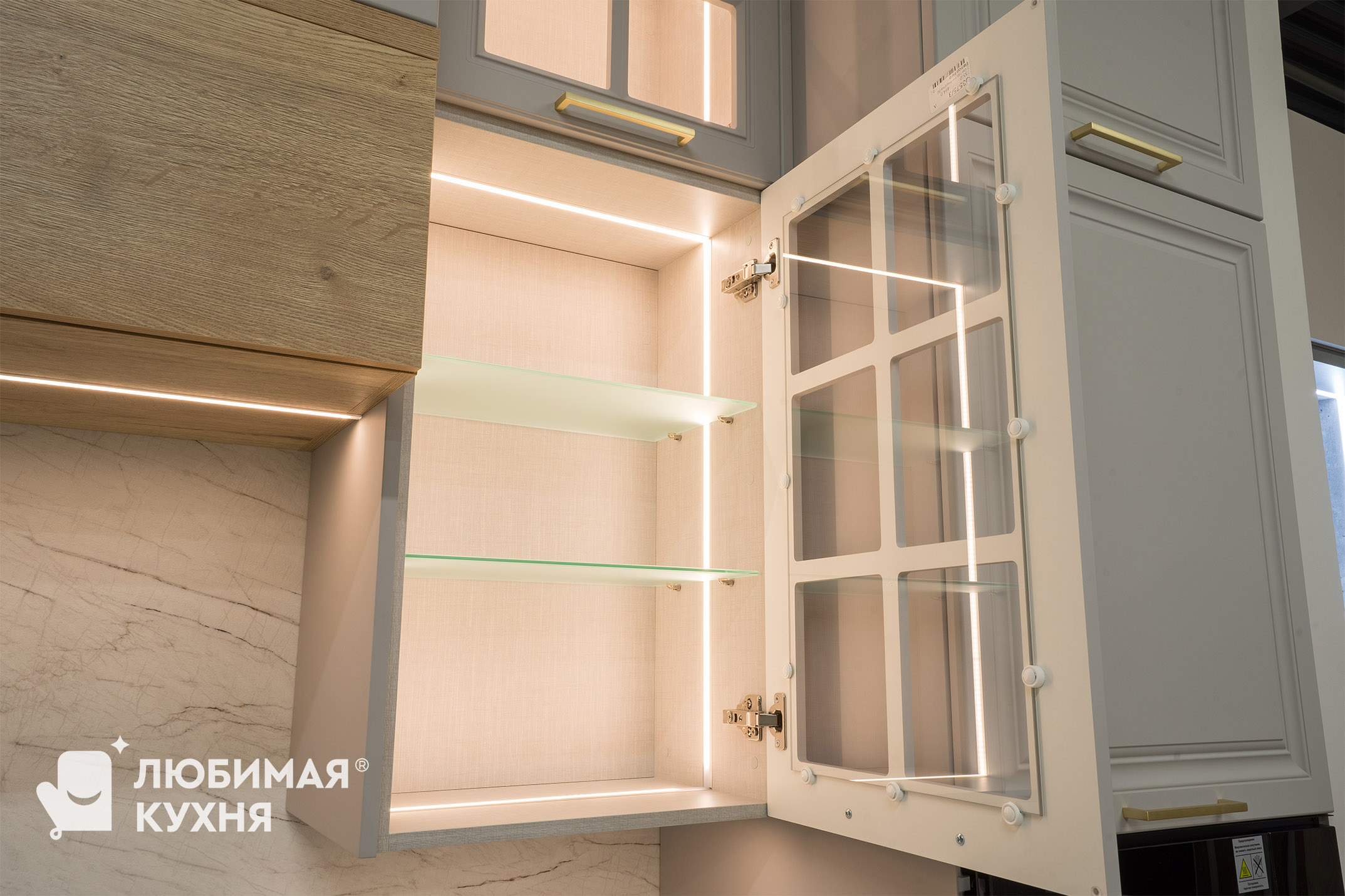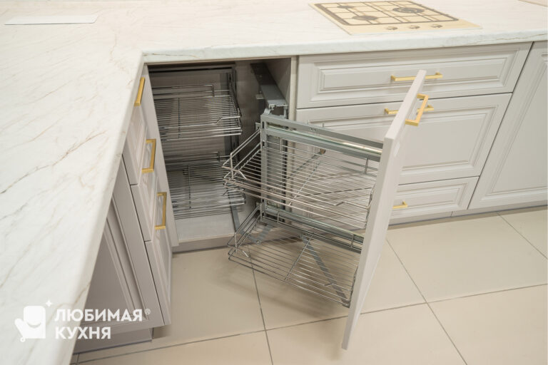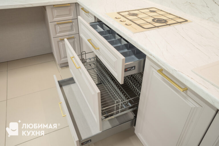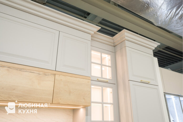 Кухня в стиле современная классика, в угловой конфигурации с удобным местом для приема пищи. Оформлена в светлых тонах с элегантными золотыми акцентами. Стеклянные витрины не только облегчают визуальное восприятие пространства, но и добавляют функциональности, позволяя красиво выставить посуду и декоративные элементы. Такое решение создает атмосферу легкости и воздушности, одновременно сохраняя классическую элегантность и современный комфорт.