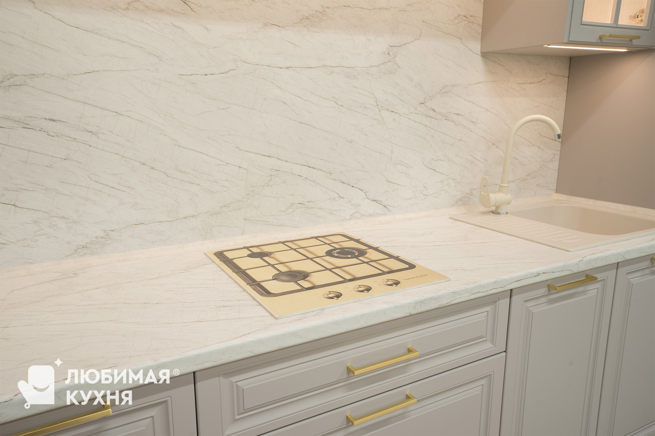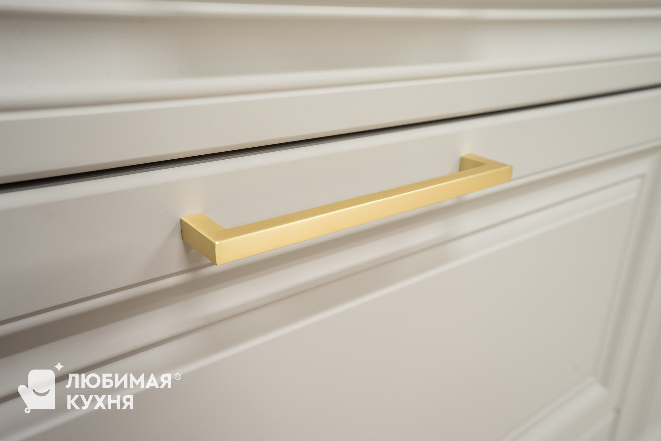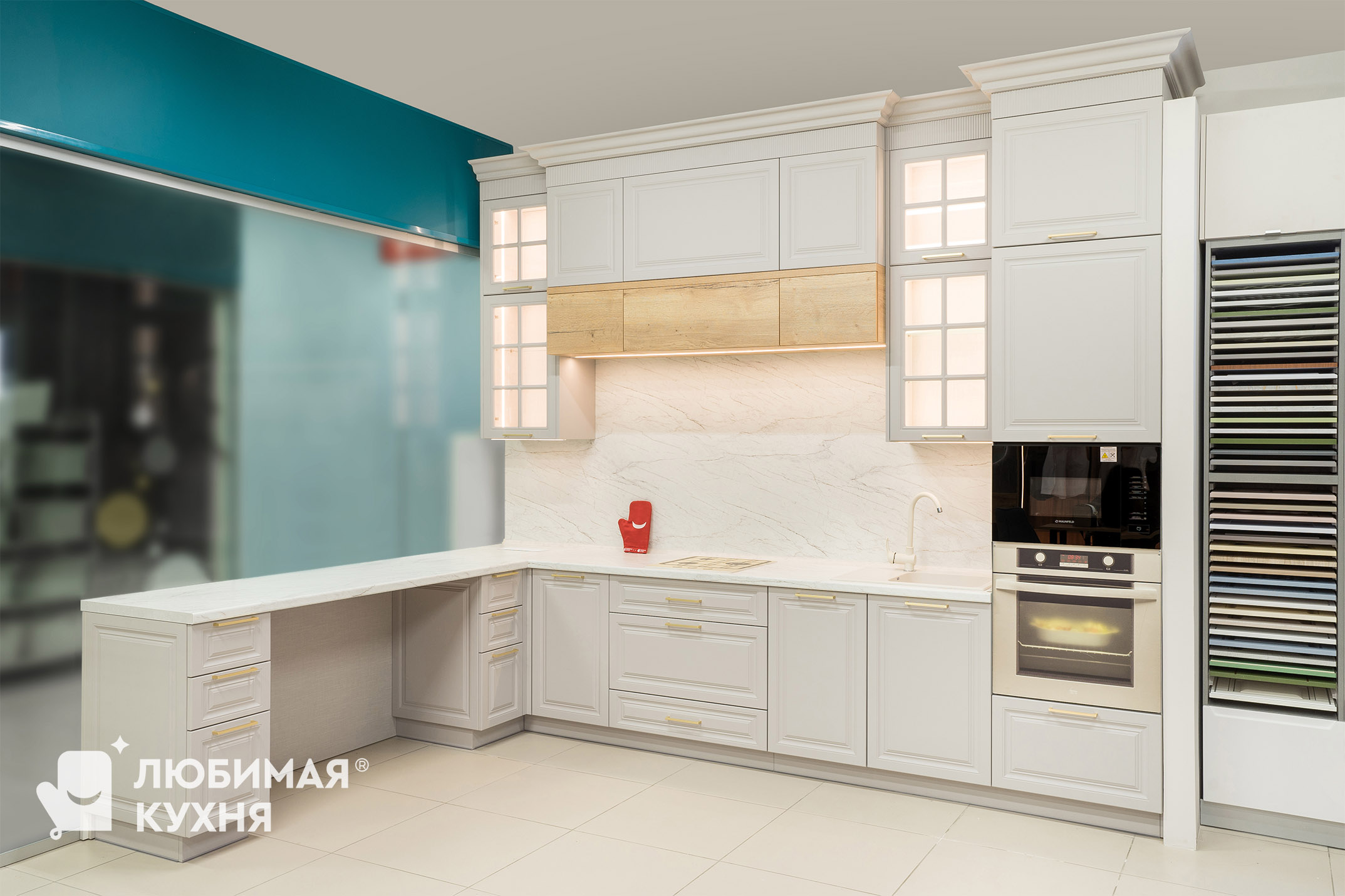 Кухня в стиле современная классика, в угловой конфигурации с удобным местом для приема пищи. Оформлена в светлых тонах с элегантными золотыми акцентами. Стеклянные витрины не только облегчают визуальное восприятие пространства, но и добавляют функциональности, позволяя красиво выставить посуду и декоративные элементы. Такое решение создает атмосферу легкости и воздушности, одновременно сохраняя классическую элегантность и современный комфорт.