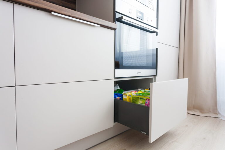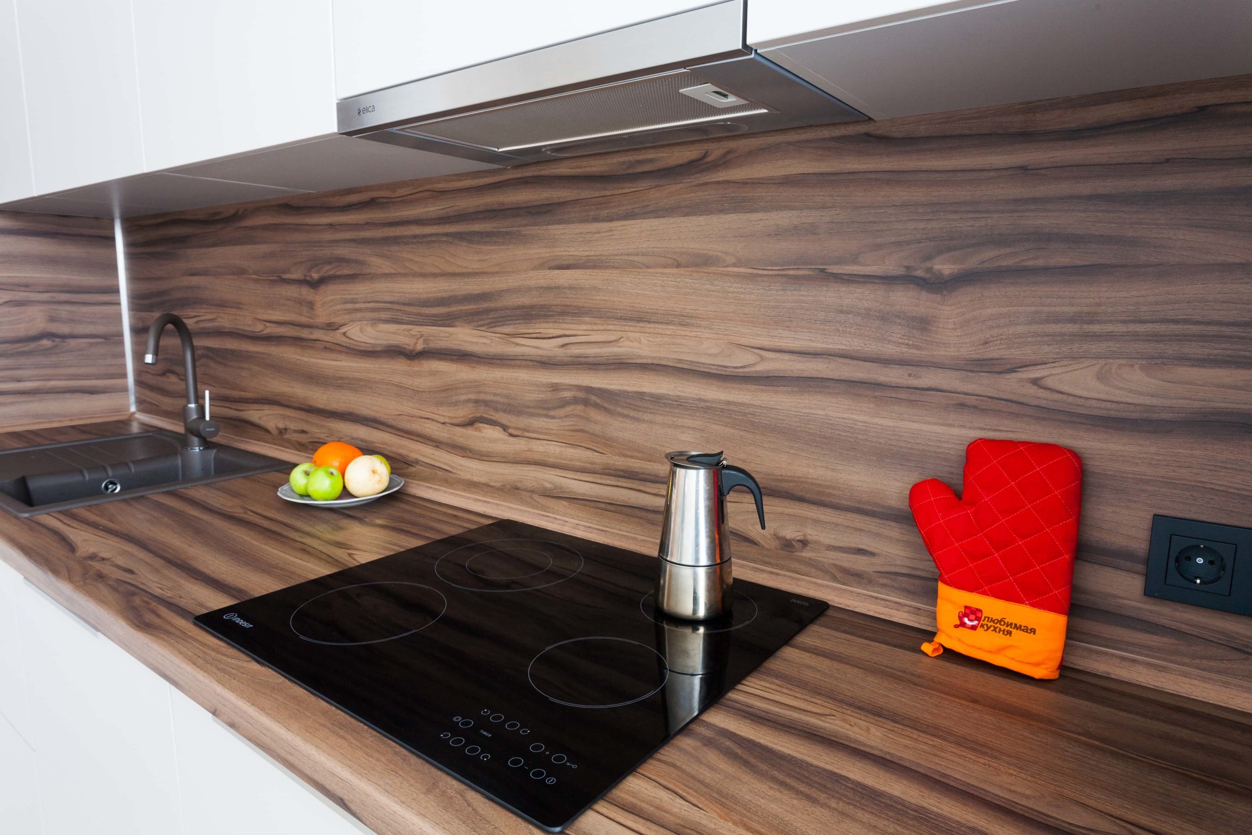 Светлая и просторная кухня в современном стиле. Сочетание светло бежевого и древесной текстуры создает атмосферу уюта и тепла. Высокие шкафы до потолка визуально расширяют помещение и позволяют максимально эффективно использовать пространство под потолком, пеналы вмещают себя не только технику, но создают дополнительные места для хранения!