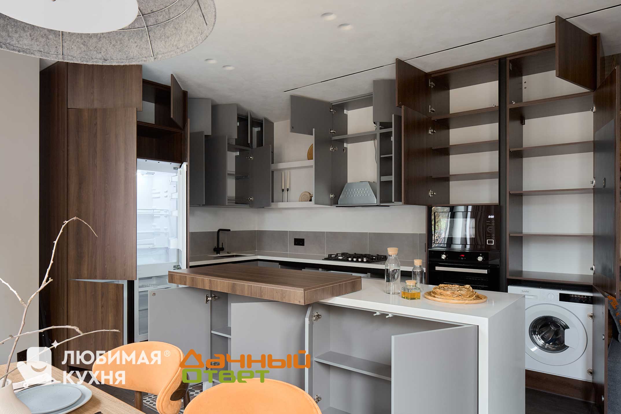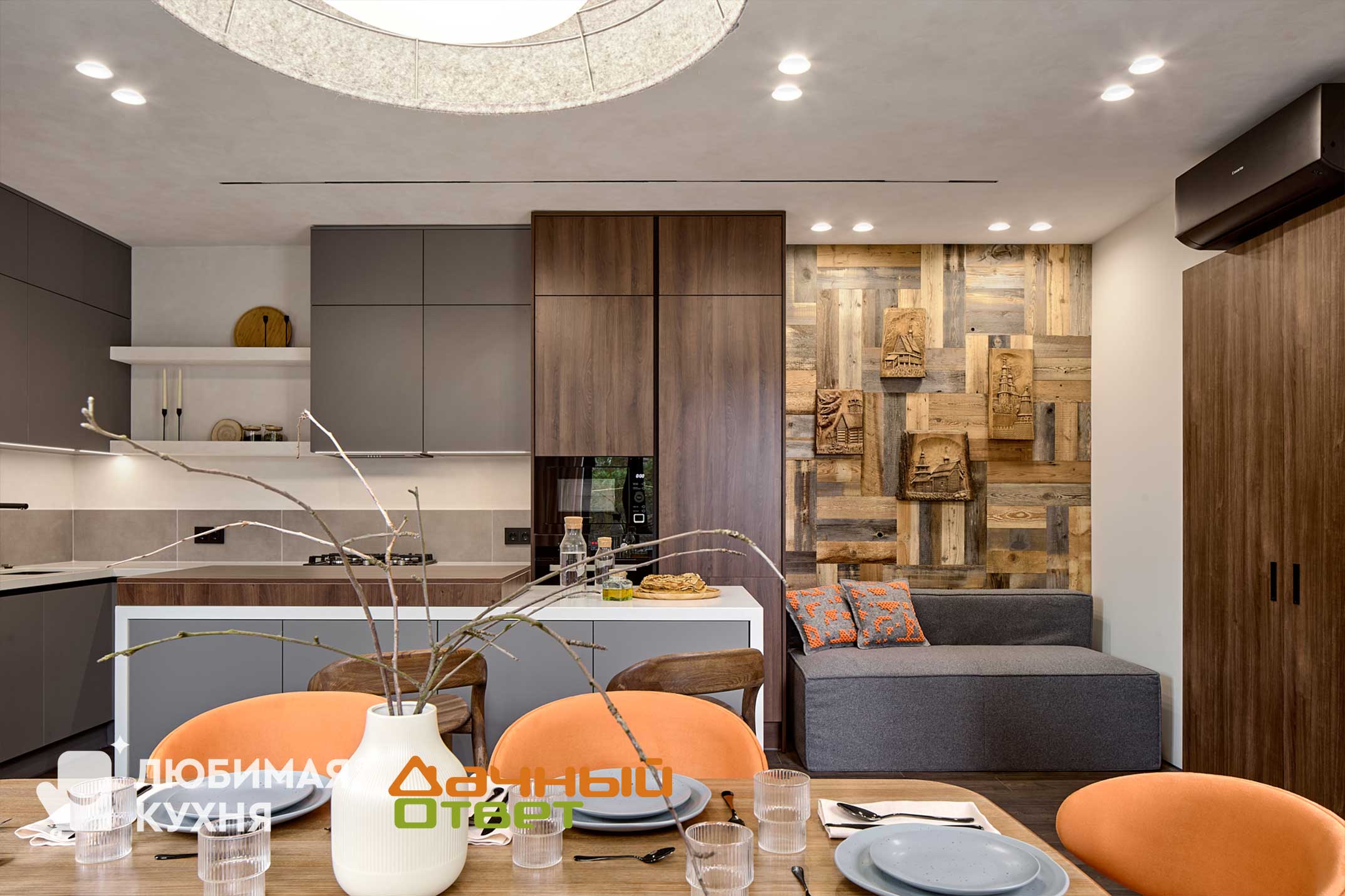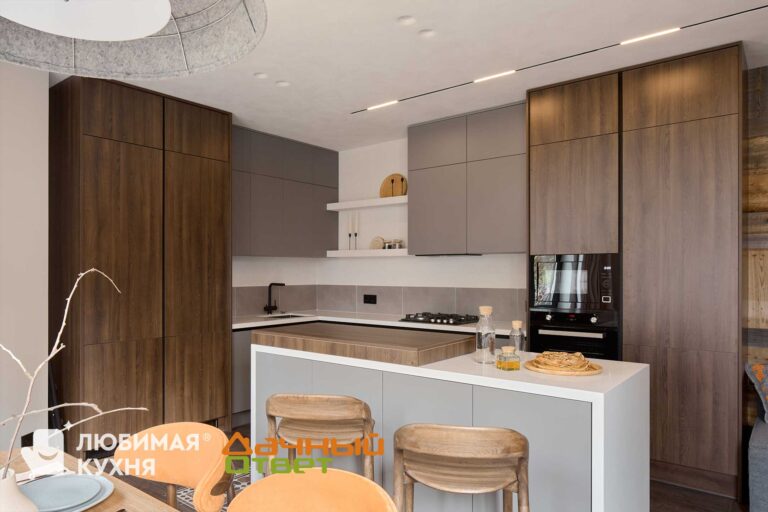 Источником вдохновения стал горный ландшафт, обладающий природной силой. При этом интерьер получится домашний, уютный и теплый. Это обеспечит сочетание разных фактур и орнаментов, а также насыщенные, контрастные текстуры. Сама кухня получилась лаконичной и максимально закрытой, при этом кухонный остров даст возможность увеличить рабочее пространство. Кроме того, с помощью выкатной столешницы появляются дополнительные места для быстрого перекуса.