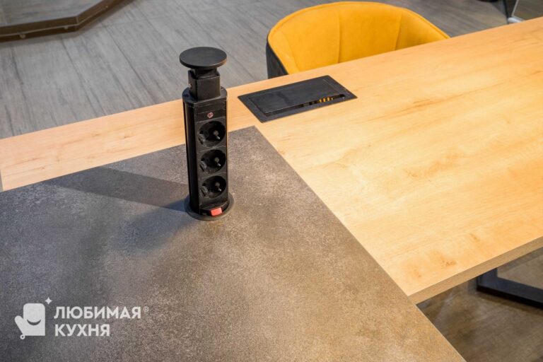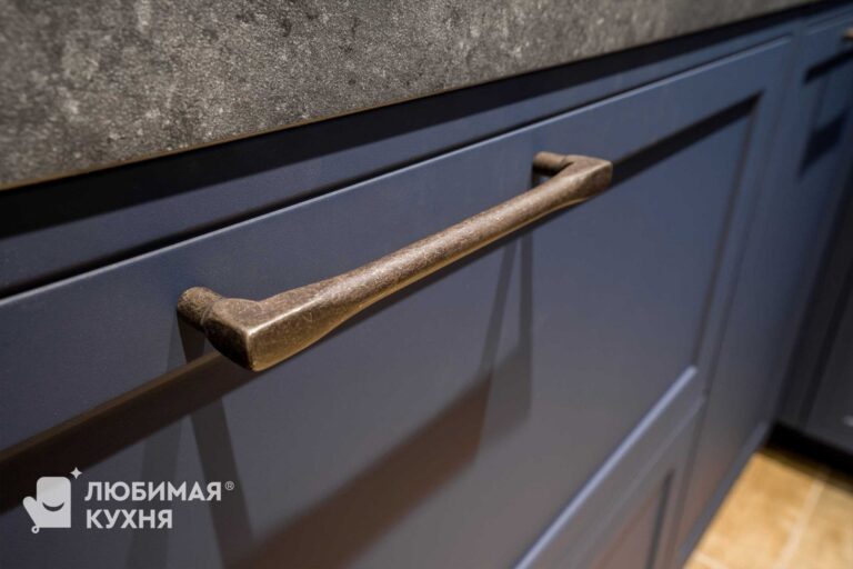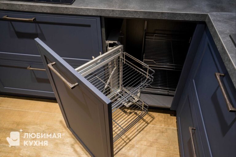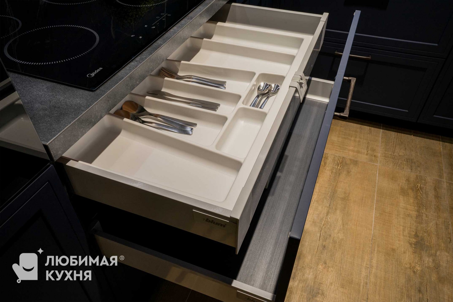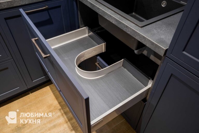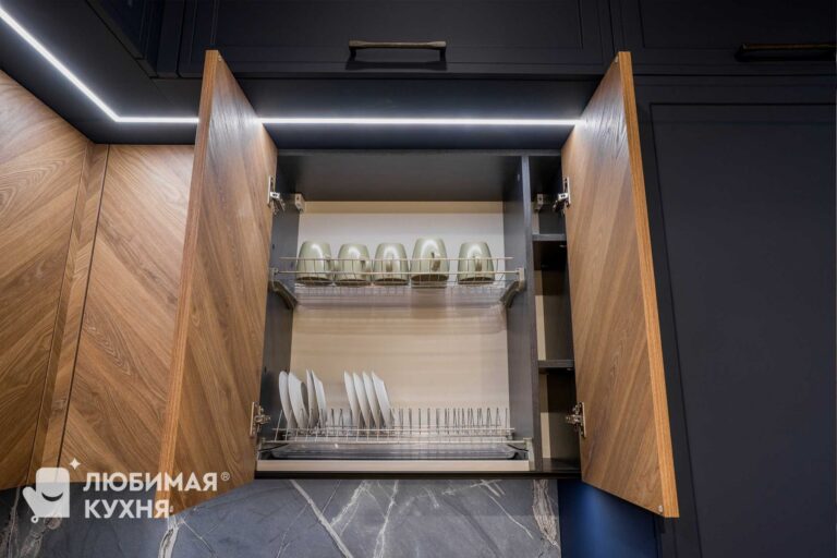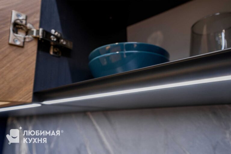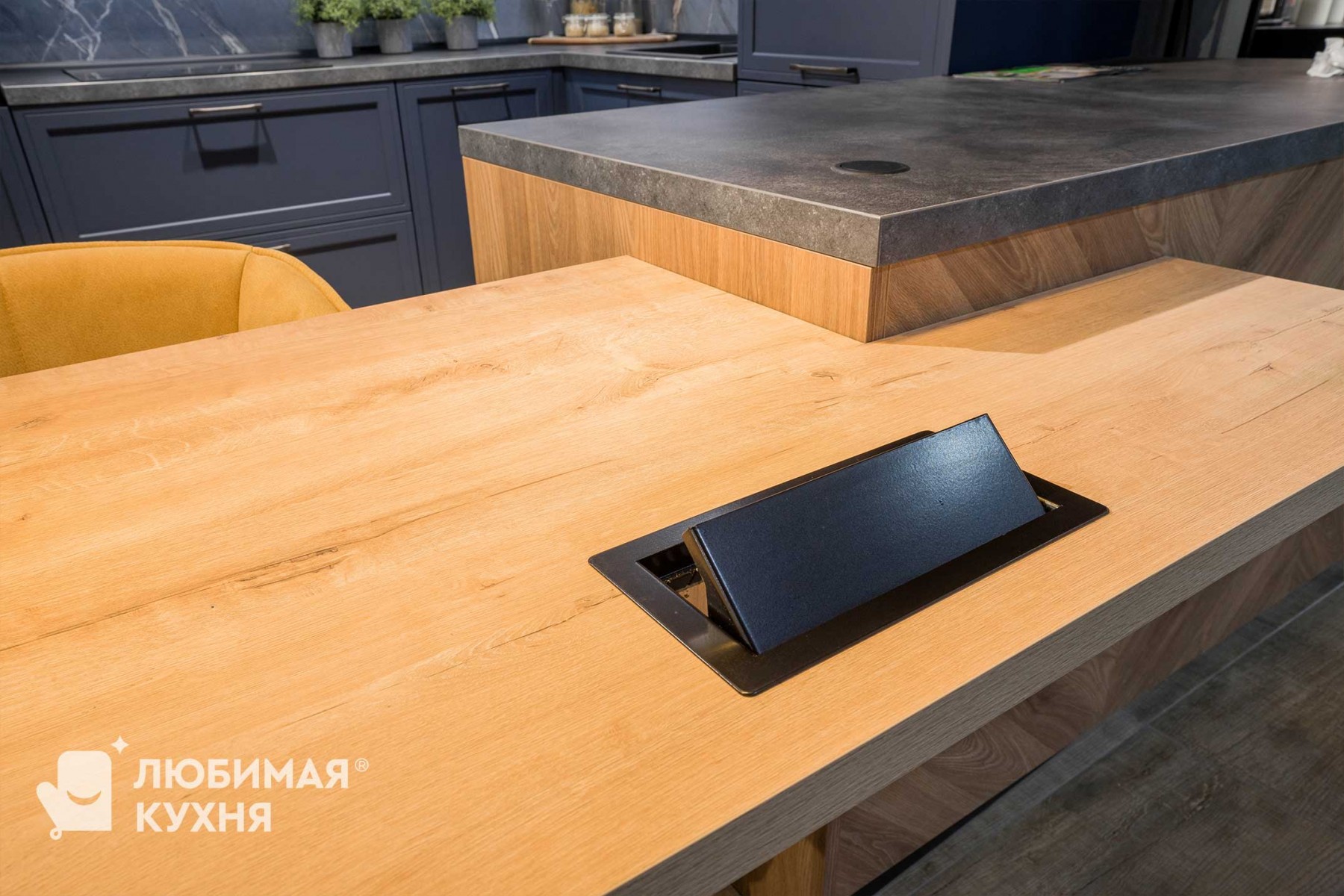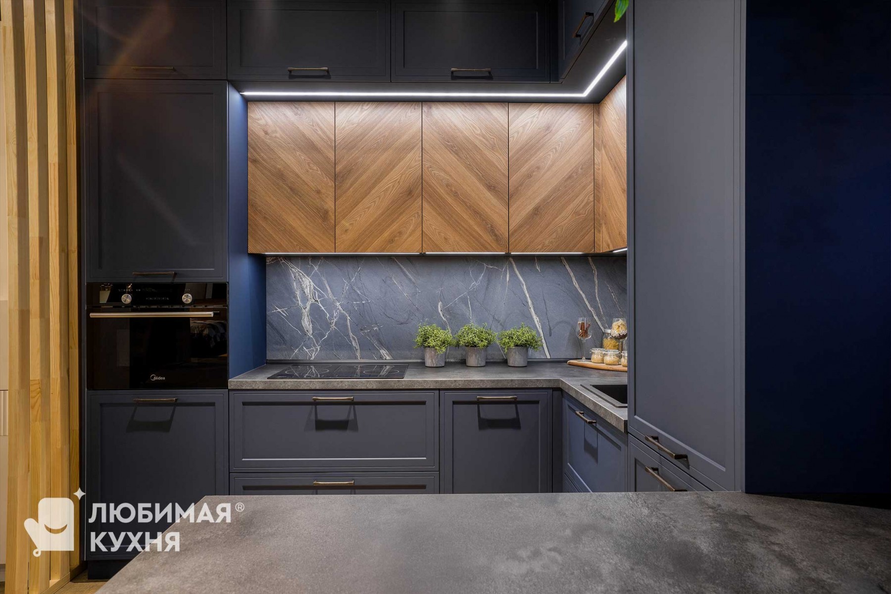 Глубокий синий цвет, словно океан завораживает и манит. А вместе с древесными фасадами получается просто невероятное сочетание. Брутальность, функциональность и продуманность до мелочей делает эту модель мечтой каждой хозяйки