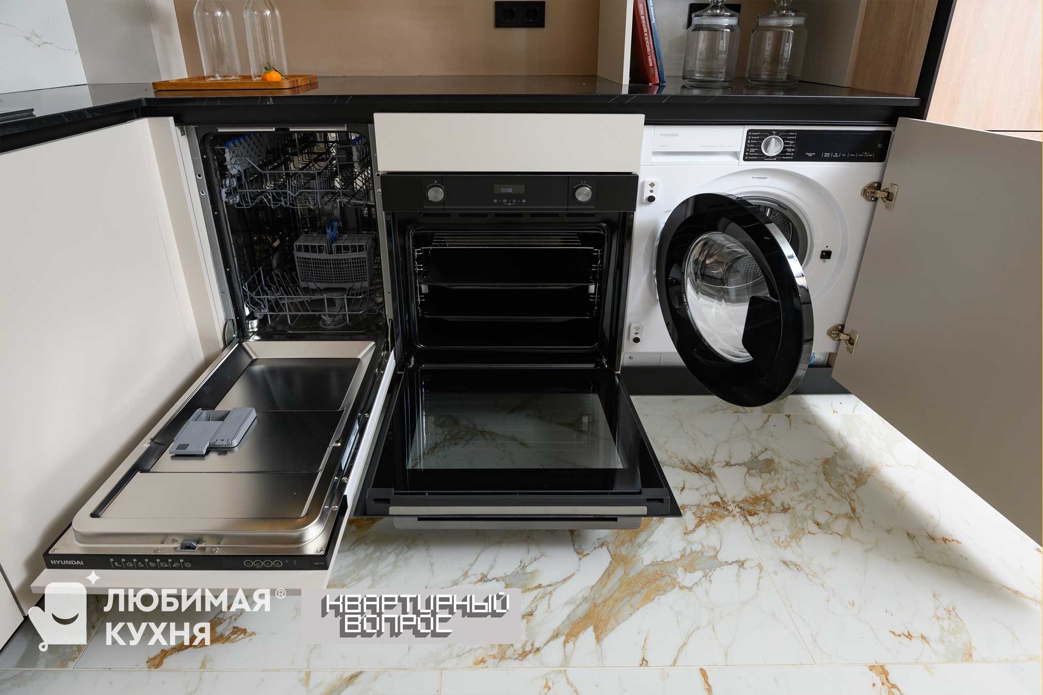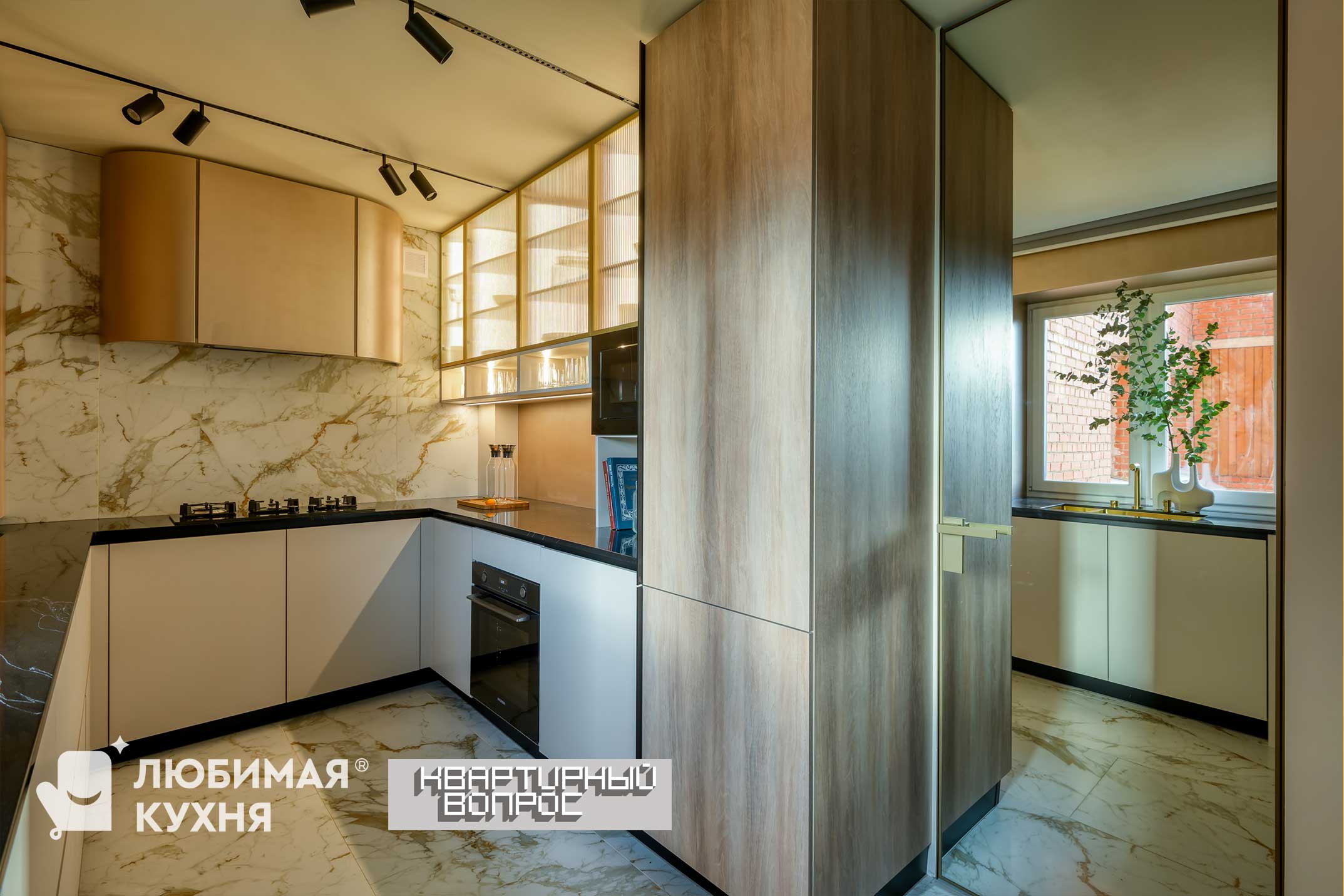 Масштабная переделка — затронула кухню, гостиную и коридор. В результате появилось единое пространство, в котором будет кухня станет удобнее и просторнее, а в гостиной – место для полноценной двуспальной кровати. Помогут нам в этом знание математики и архитектурное образование, немного магии и основательная работа со стенами и дверными проемами. А объединит комнату бежевый цвет, компанию которому составят мягкие полутона и контрастные акценты черного и белого цветов.