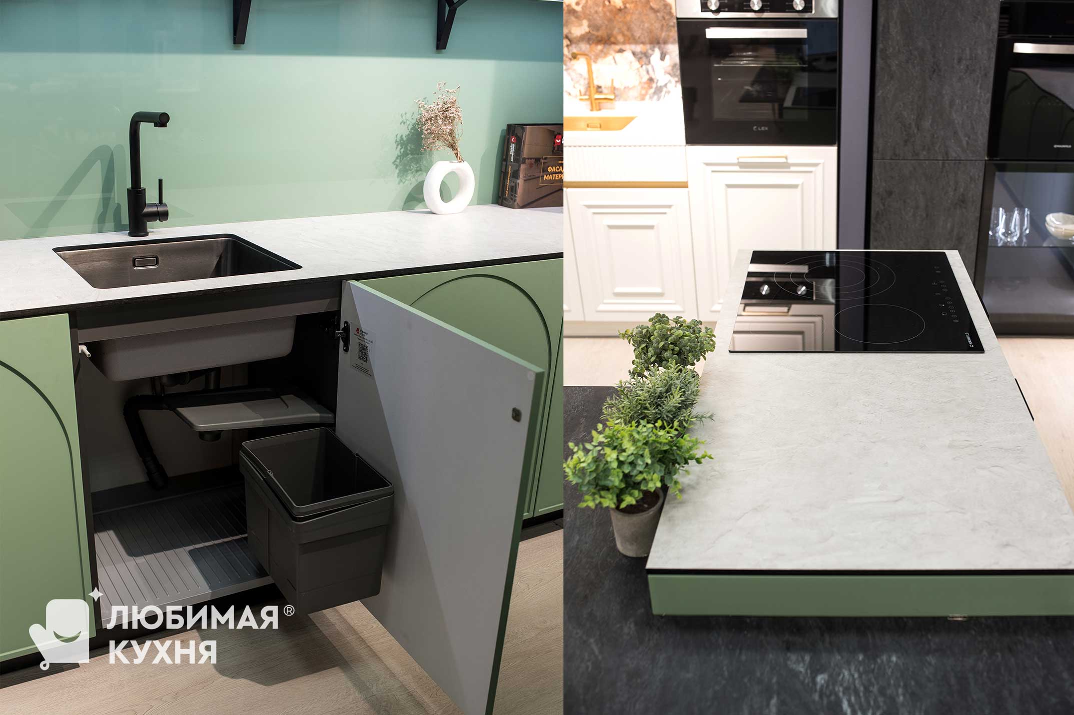 Яркое сочетание зелёных фасадов и полосатого акцента. Да, здесь можно позволить себе украсить зону открытого хранения, ведь весь функционал собран в чёрном вместительном пенале. А что бы расширить рабочую зону, здесь представлен удобный остров. Особая гордость — наша фирменная дизайнерская фрезеровка мемфис удобная в уборке и очень красивая.