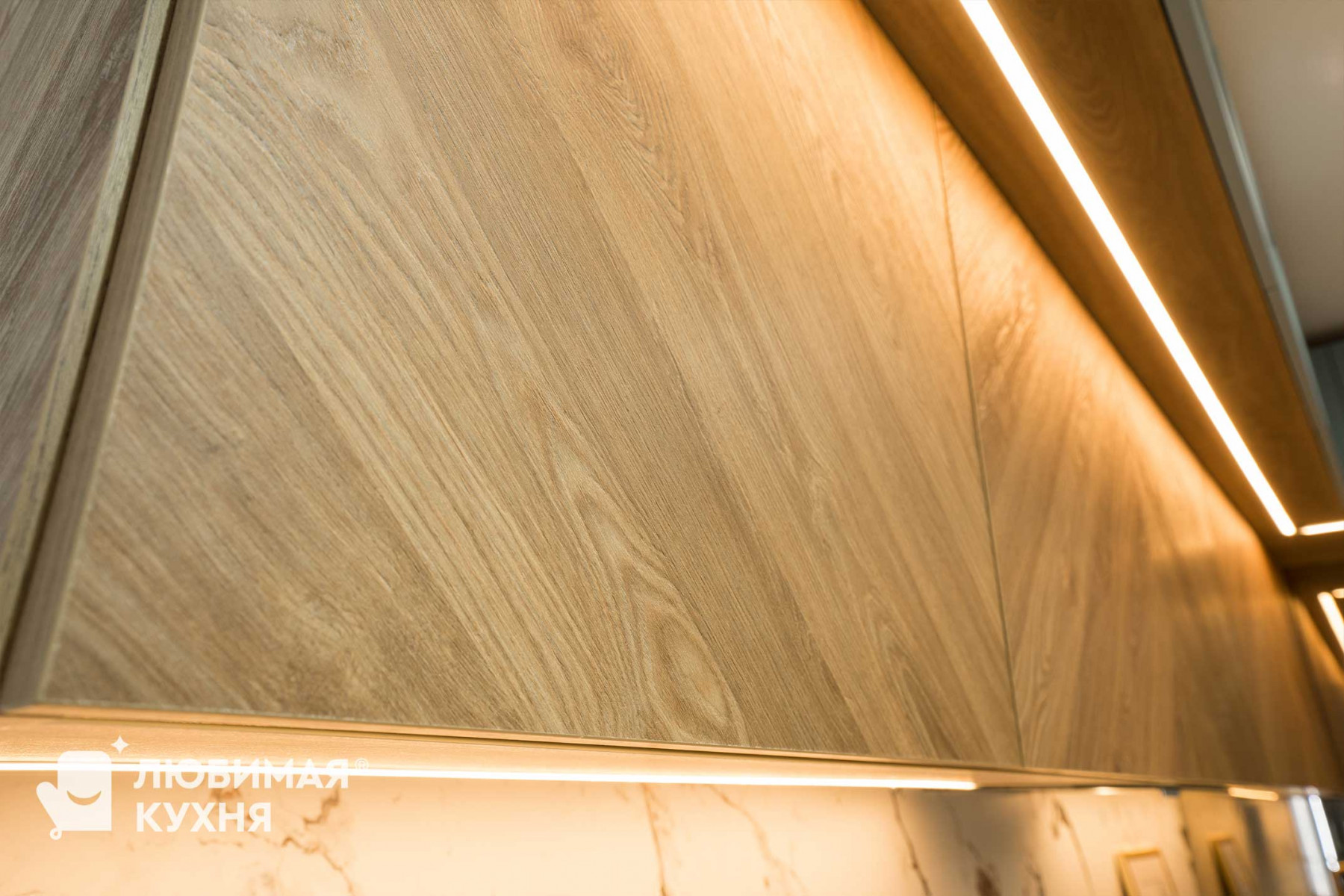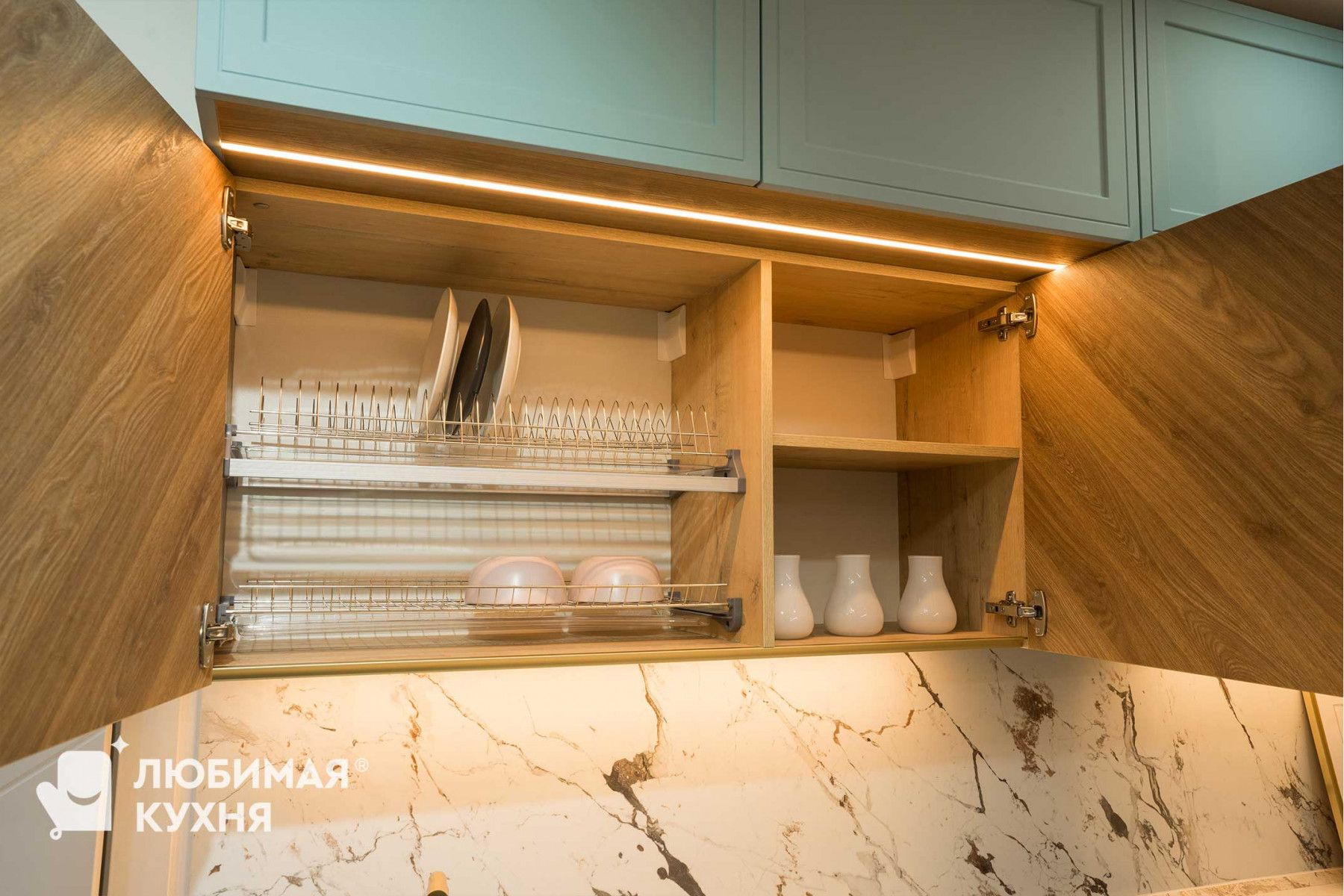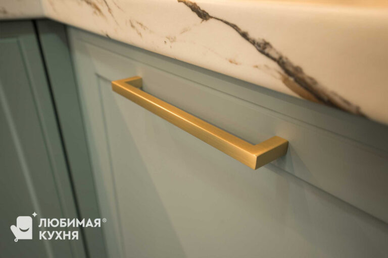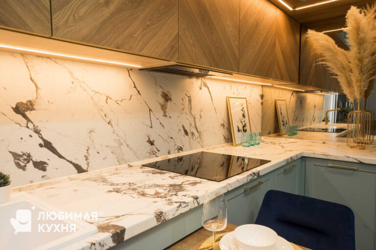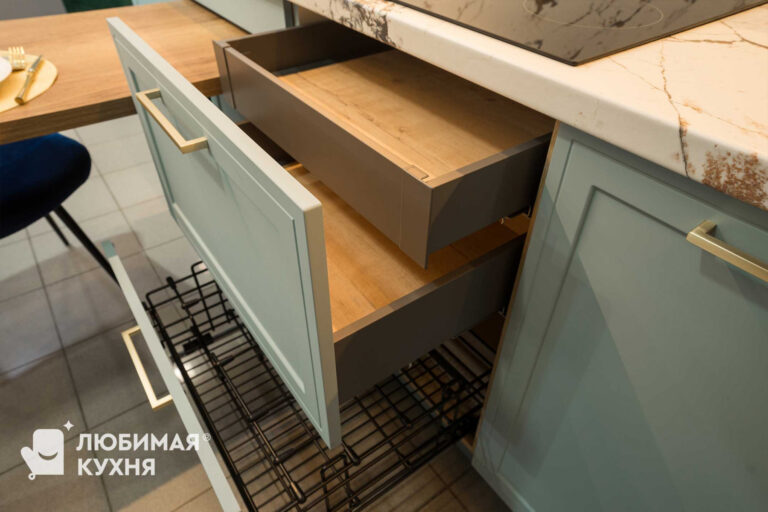Стильная: сочетание цветов и фактур — кусочек чистого моря и леса в доме (нежный голубой цвет, фрезеровка «Шарлот» и ТОПовая выкладка «елочкой» с реалистичной текстурой дерева); золотая элегантная фурнитура, в том числе смеситель с двойным выдвижным изливом для обычной и питьевой воды; гранитная белая мойка как единое целое с белой столешницей.