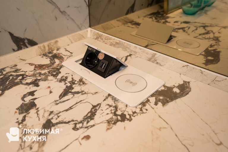 Функциональная: встроенная подсветка отлично справляется с освещением рабочей зоны и задает волшебно-игривое настроение; когда нагрянут гости, стол можно выдвинуть на 60 см!; встроенная «розетка-невидимка» и бесконтактная врезная зарядка для айфона.