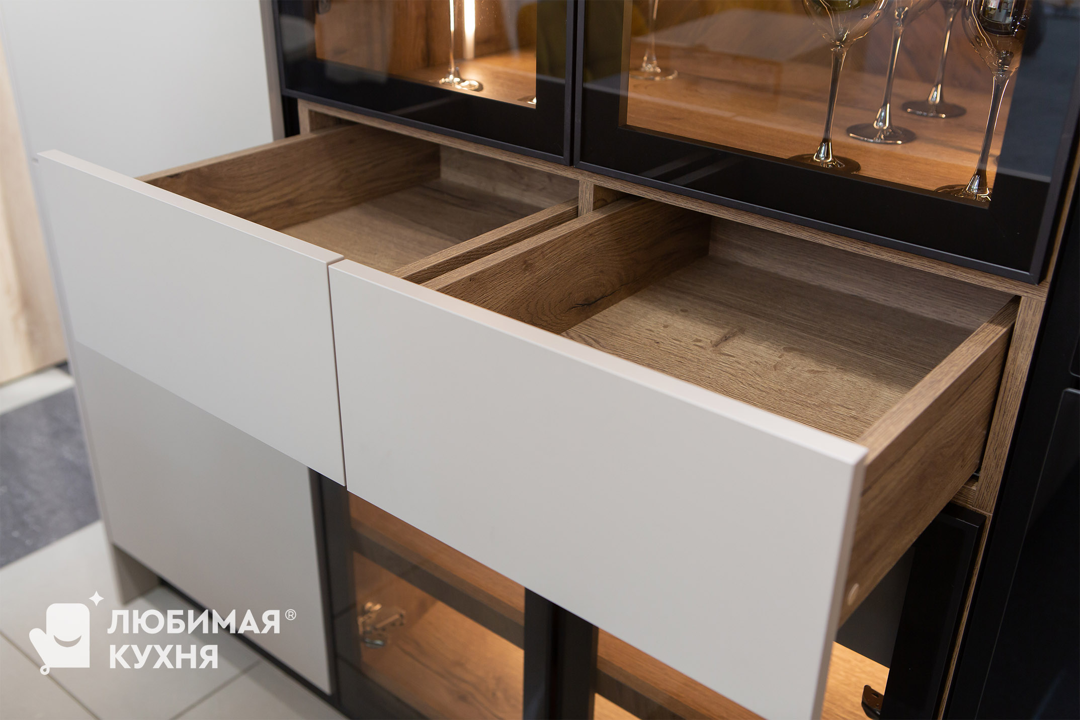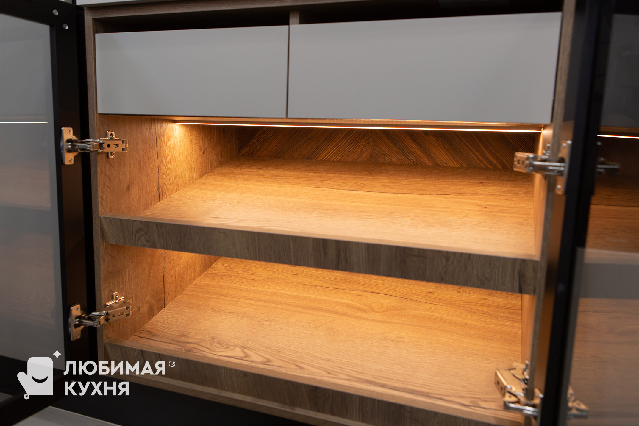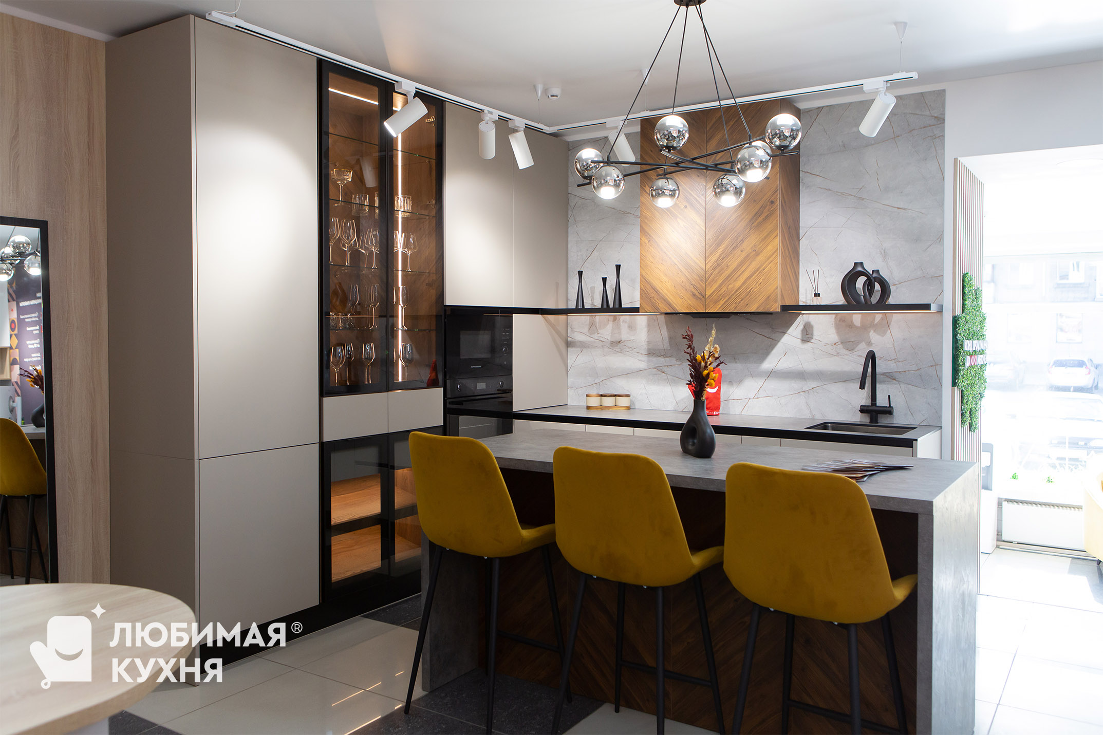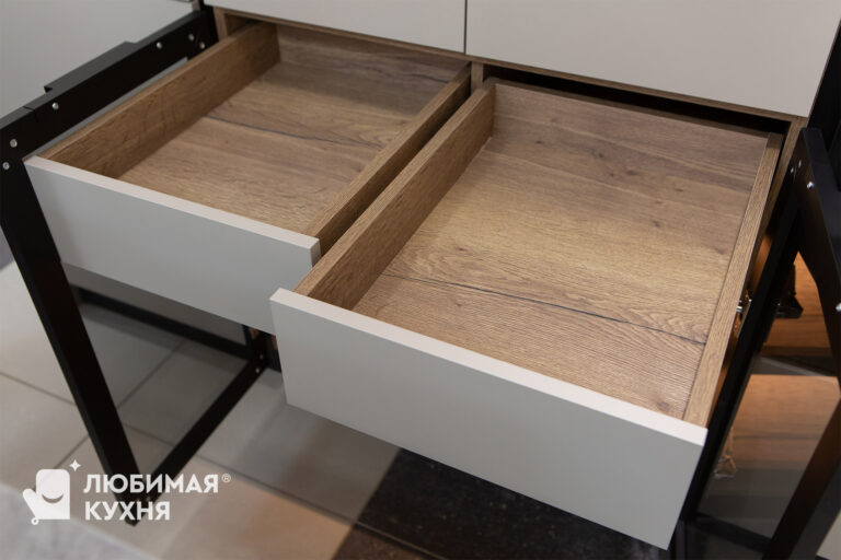 Кухня в сложном темно-бежевом оттенке, воплощение элегантности и функциональности. Натуральное дерево придает теплоту и уют, а алюминиевая рамка со стеклом добавляет современный штрих. Стеклянные элементы создают ощущение легкости и визуально расширяют пространство. Эта кухня — идеальное сочетание практичности, красоты и вместительности, обеспечивающее комфорт в повседневном использовании и эстетическое наслаждение.