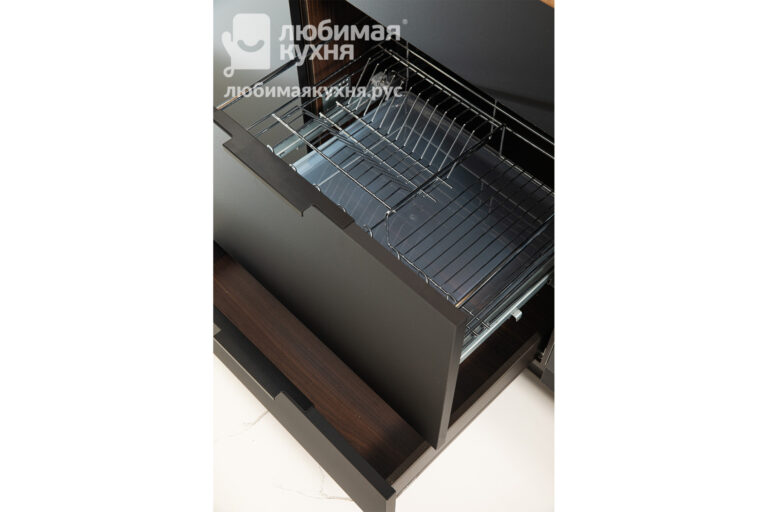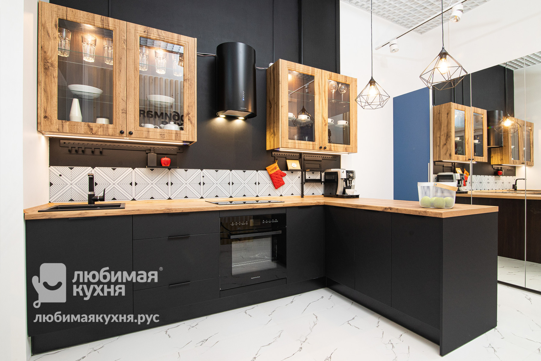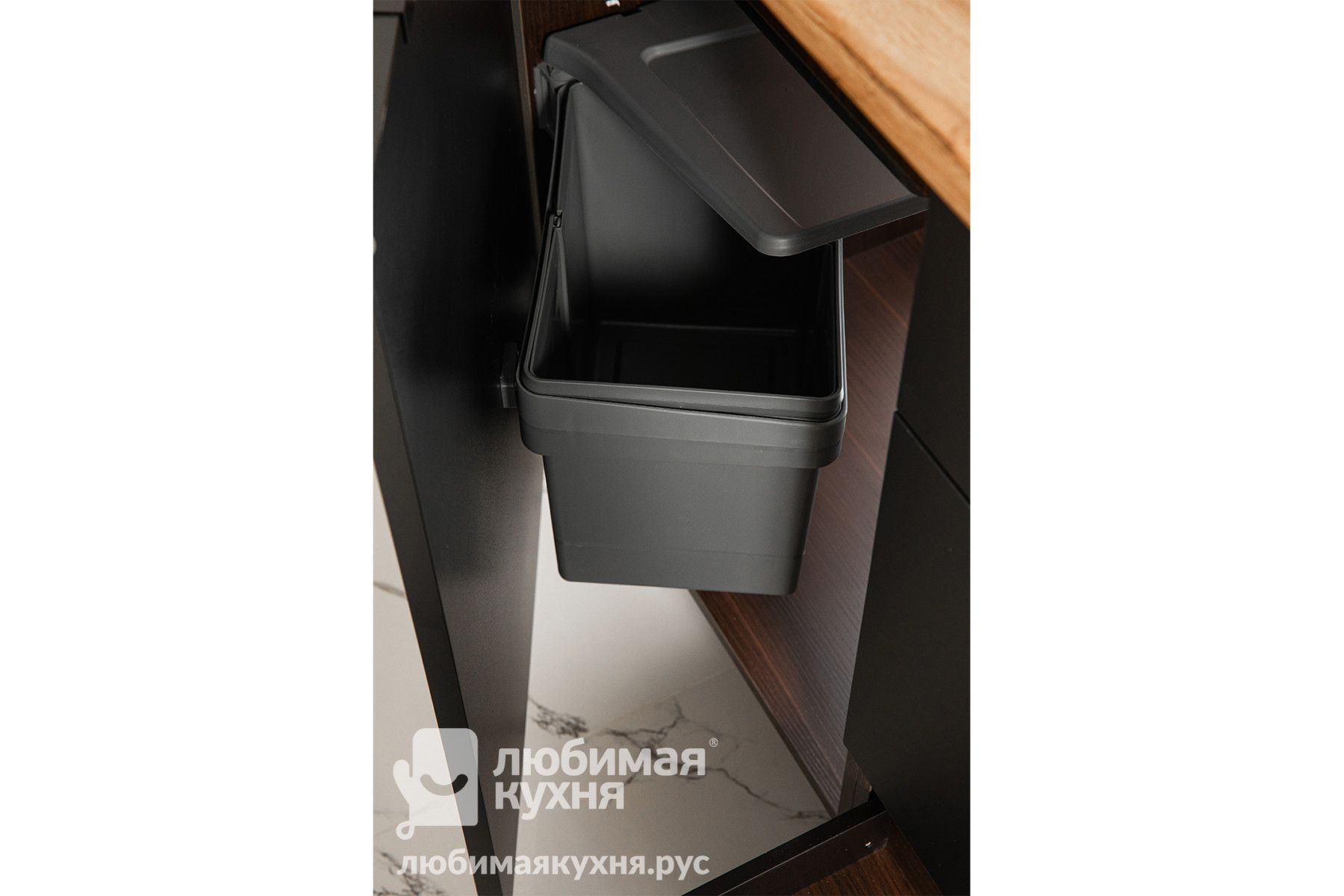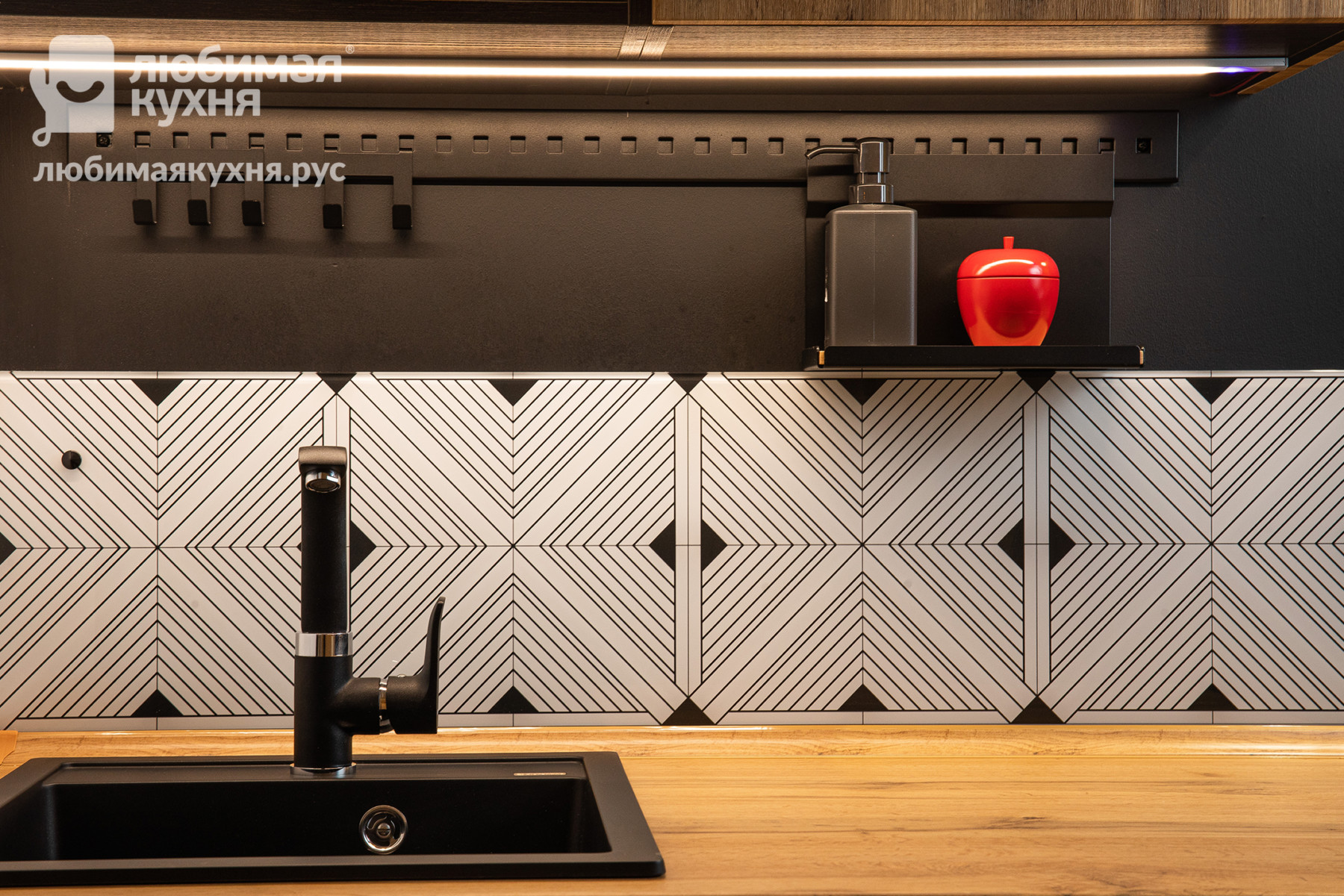 Строгость в сочетании с нотками мягкости и теплоты воплощена в данной модели. Насыщенно темные фасады с теплой древесной структурой выдержаны в модном стиле лофт в сочетании с контрастной геометричной стеновой панелью складываются в единую композицию.