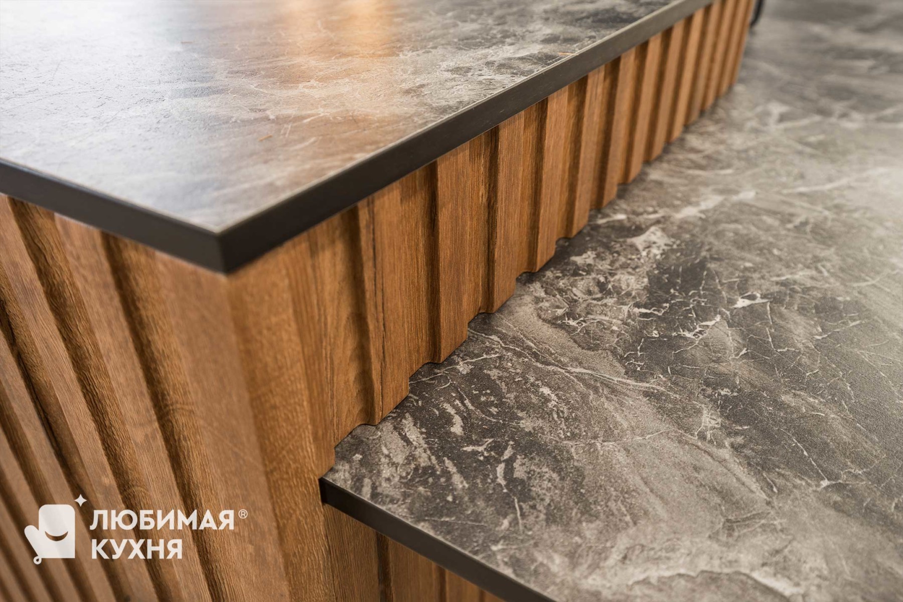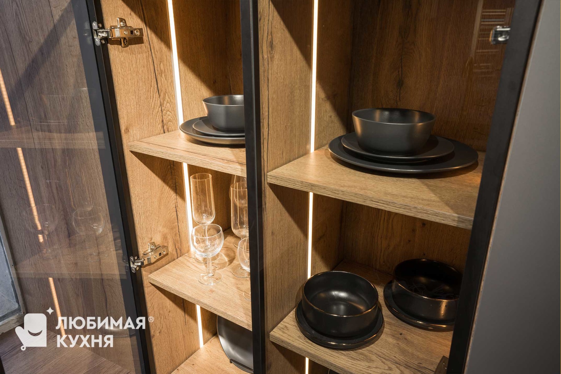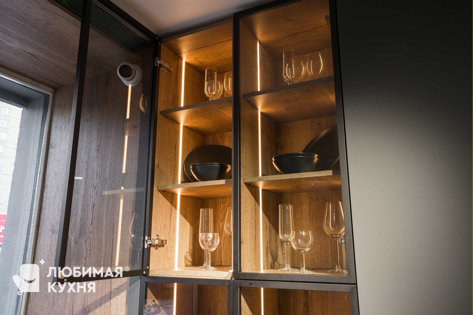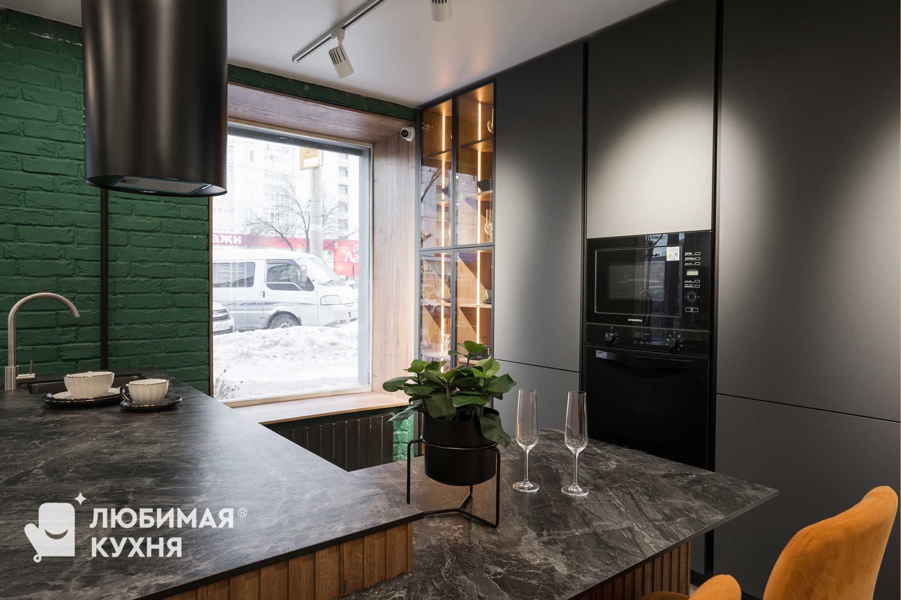 коллекция URBAN , серия Mattelux цвет Черный графит , фасады на острове ТРП Срез дуба темный, фреза Альберо, витрина алюминиевая рамка черная 19мм со стеклом Графит