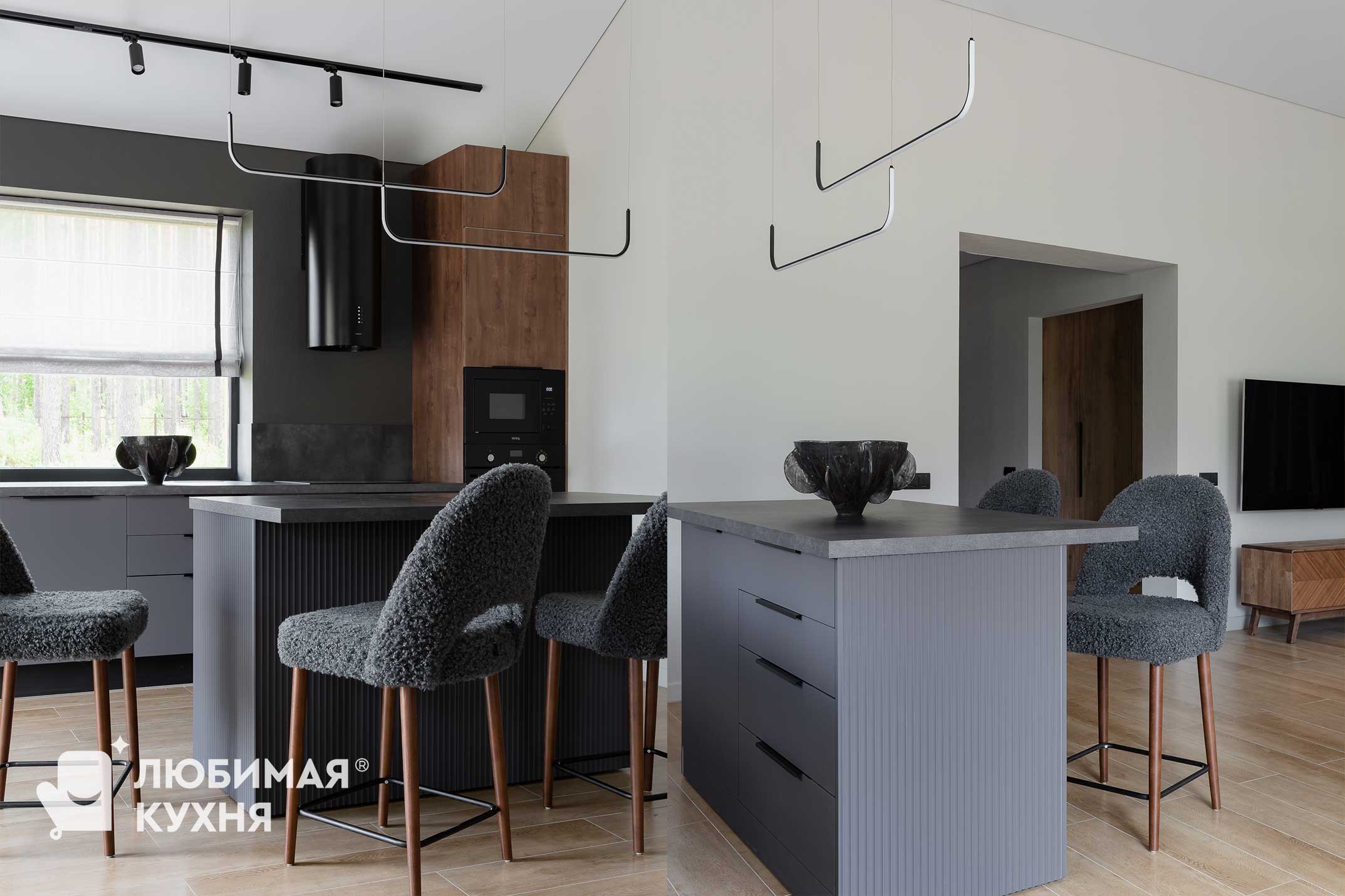 Кухня в современном стиле, отлично вписалась в интерьер загородного дома. Цветовое сочетание серого графита и темного дерева, напоминают природные оттенки. Конфигурация кухни — прямая, что позволяет разместить все необходимое для каждой хозяйки. Остров дополняет композицию и создает дополнительные места для приятного время провождения в кругу семьи на отдыхе.