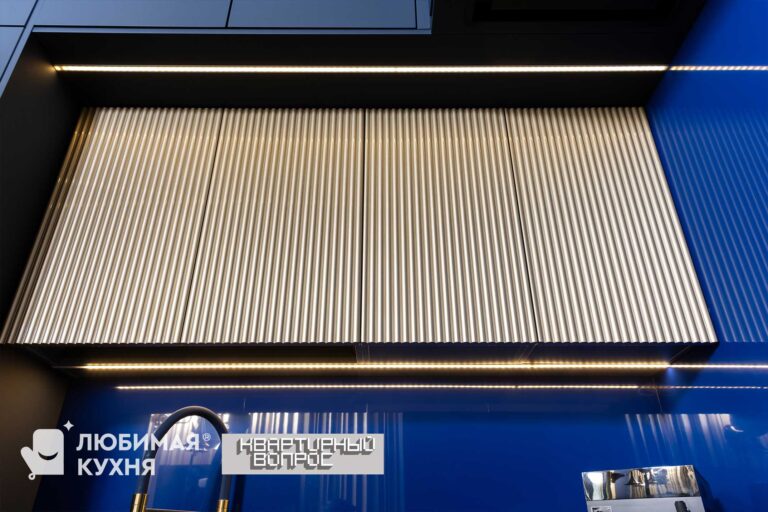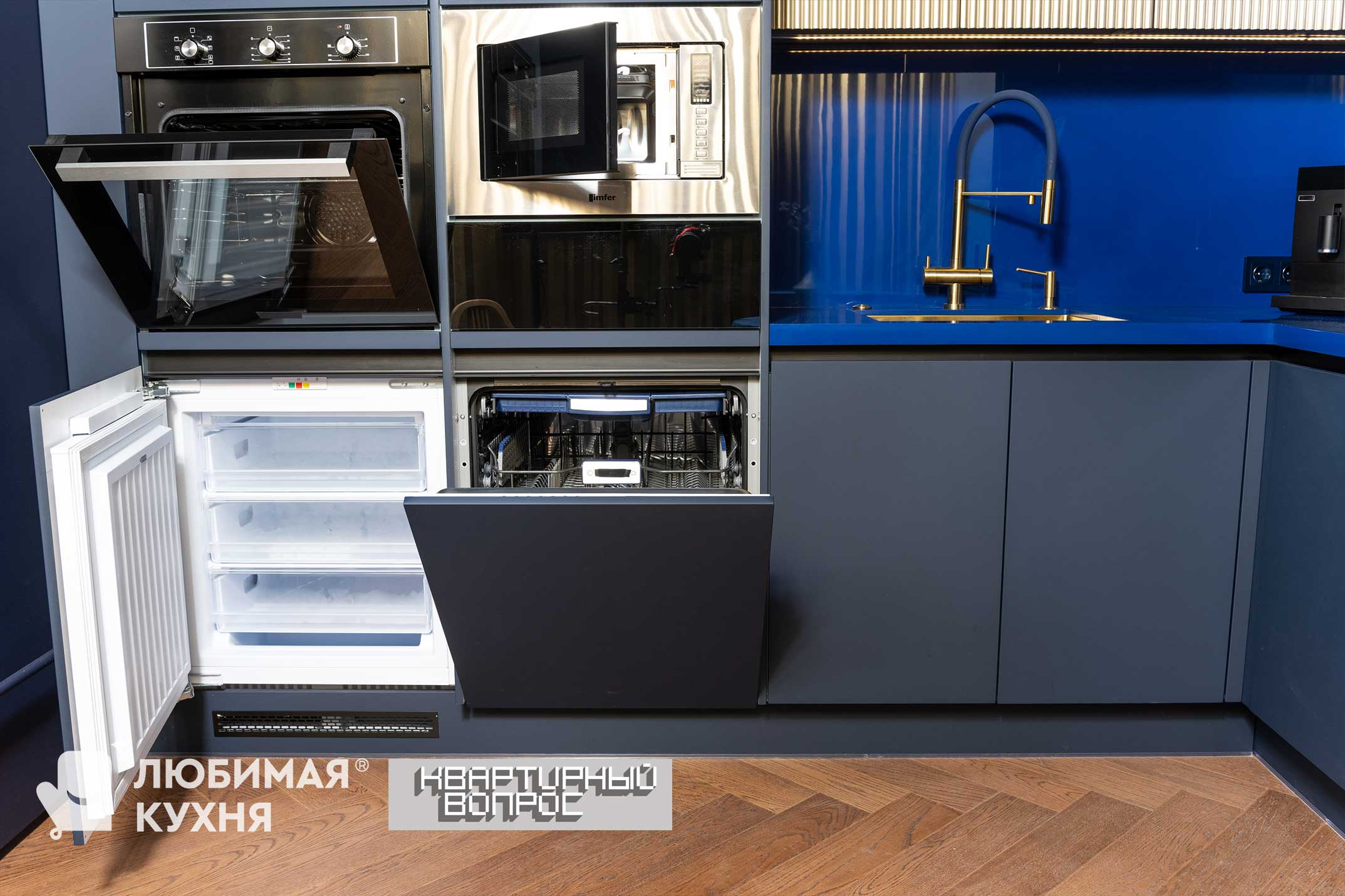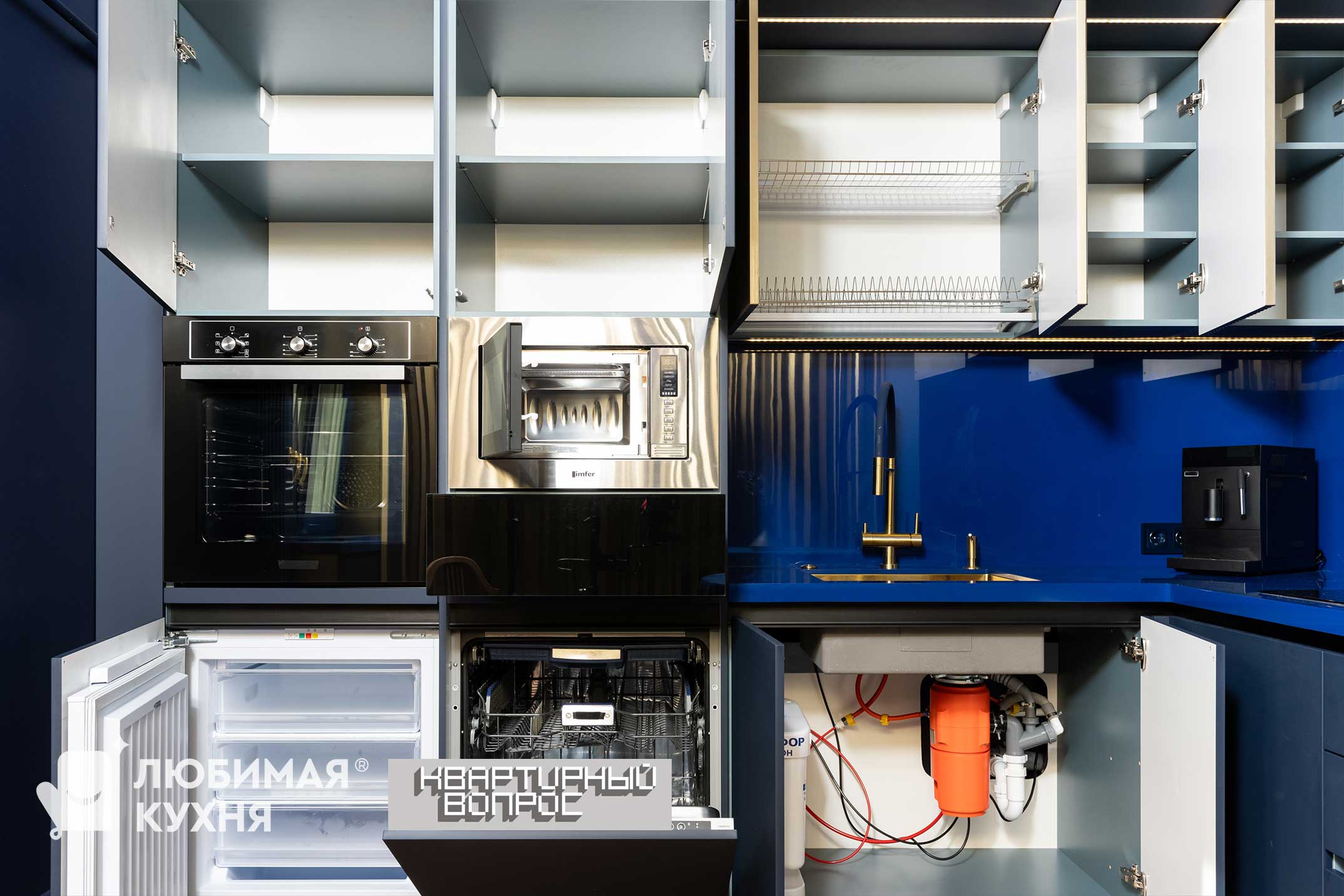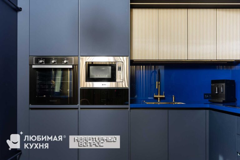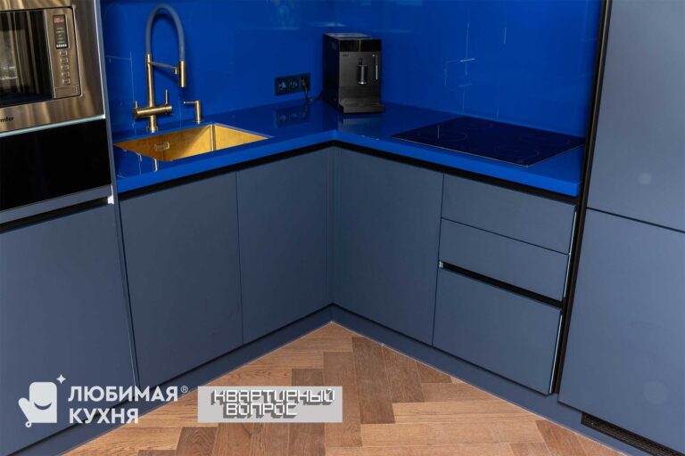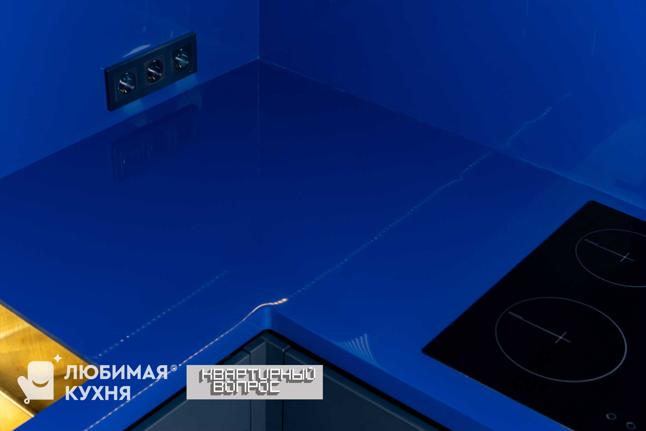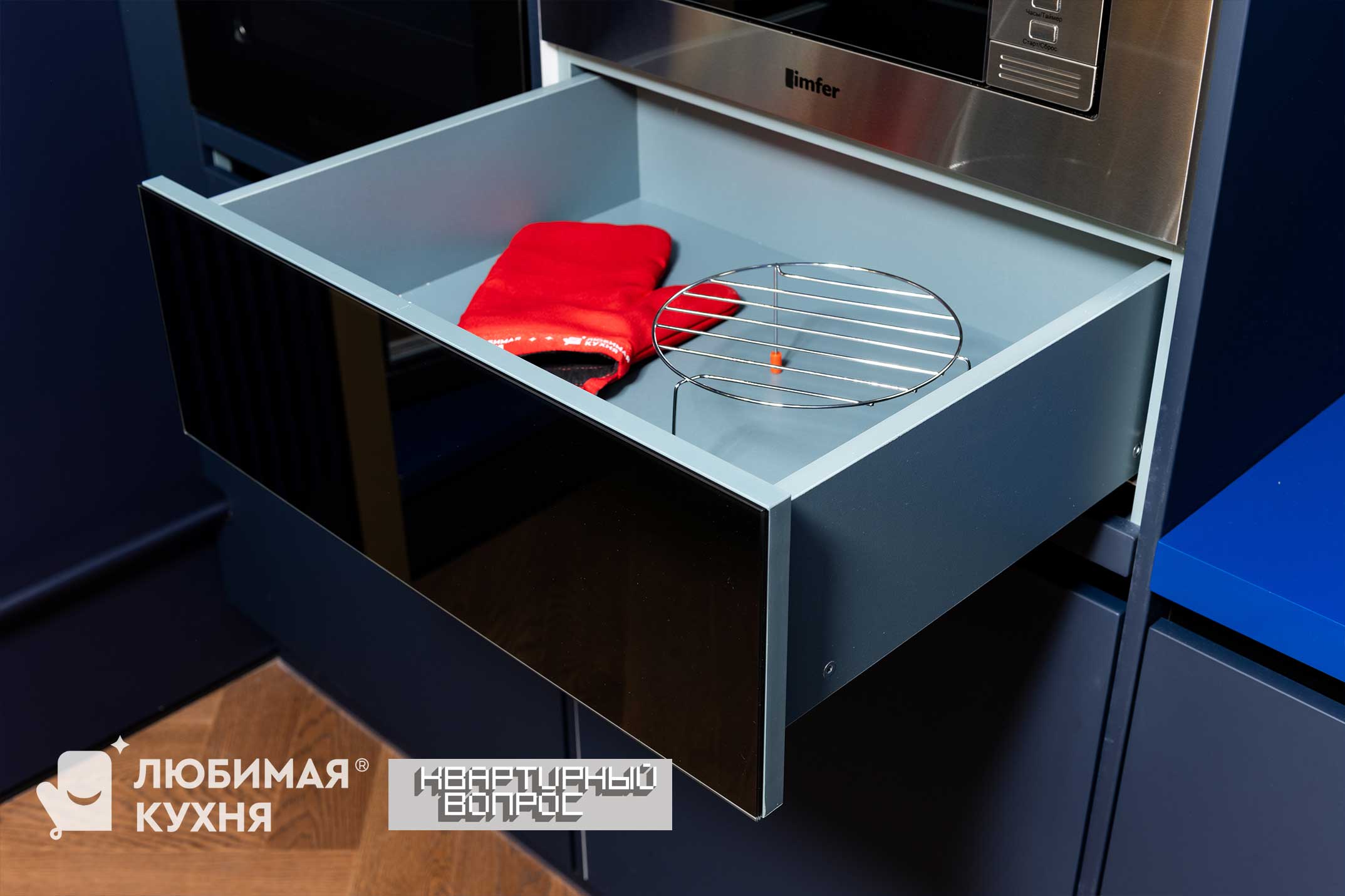 Фасады из термопластика исполнены в богатом темно-синем оттенке с приятной на ощупь шелковистой текстурой. Гарнитур дополняет немецкая фурнитура, поэтому дверцы закрываются плавно и бесшумно, а ящики на доводчиках закрываются легким движением руки. Кроме того, в углу нижней секции установлен выдвижной «волшебный уголок», который позволит нашим героям максимально эффективно использовать это труднодоступное пространство.