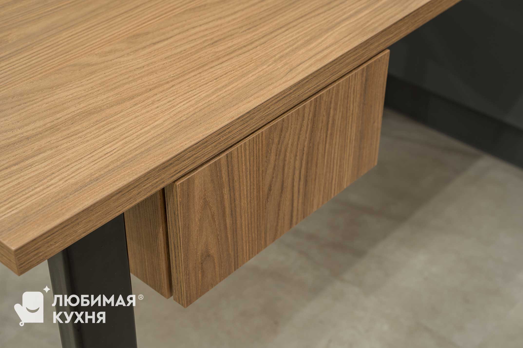 Сдержанная и минималистичная кухня прекрасно впишется как в квартиру, так и в домик за городом. Для данной модели подобраны только самые практичные материалы — фасады кухни облицованы пластиком, который невероятно прост в уходе и способен выдерживать влагу и загрязнения. Верх кухни облегченный — полки из металлического профиля сохраняют функциональность и сохраняют воздушность. А так же в кухне предусмотрены пенал для встроенного холодильника и интегрированный обеденный стол, что очень удобно для пространств с ограниченной площадью.