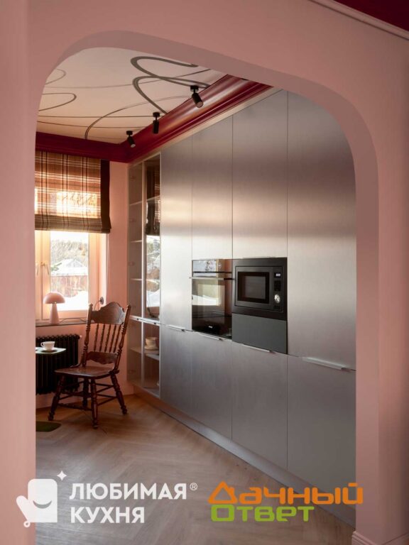 Стену напротив займут высокие пеналы. Их корпуса – из ДСП с ламинацией «Серебро чукотское дымчатое». Один из пеналов дополняем стеклянными распашными дверцами в алюминиевых рамках. Остальные фасады тут – металлизированные, из коллекции Scalar. Декор – Satin Silver. Все панели для мебели сделаны в Санкт-Петербурге.
