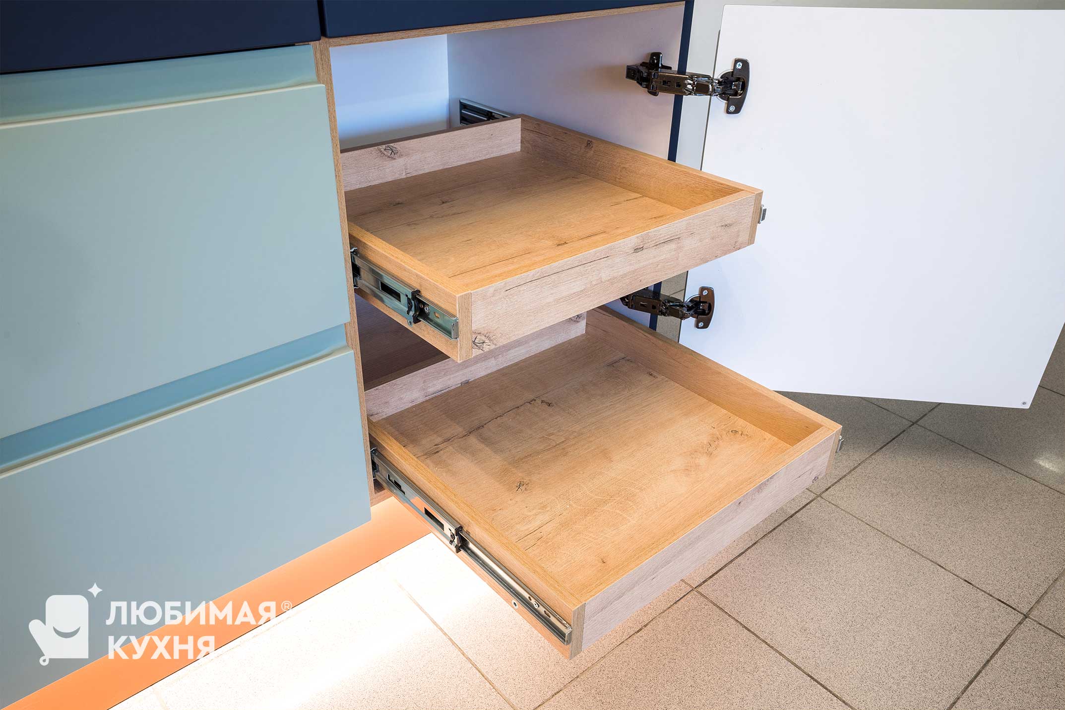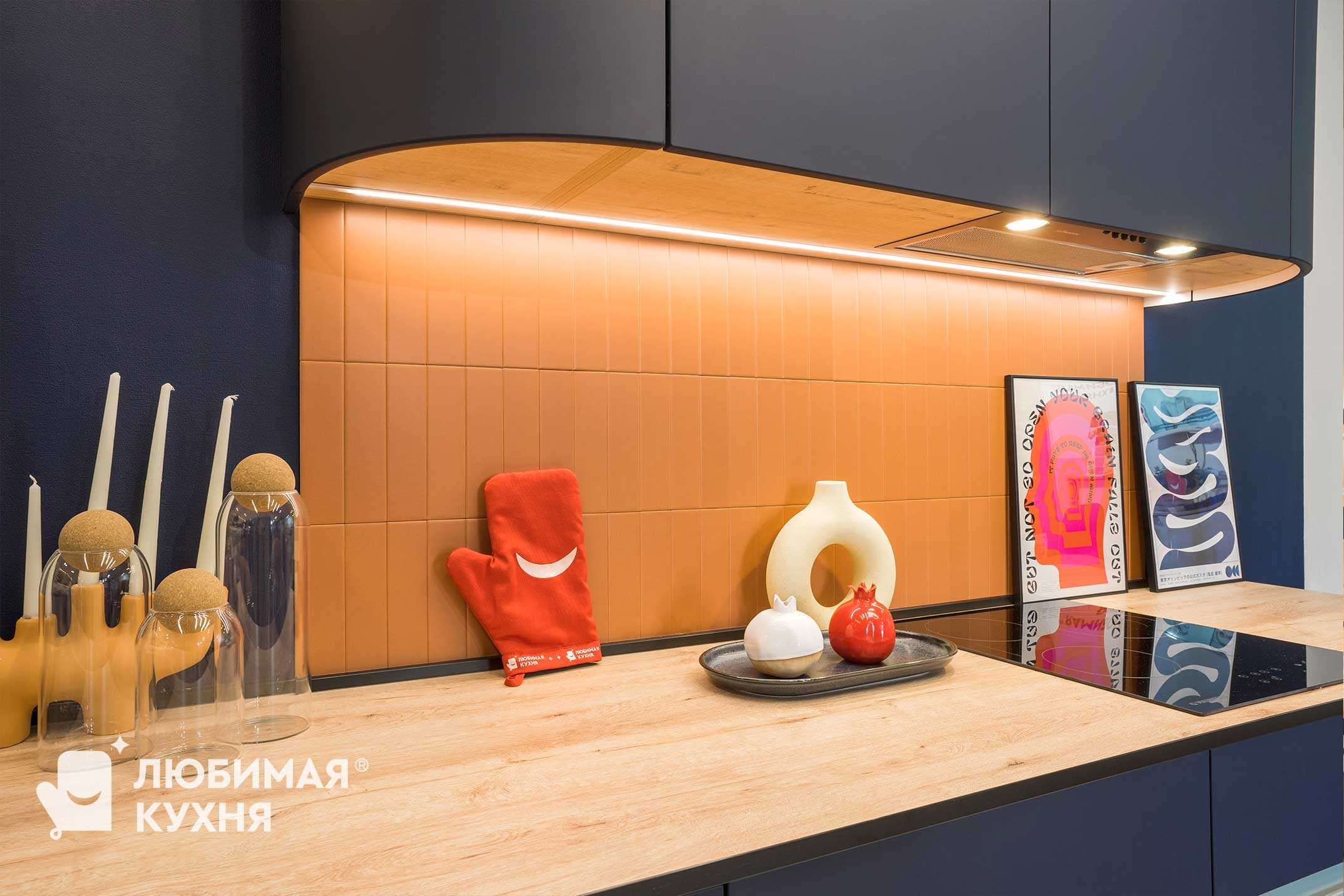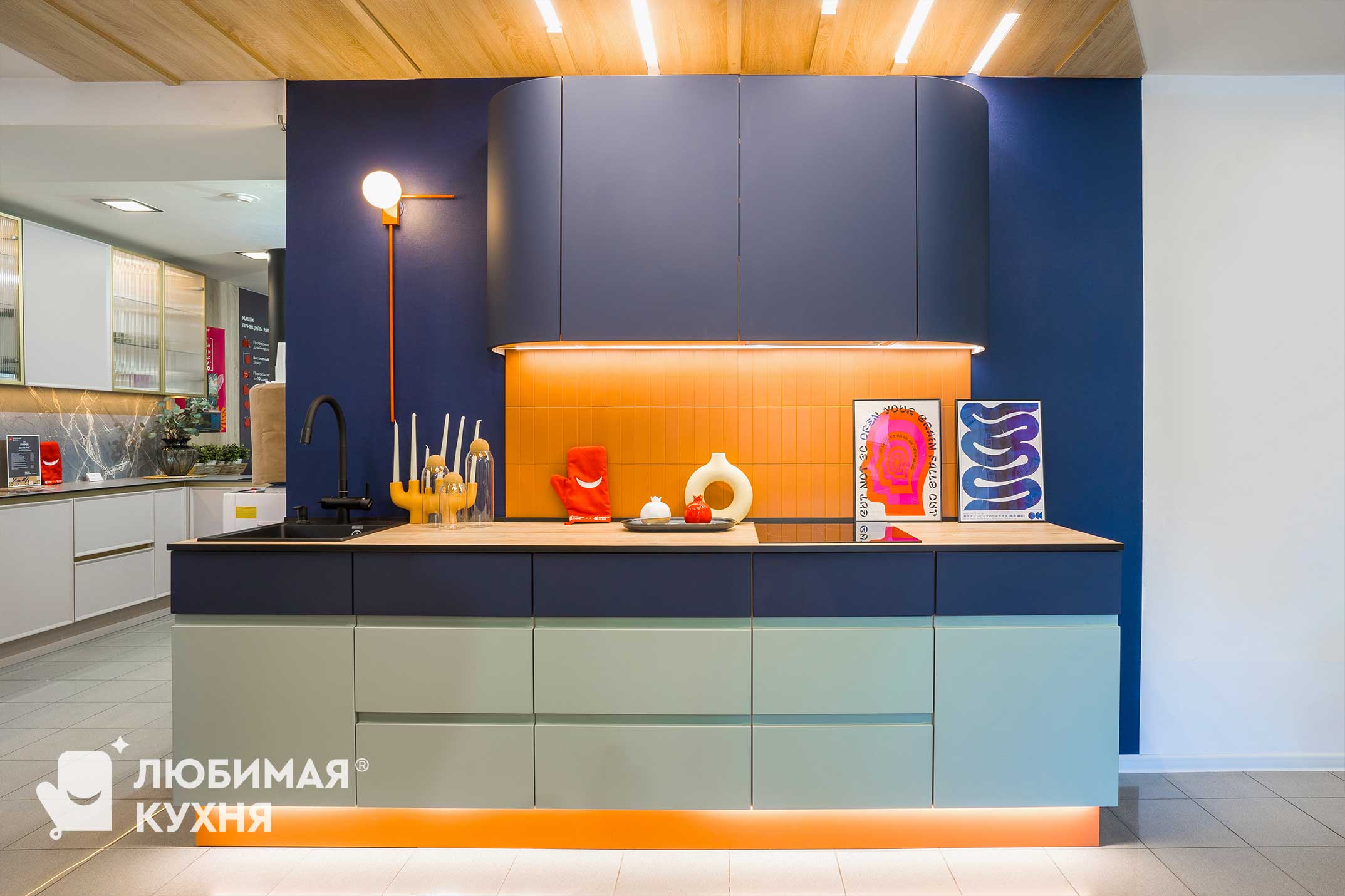 Кухня с невероятным сочетанием зеленого с синими и терракотовыми вставками представляет собой современное и креативное пространство. Скругленные углы в пространстве интерьера создают более гармоничную обстановку и способны снимать напряжение и успокаивать. Каждый день, проведенный на этой кухне, наполняет вас энергией и вдохновением, позволяя создавать кулинарные шедевры.