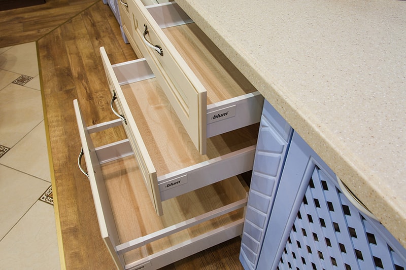 Нежная кухня, исполненная в бежевом и светло-голубом тонах придется по душе любой хозяйке. Бронзовые ручки, резные дверцы шкафчиков и их изящная форма придают гарнитуру легкость и воздушность.