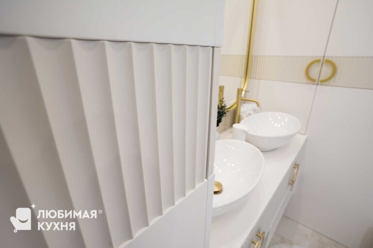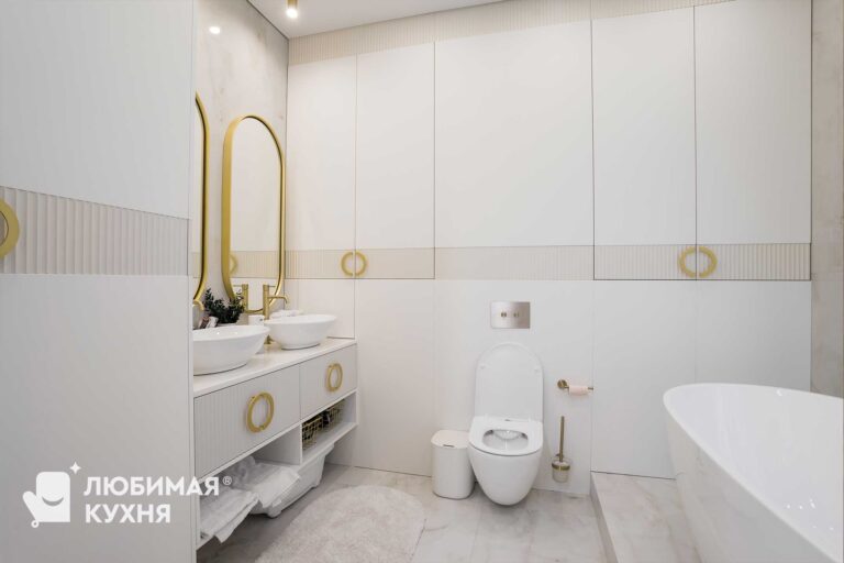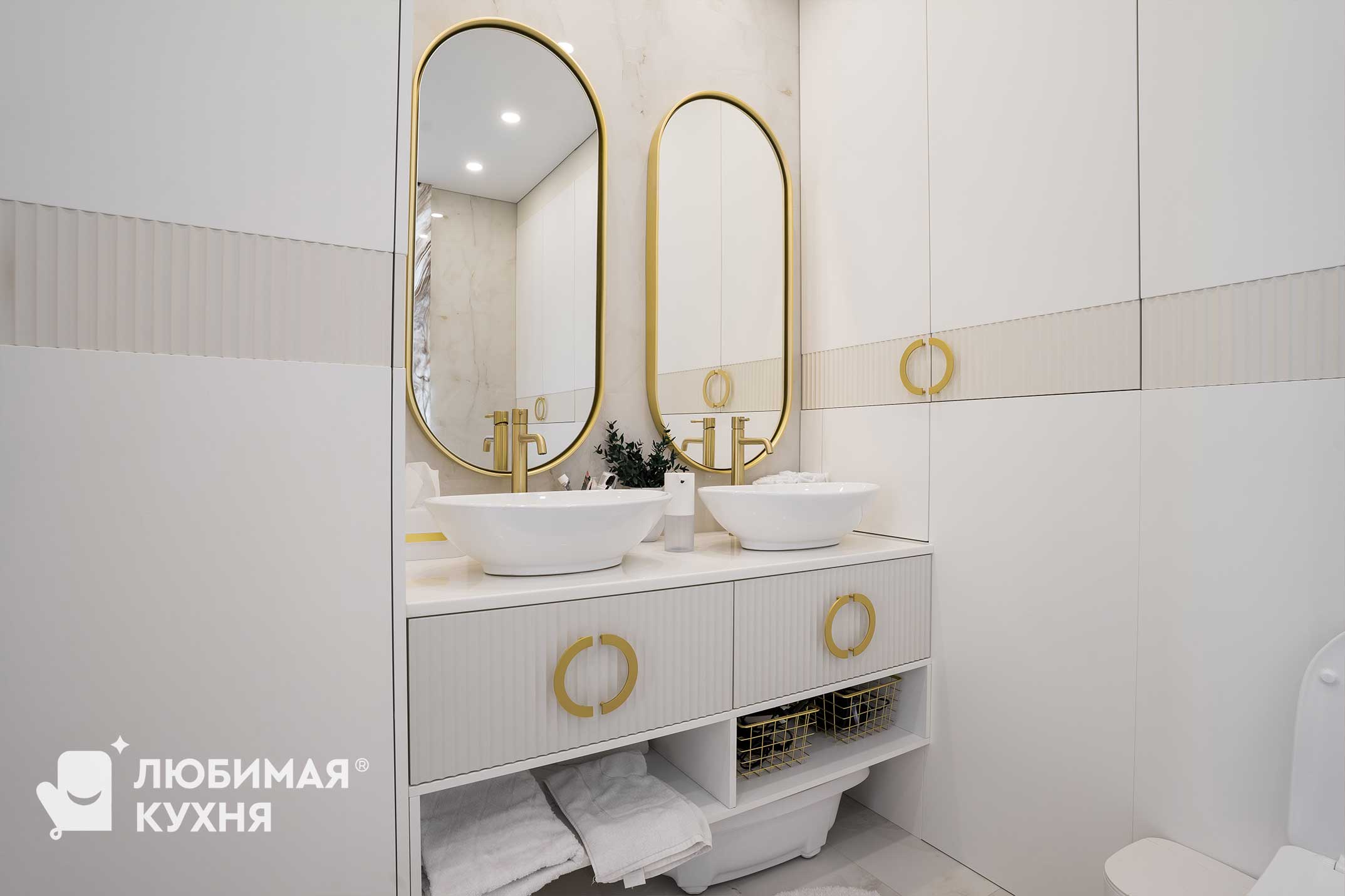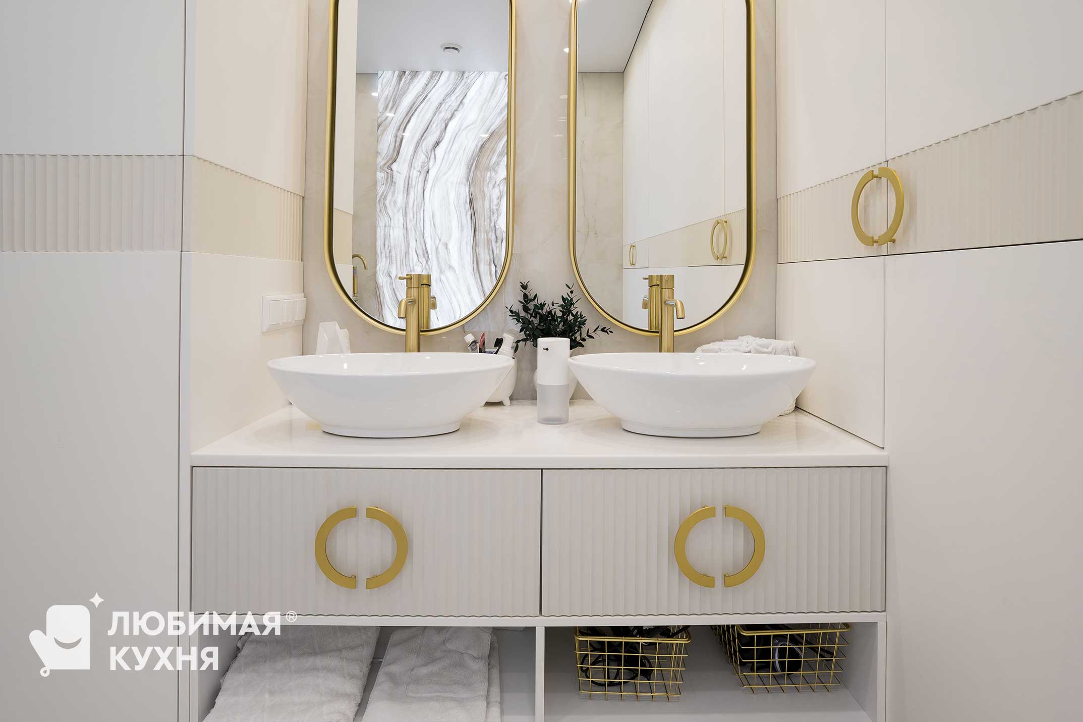 Нежный и светлый санузел в бежевых тонах с золотистыми акцентами. Большая тумба с двумя раковинами с рифлеными фасадами и полкой, где можно расположить полотенца. Встроенные колонны вмещают все необходимое, инсталляция так же облицована фасадами в цвет шкафов, что создает единое локаничное пространство. Фасады имеет интересную акцентную вставку в виде рифленого фасада.