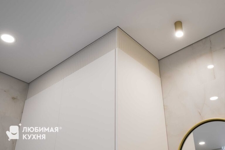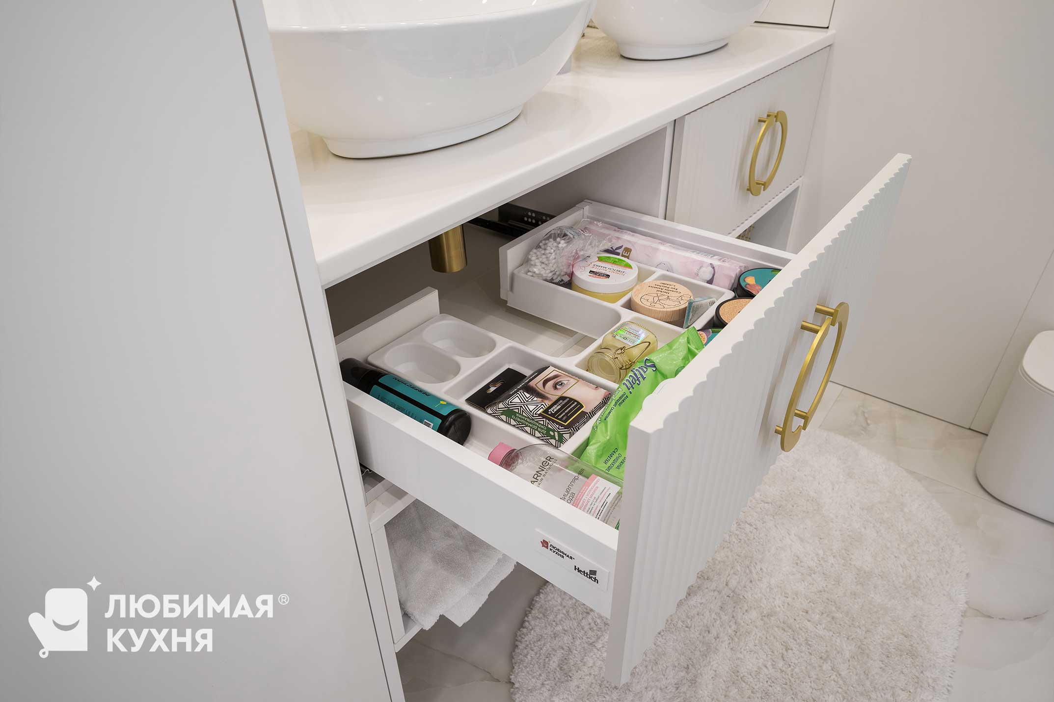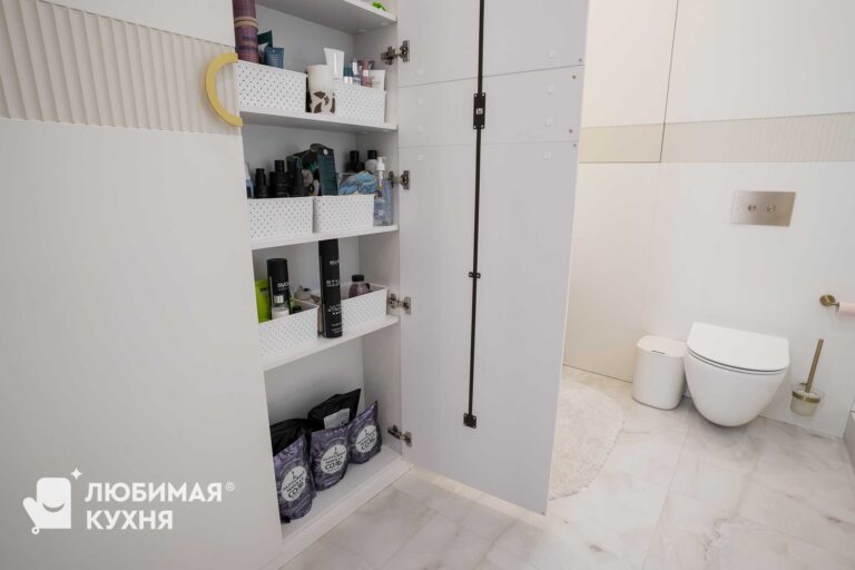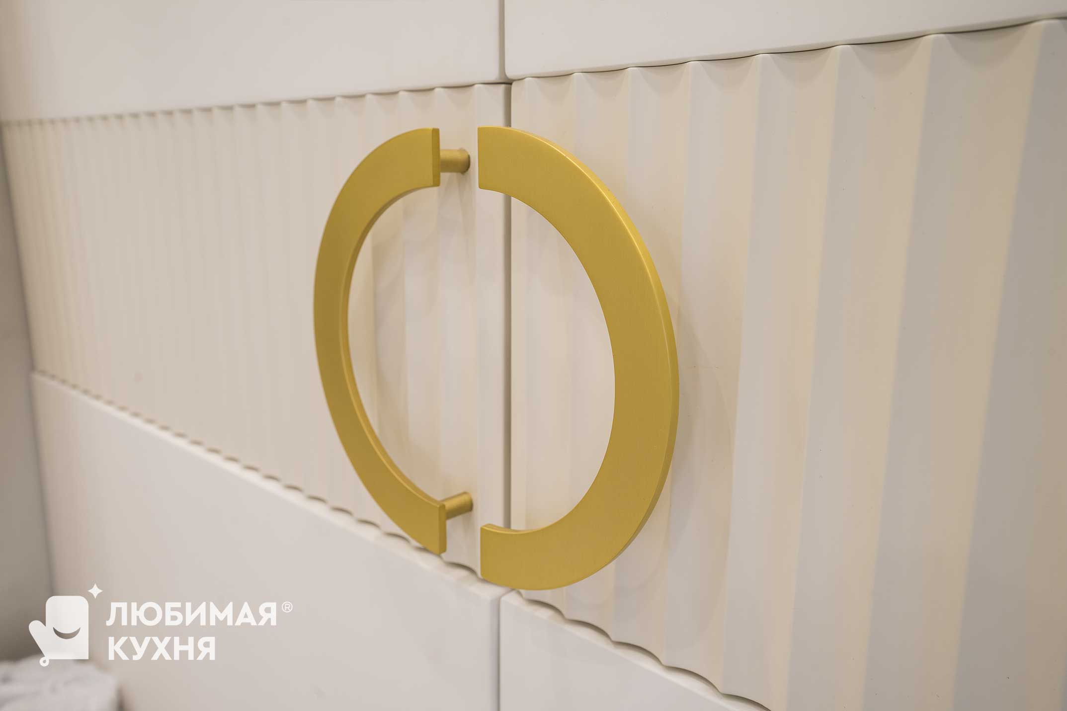 Нежный и светлый санузел в бежевых тонах с золотистыми акцентами. Большая тумба с двумя раковинами с рифлеными фасадами и полкой, где можно расположить полотенца. Встроенные колонны вмещают все необходимое, инсталляция так же облицована фасадами в цвет шкафов, что создает единое локаничное пространство. Фасады имеет интересную акцентную вставку в виде рифленого фасада.