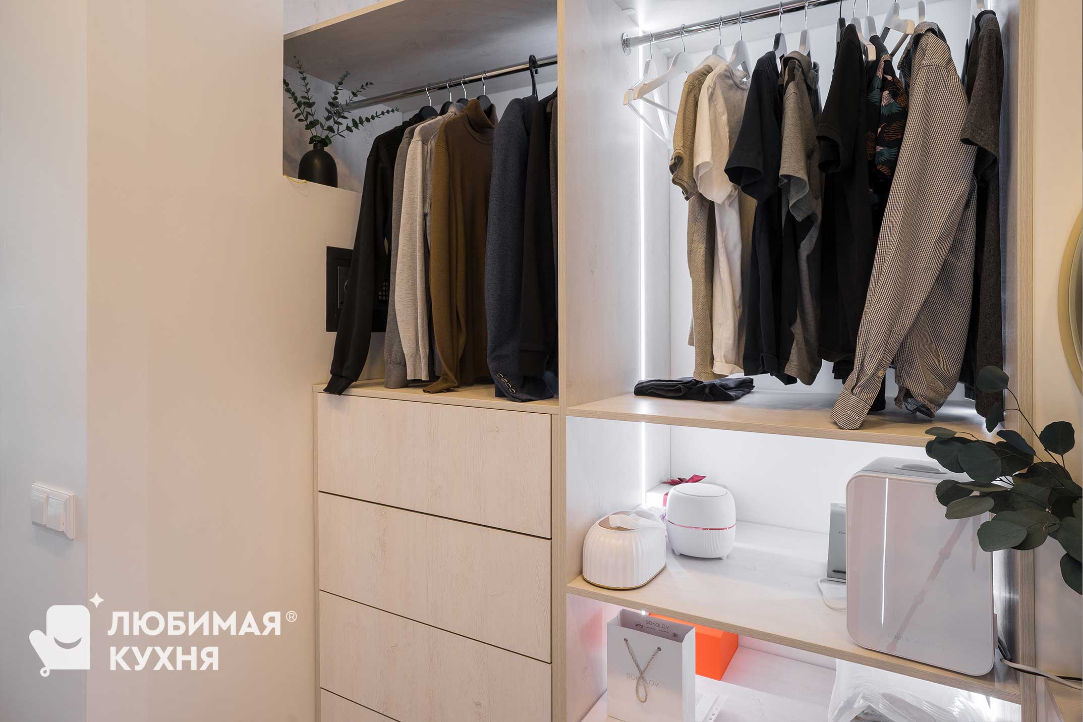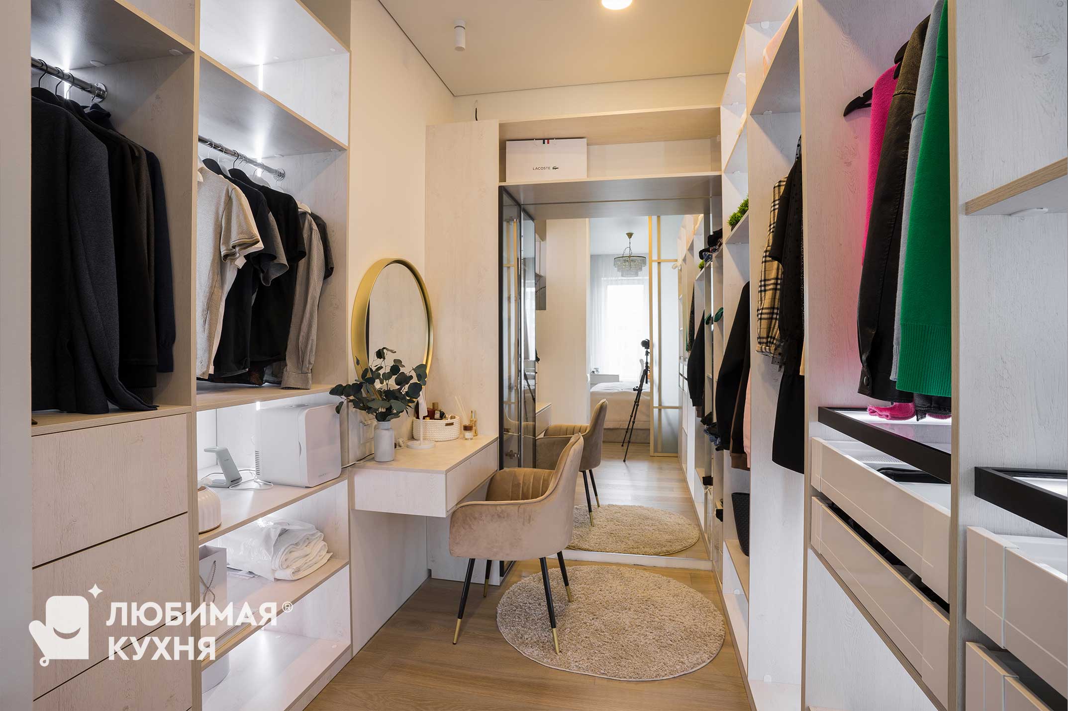 Светлая гардеробная с туалетным столиком — мечта каждой женщины! Лдсп в светлом оттенке с ненавязчивой древесной текстурой визуально расширяет пространство, что очень актуально для небольших помещений. Грамотная планировка позволяет расходовать пространство с максимальной пользой и функциональностью.