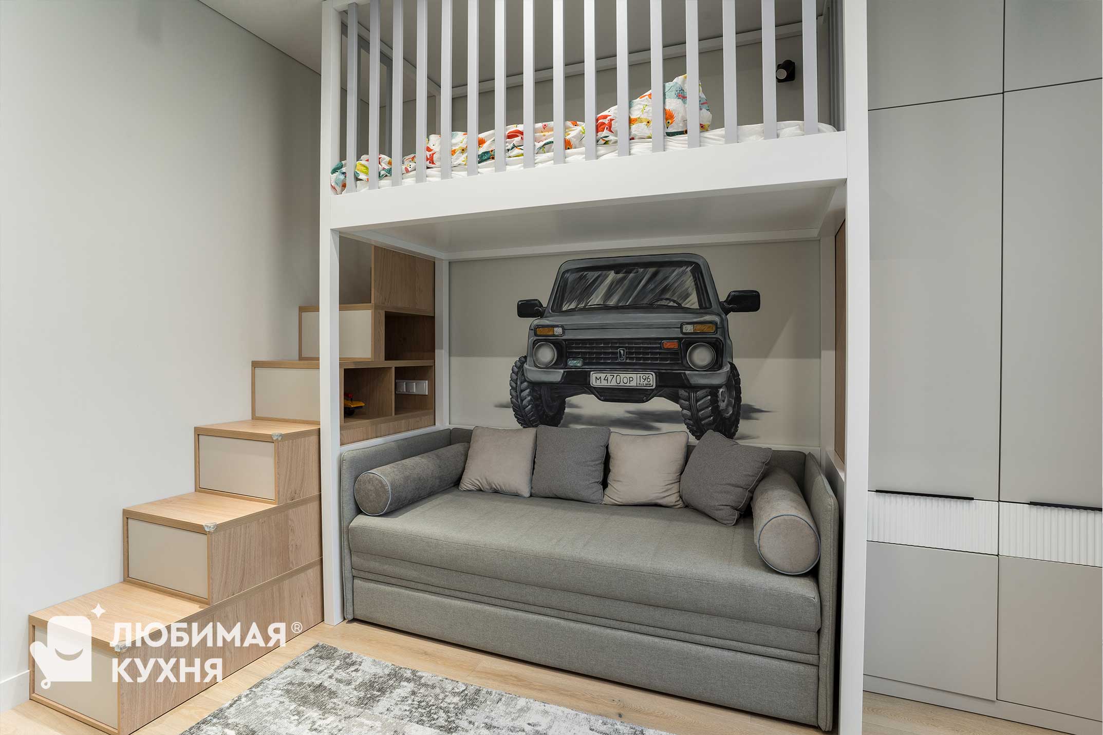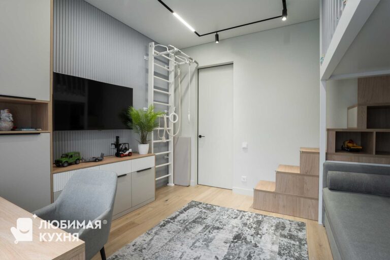 Современная детская комната с минималистичным дизайном для мальчика. Стол из светлого дерева и имеет гладкую поверхность. Вдоль стены расположен встроенный шкаф в коричнево-бежевых тонах, которые обеспечивают дополнительное пространство для хранения вещей книг и игрушек. Над столом расположены полки, что позволяет удобно задействовать пространство возле стола. В комнате продумано много мест для хранения, по бокам от кровати расположился шкаф для одежды, лестница так же оснащена выдвижными ящиками для хранения.