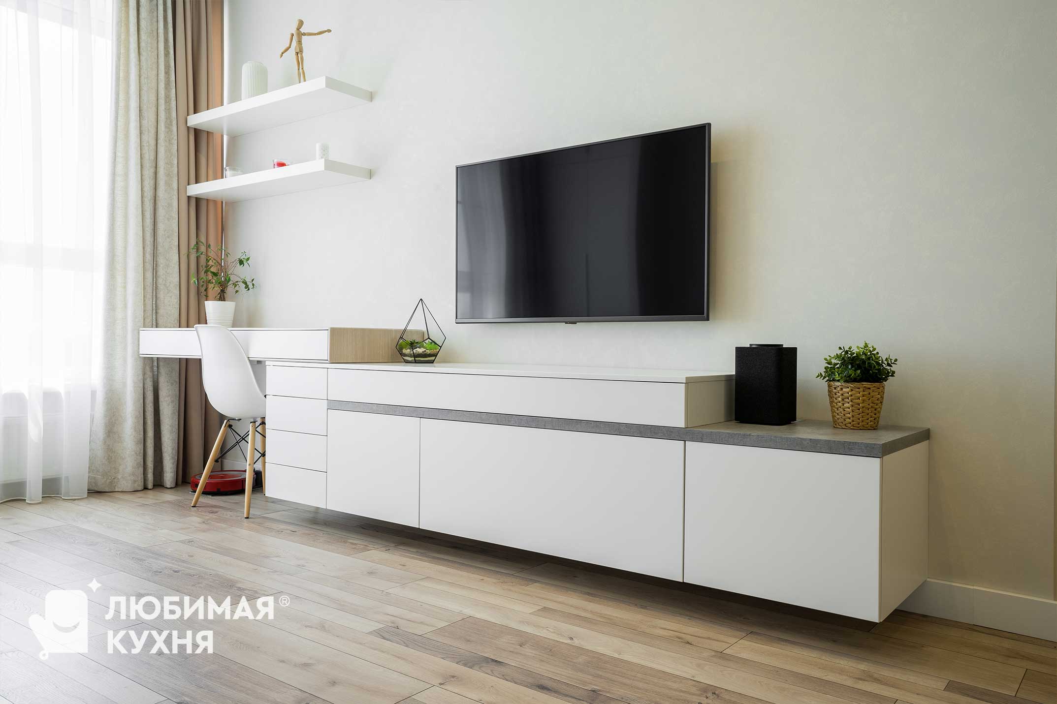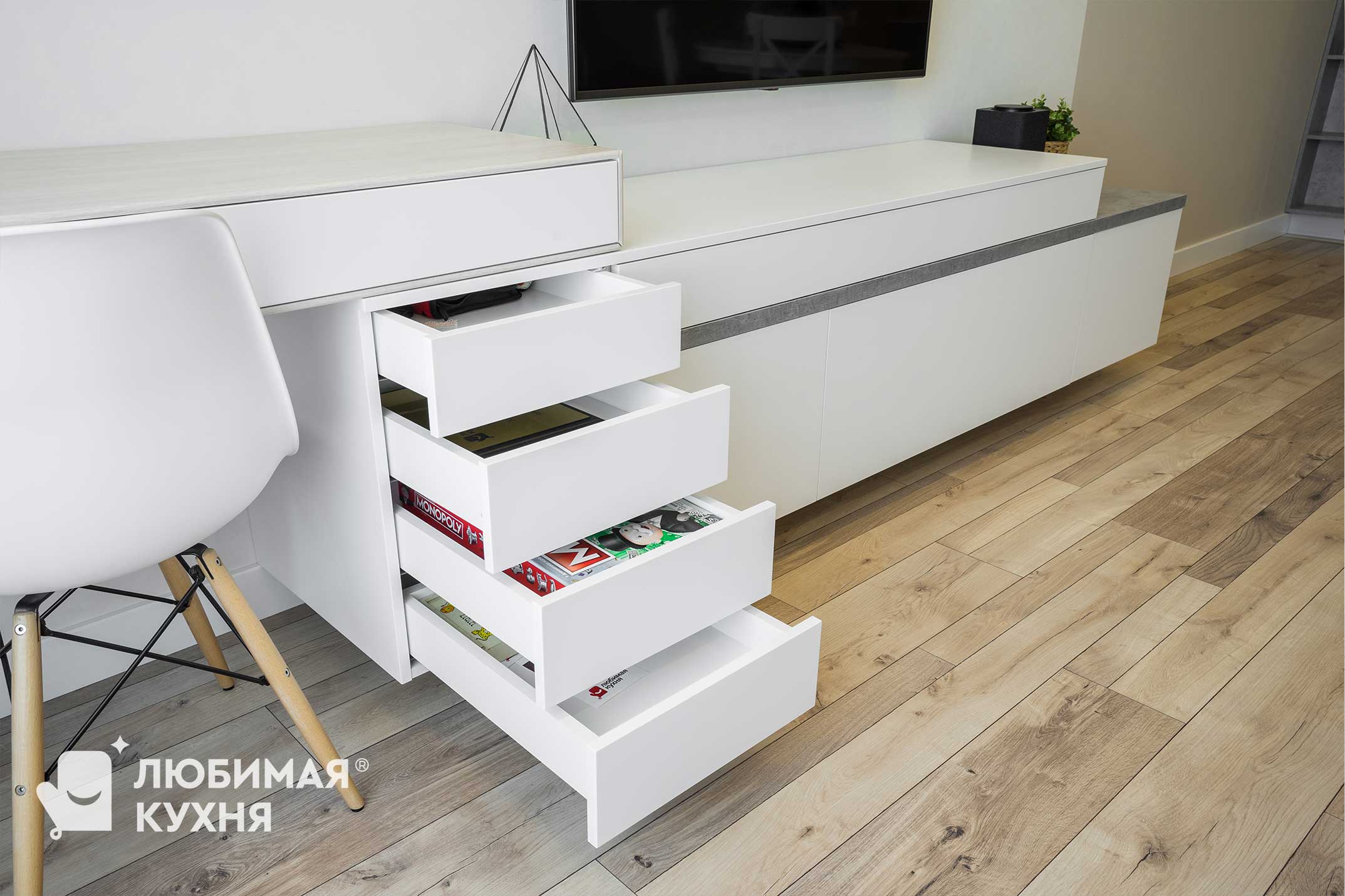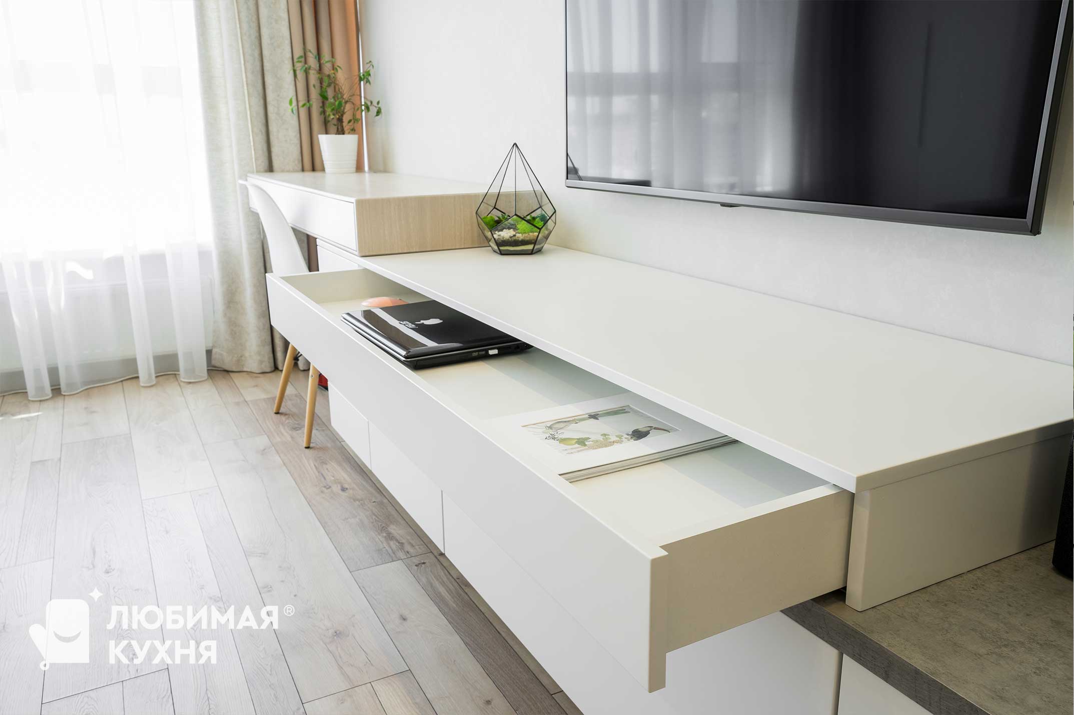 Многофункциональная Тв тумба с письменный столом. Необычный дизайн тумбы позволил расположить шкафчики для хранения под ТВ, ящики для письменного стола, стол с выдвижным ящиком. Интересное и нестандартное решение, для хоум-офиса