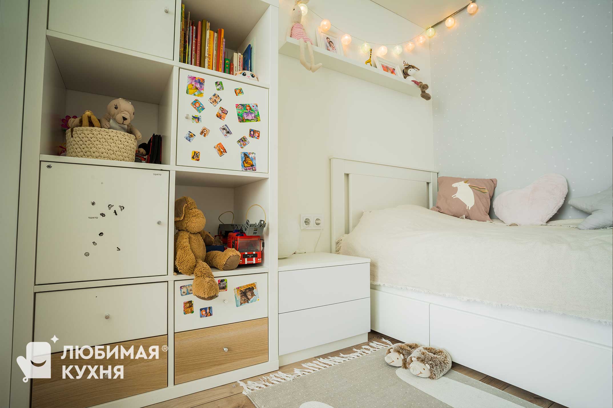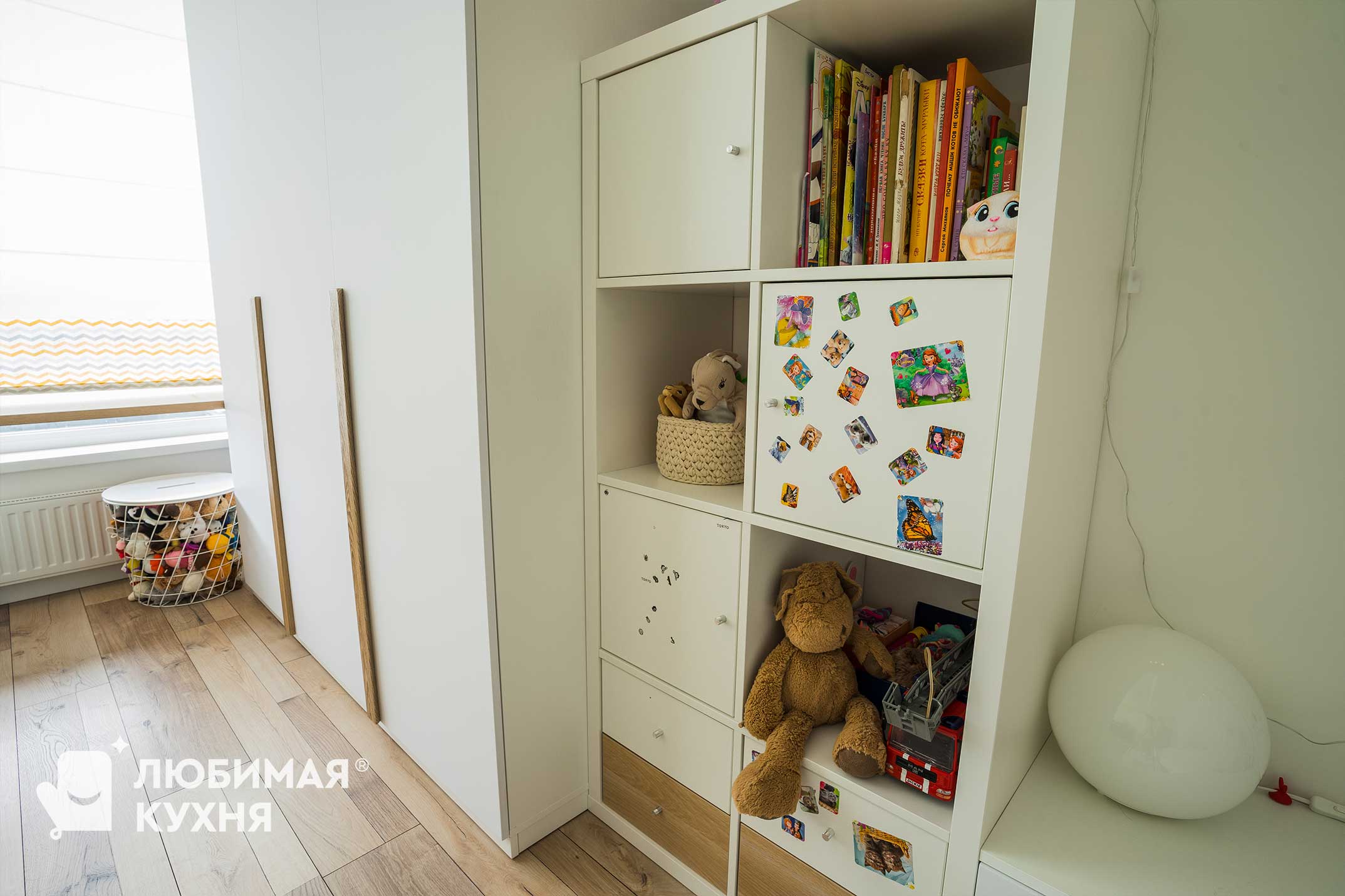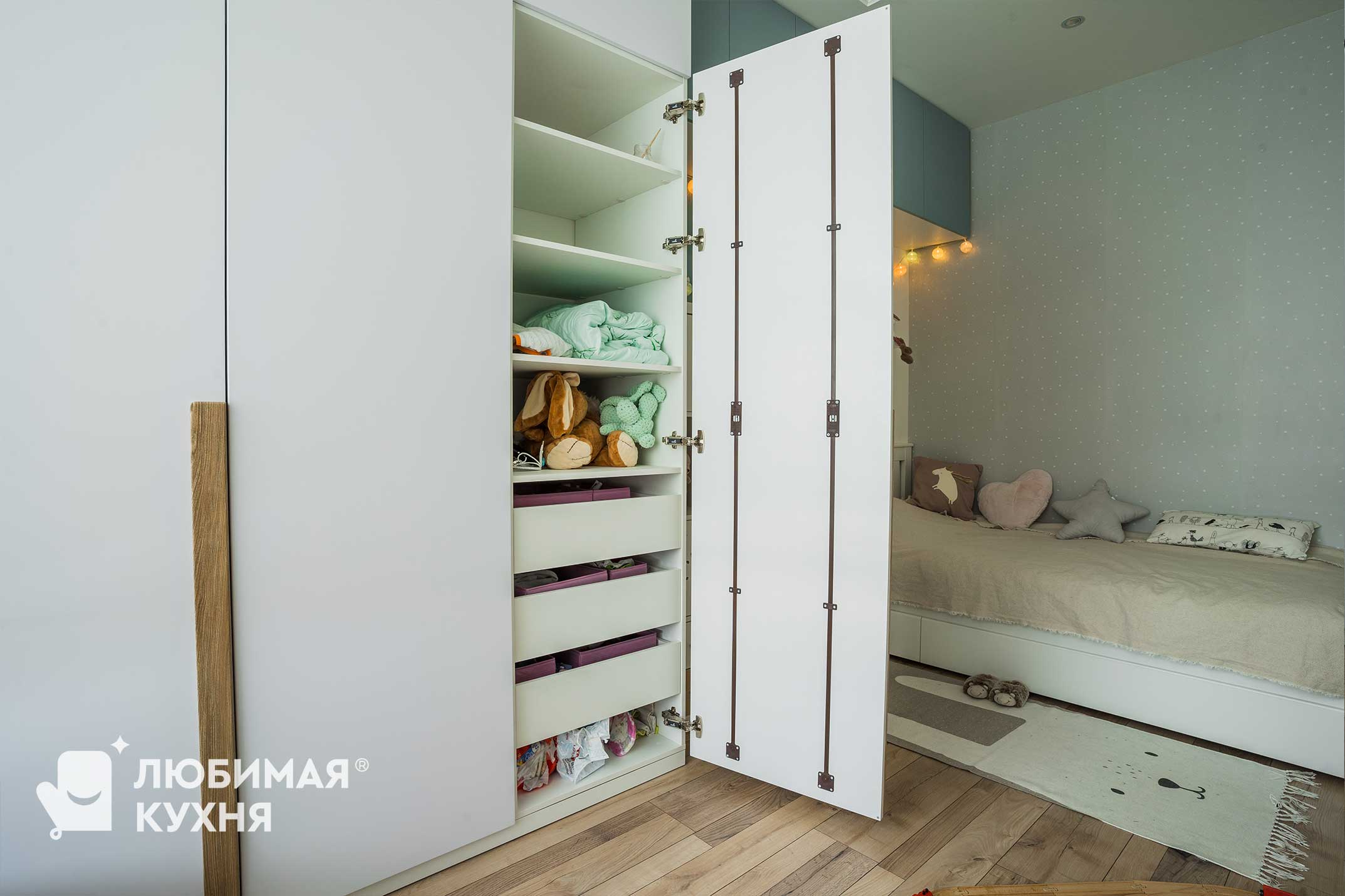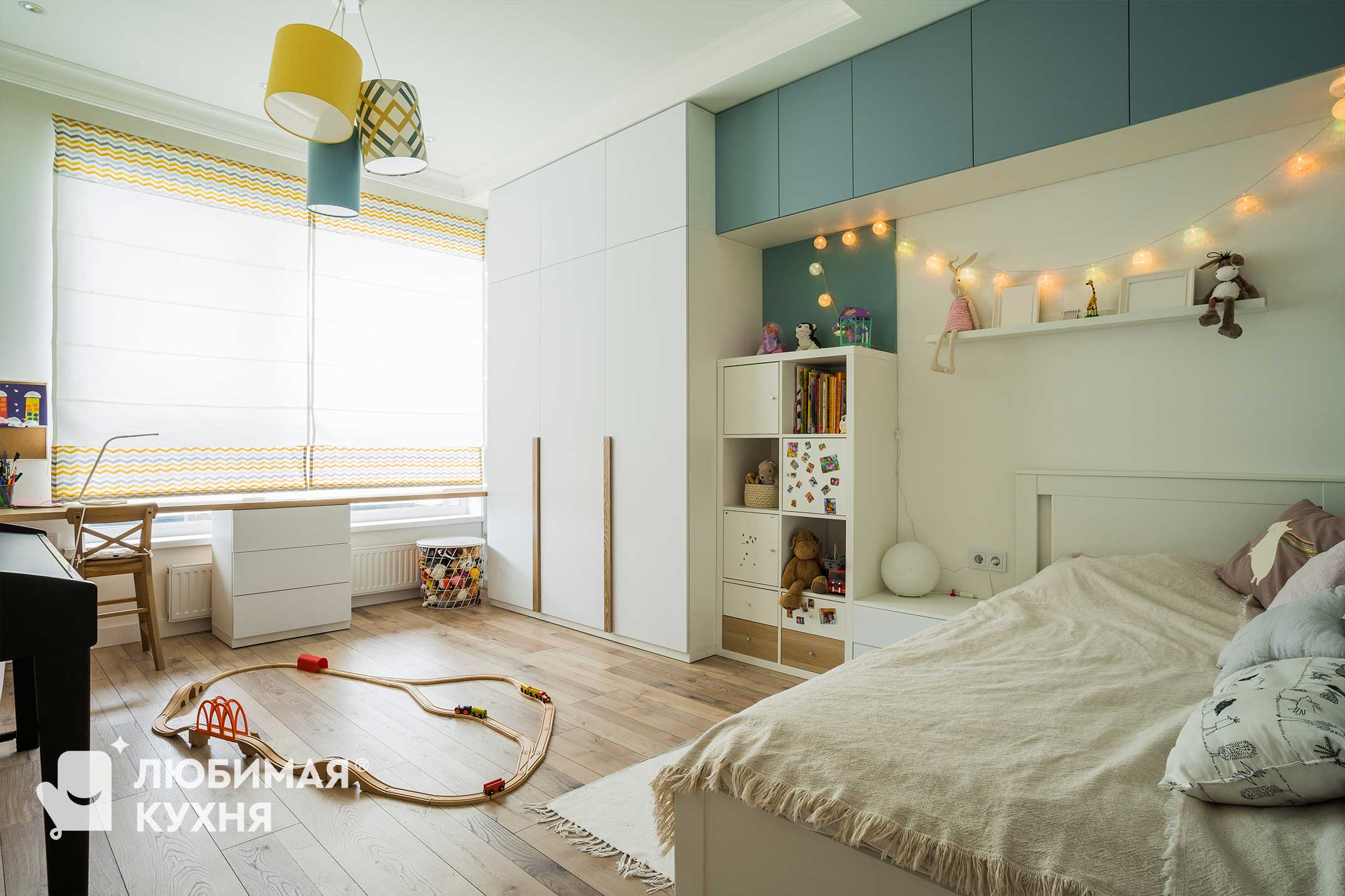 Детская комната в скандинавском стиле с яркими акцентами. Большой рабочий стол на 2 рабочих места, расположенный у окна — обеспечивает отличную освещенность рабочей поверхности. Большой шкаф для одежды с тремя секциями и интересными древесными ручками образует единую композицию с антерсолями зелено-голубого оттенка, под которыми располагается кровать.