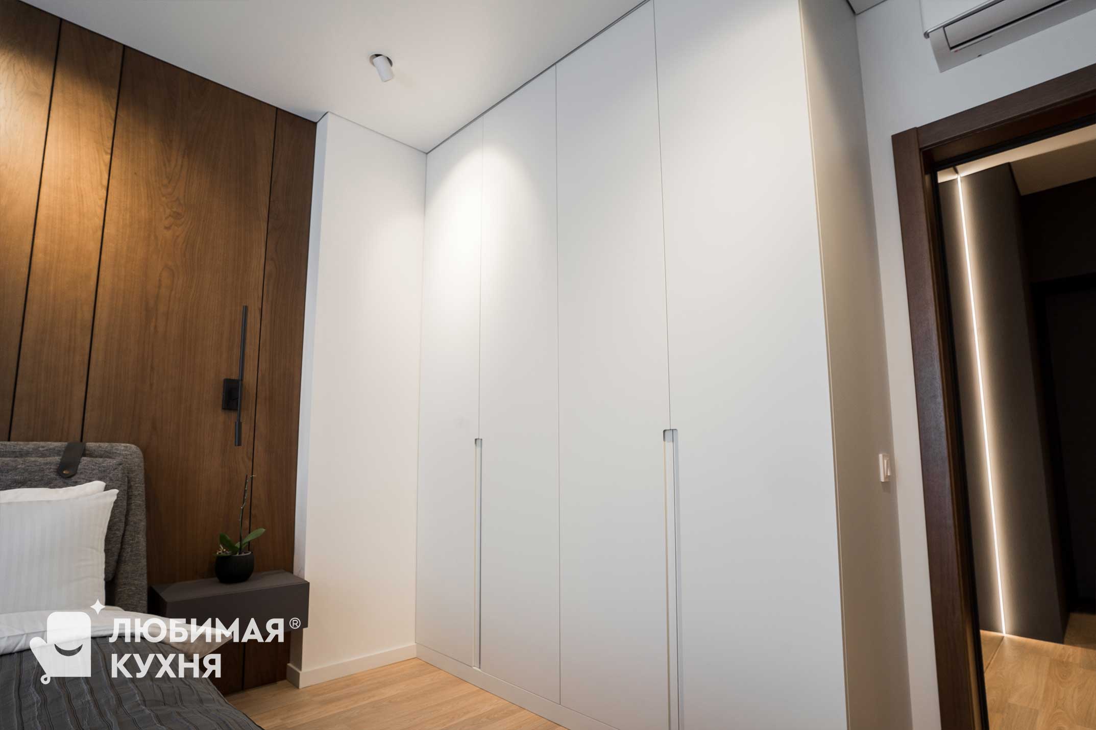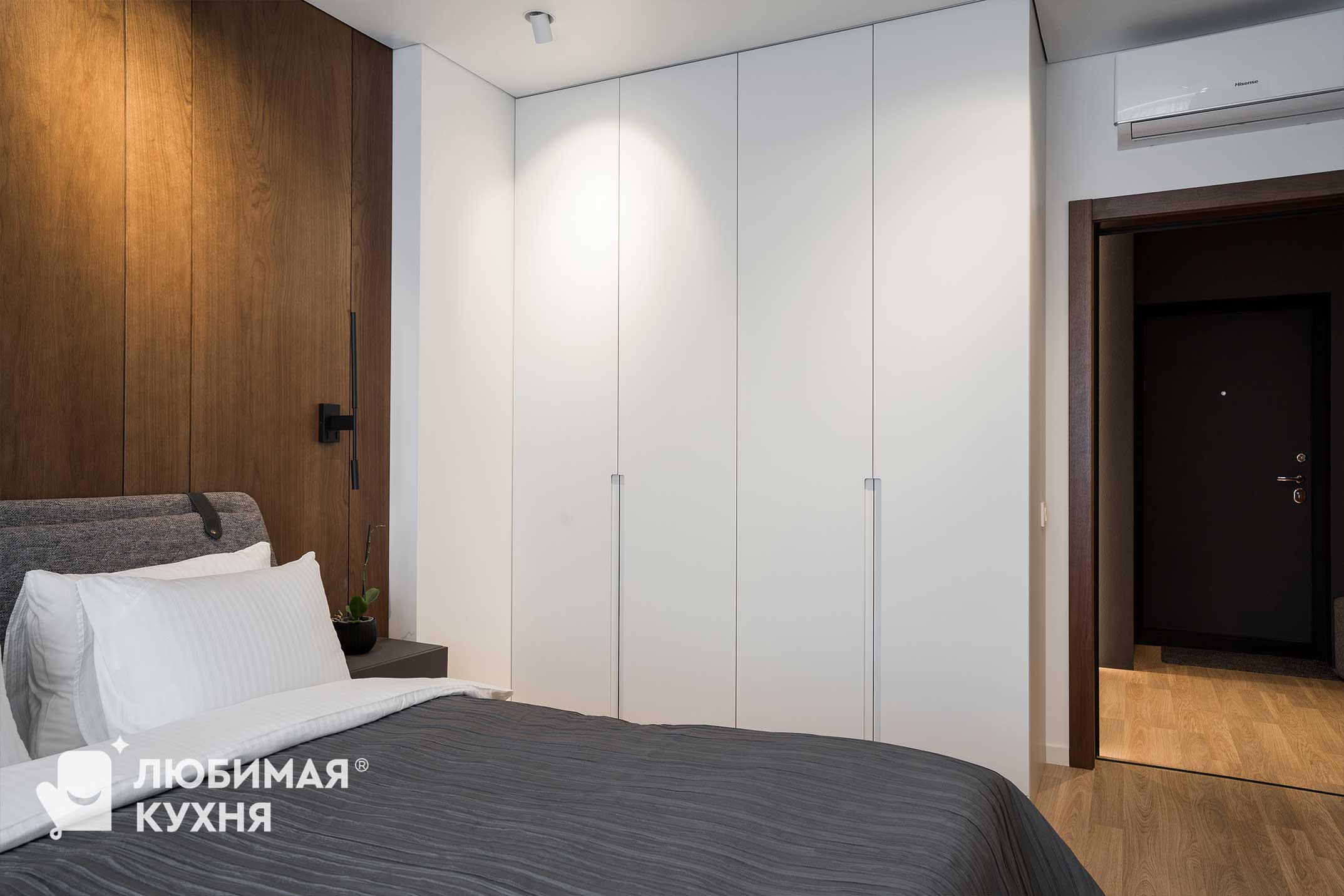 На изображении представлена современная спальня с минималистичным дизайном. Вдоль стены расположен встроенный шкаф с гладкими фасадами, который обеспечивают отличное пространство для хранения вещей.