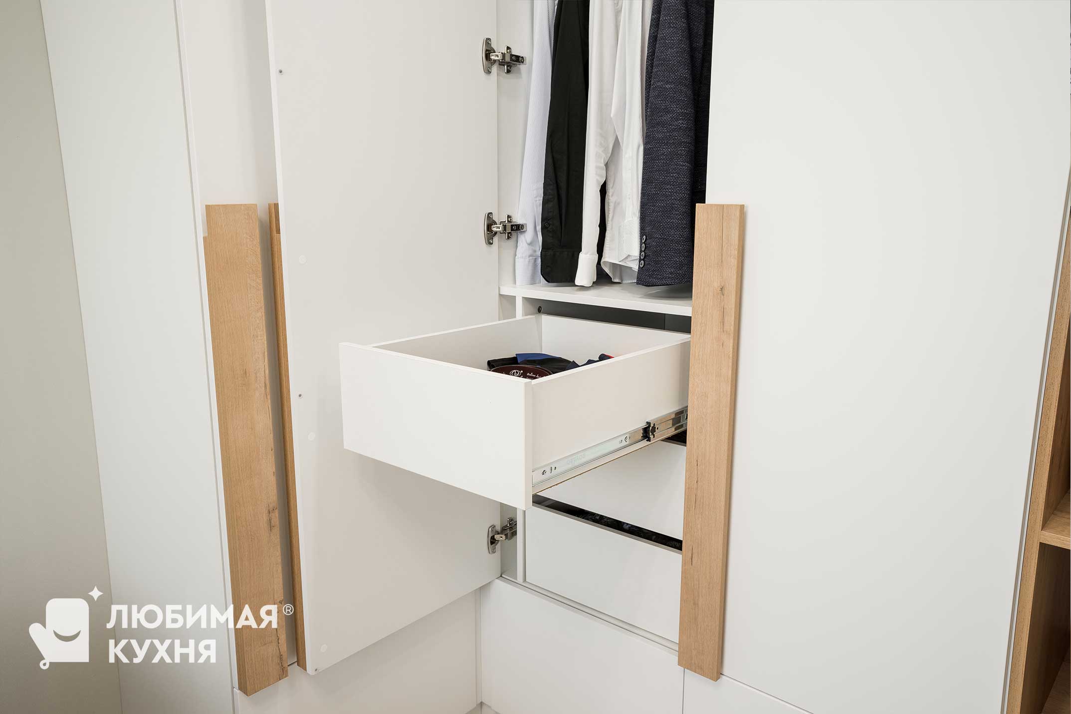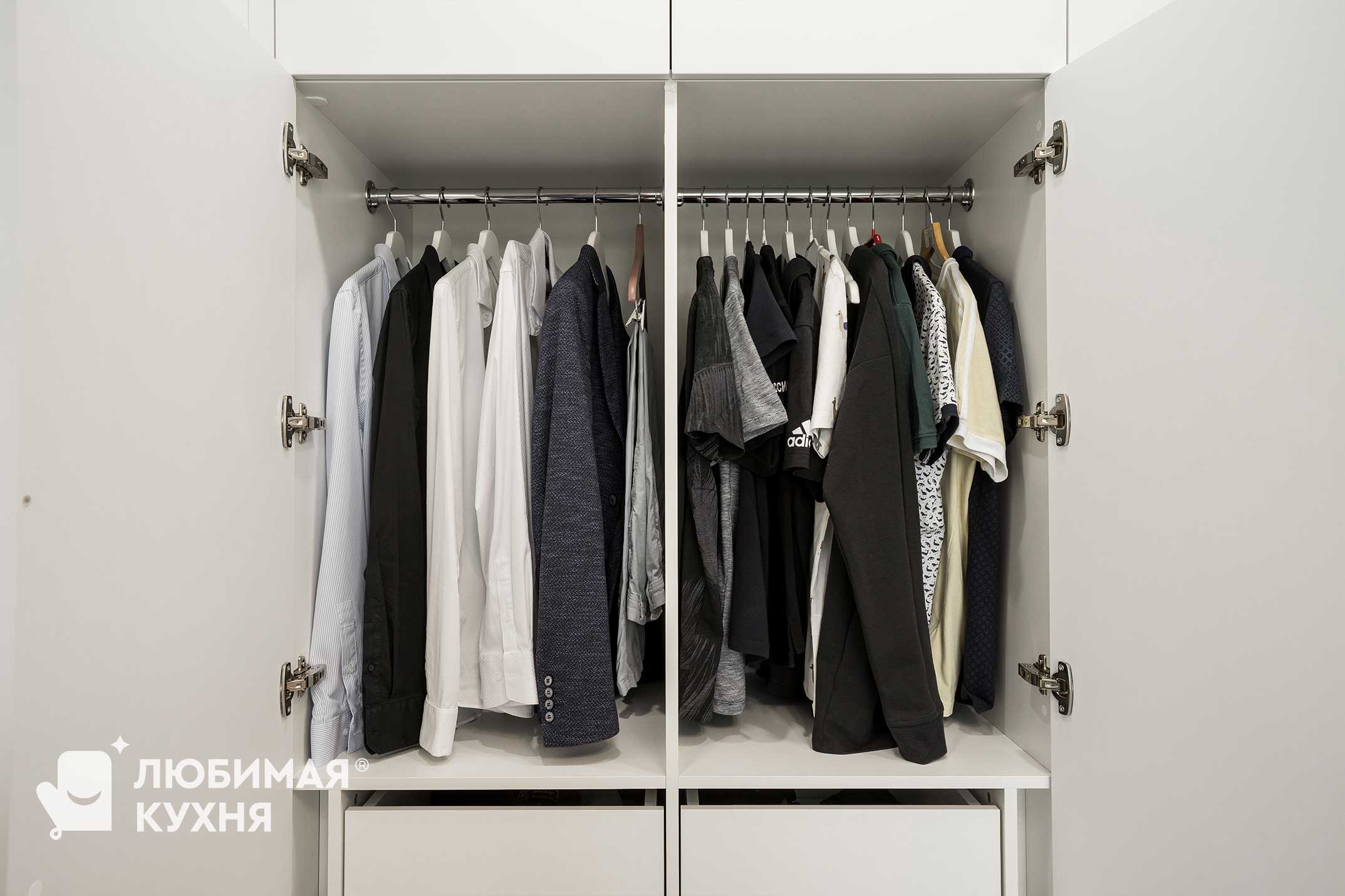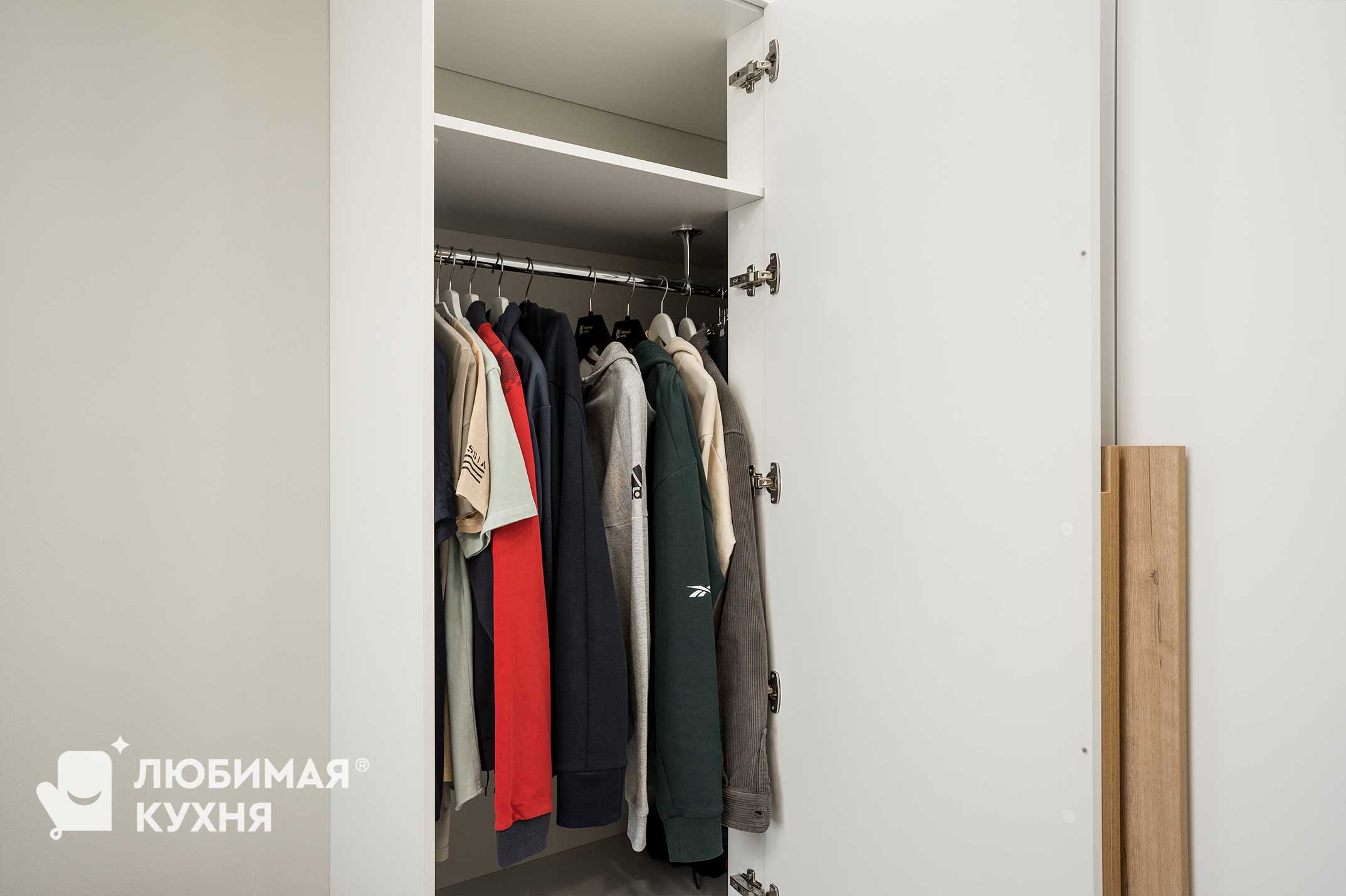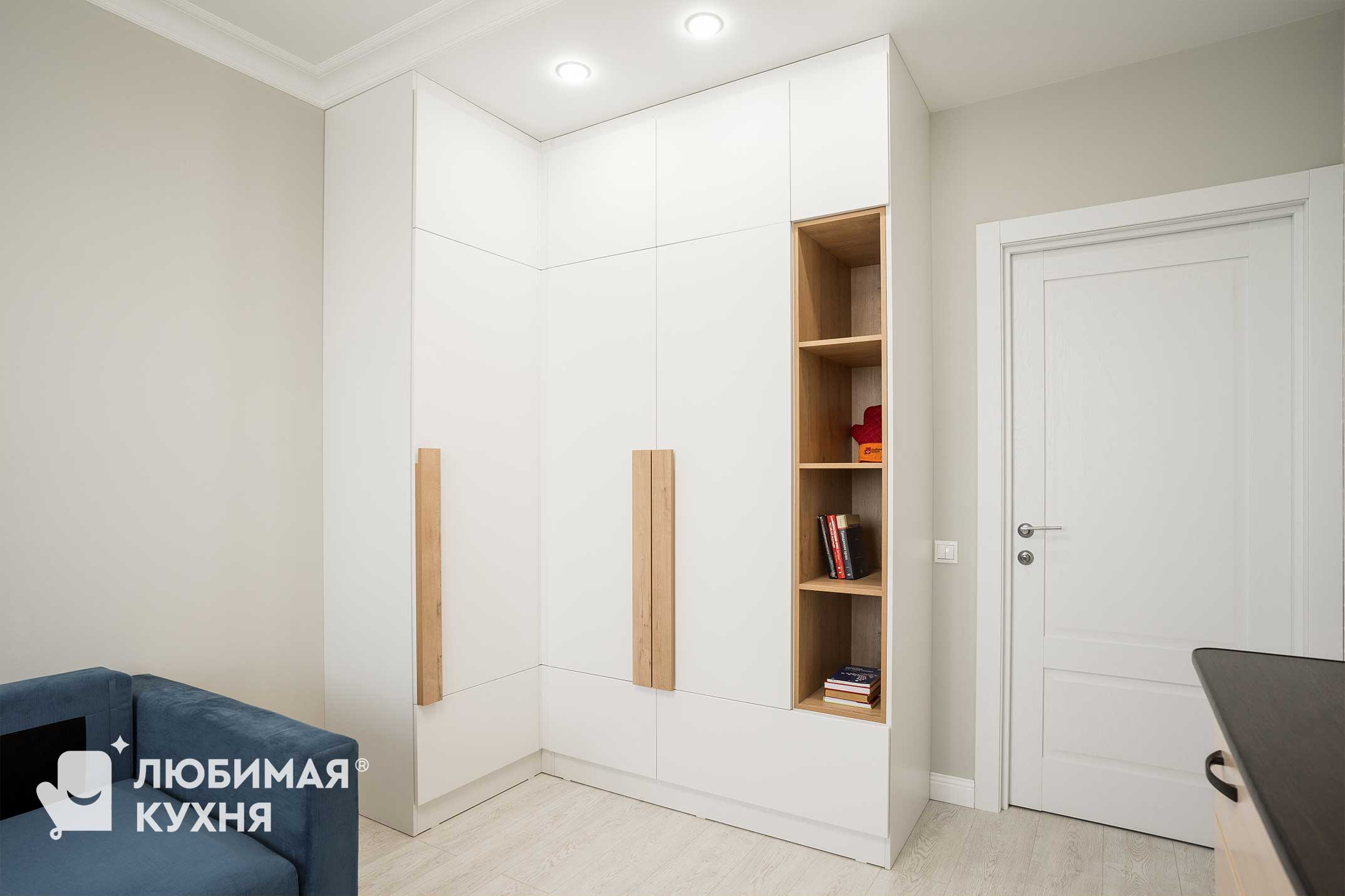 Угловой шкаф — отличное решение для небольшой спальни. Белый цвет и локаничный дизайн отлично вписывают данный шкаф в интерьер.
