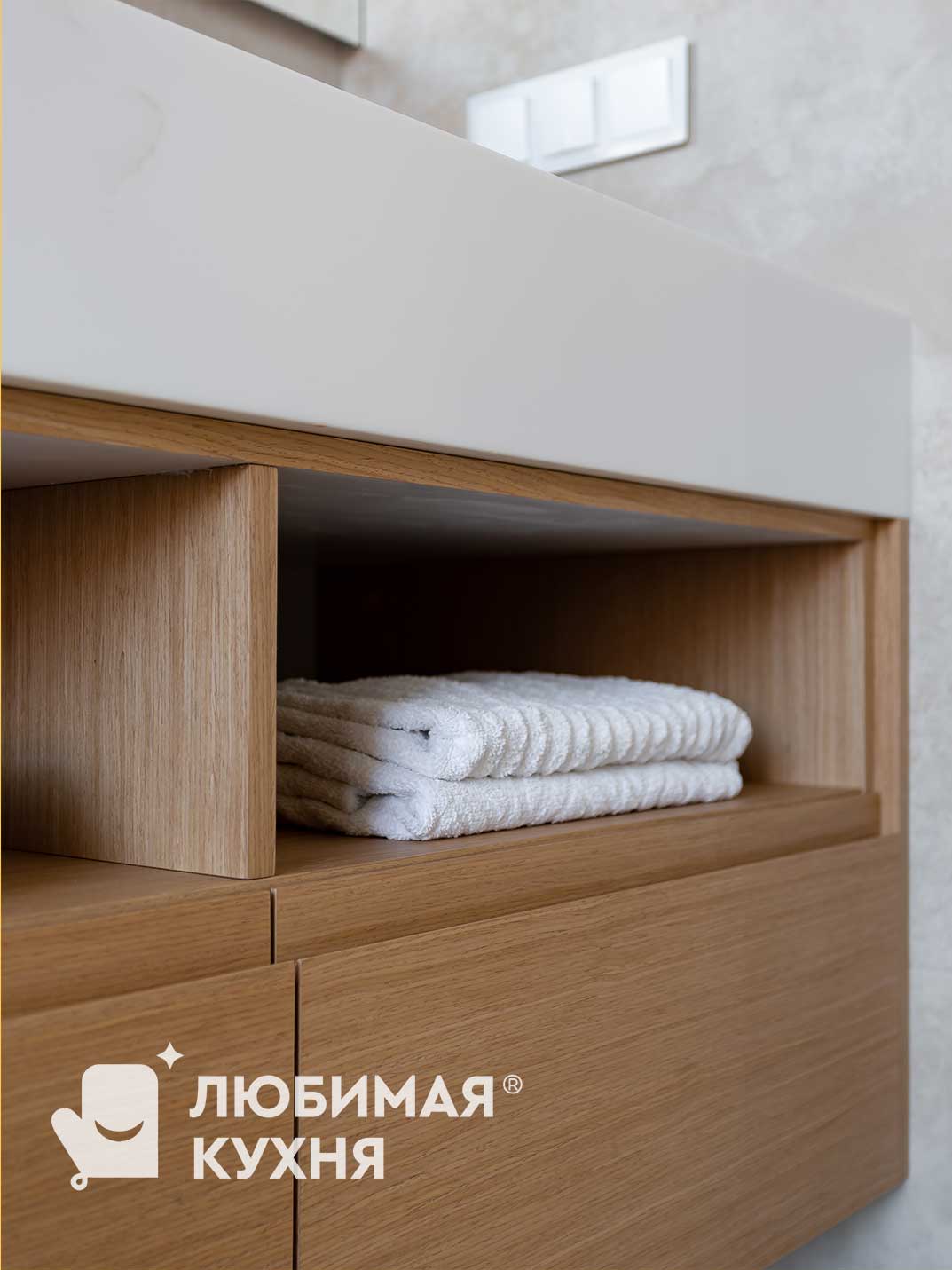 Тумба в этом санузле выполнена в современном стиле и сочетает в себе элегантность и функциональность. Тумба изготовлена из натурального шпона, что придает ей теплый и уютный вид. Верхняя часть выполнена из белого искусственного камня, который легко чистится и создает невероятный контраст с деревянными элементами, а золотистые ручки на ящиках добавляют изысканности и гармонично сочетаются с сантехникой. Лаконичные линии и минималистичный стиль делают тумбу визуально легкой. Открытые полки снизу обеспечивают удобный доступ к полотенцам и другим принадлежностям. В нижней части расположены выдвижные ящики, которые предлагают дополнительное пространство для хранения косметики и других мелочей.