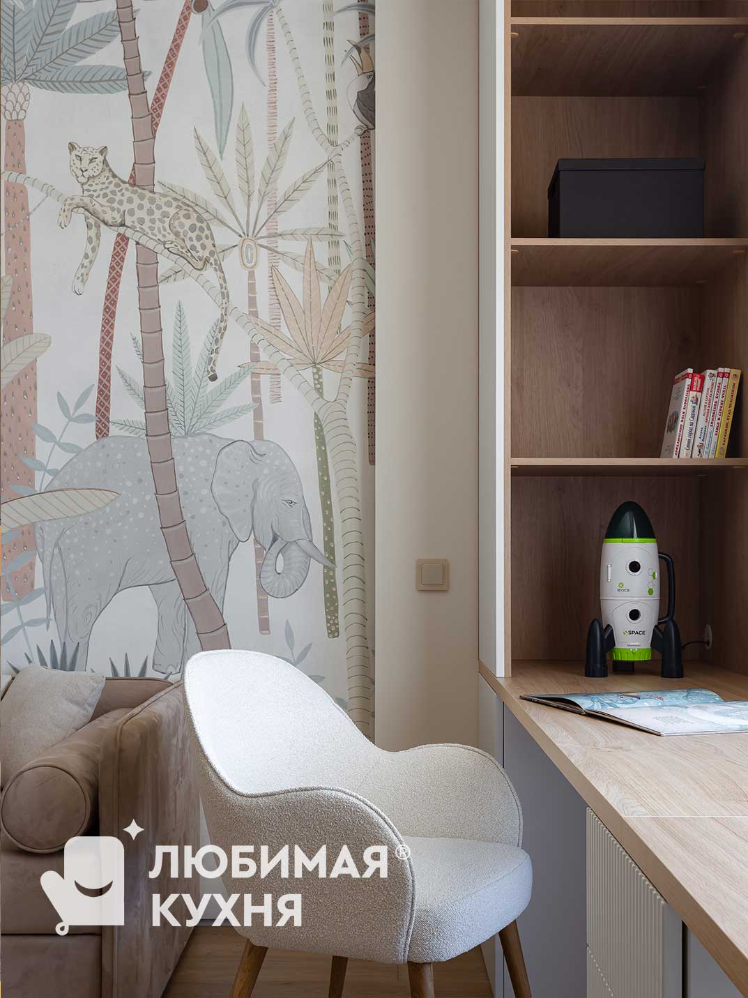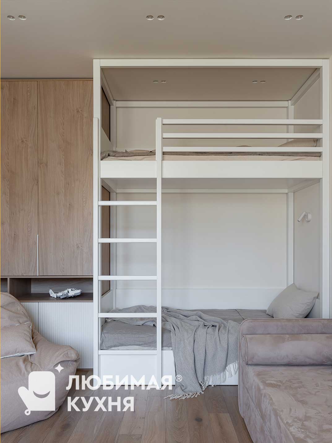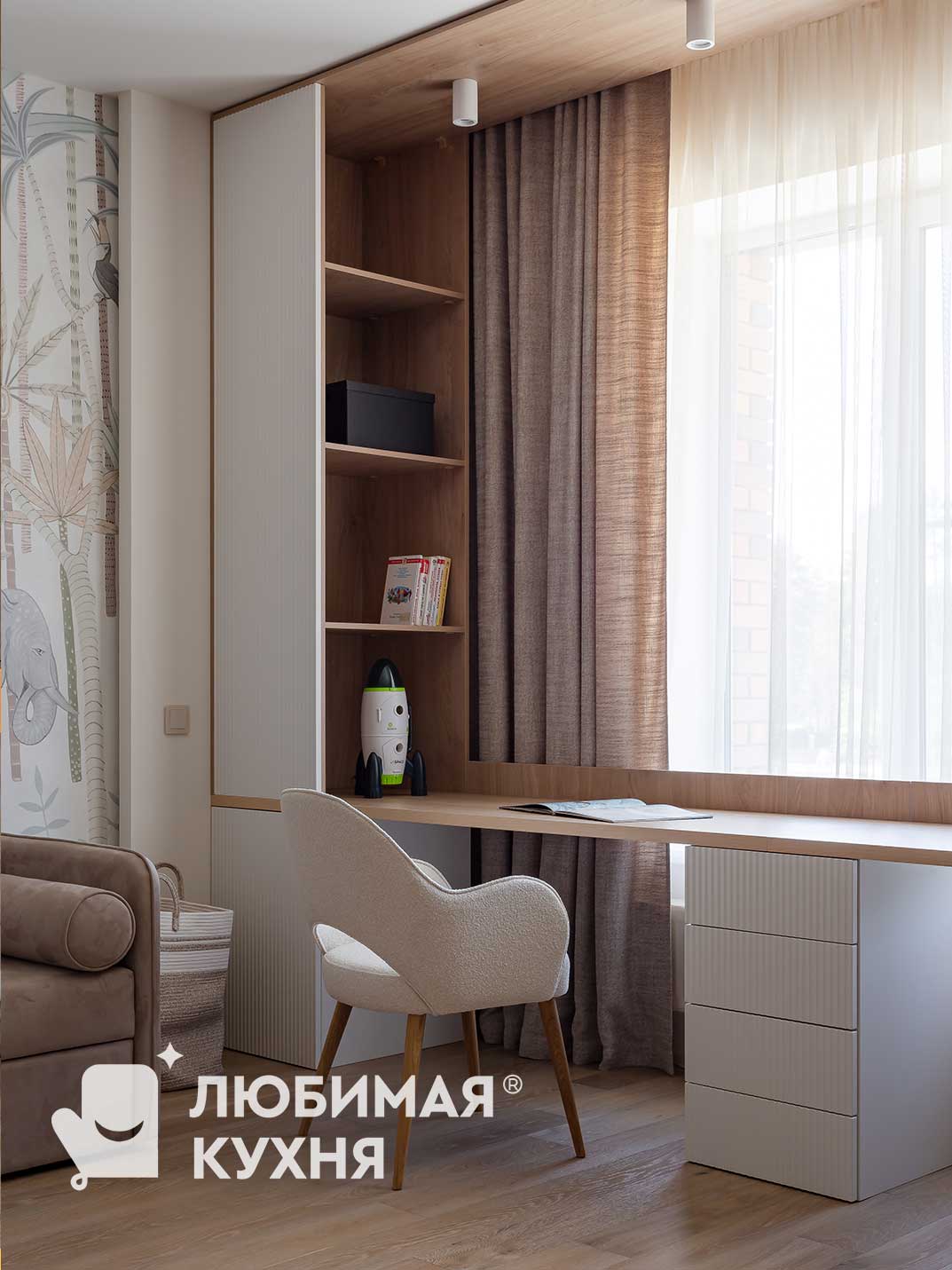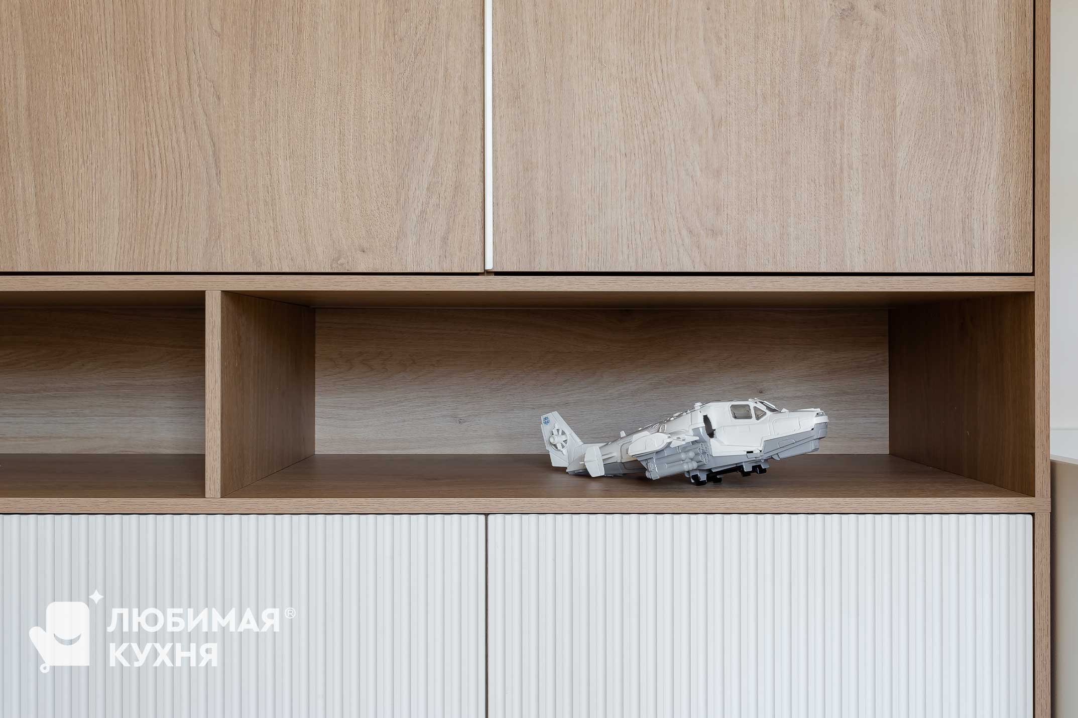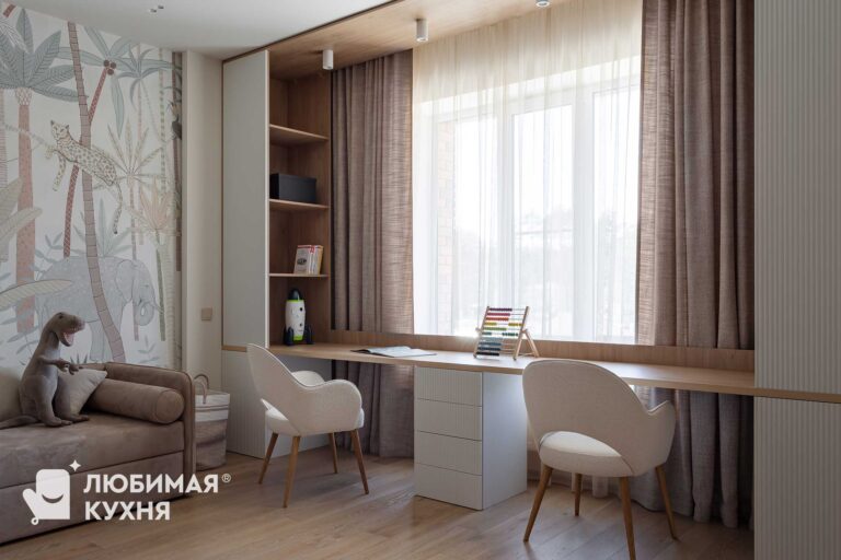 Детская комната — это прежде всего функциональность, нейтральные спокойные оттенки, безопасность и экологичность. Поэтому идеальным решением от “Любимой кухни” стал трехсекционный шкаф для одежды. Высота данного шкафа от пола до потолка обеспечивает хорошую вместительность и устойчивое положение. Рабочая зона представлена широкой столешницей с тумбой посередине и рассчитана на два детских посадочных места. Шкаф с открытыми полками поможет хранить книги каждому ребёнку по отдельности Вертикальная фрезеровка на фасадах шкафа и тумбы прекрасно гармонирует с нижними фасадами шкафа для одежды, и выделяет их из интерьера.