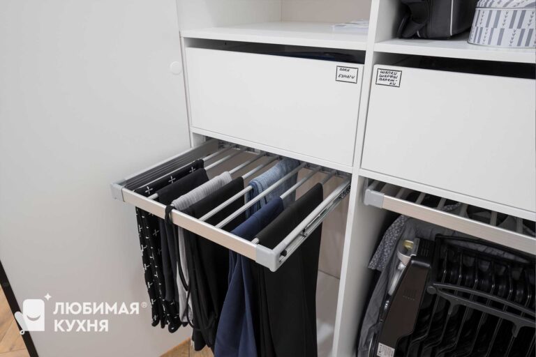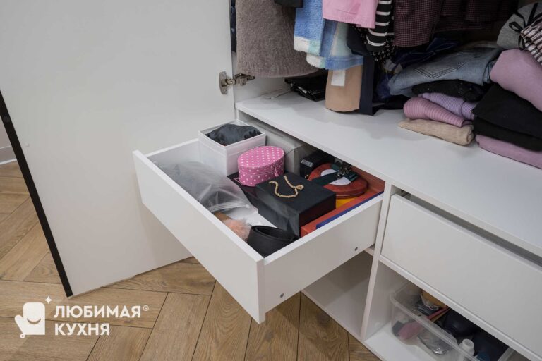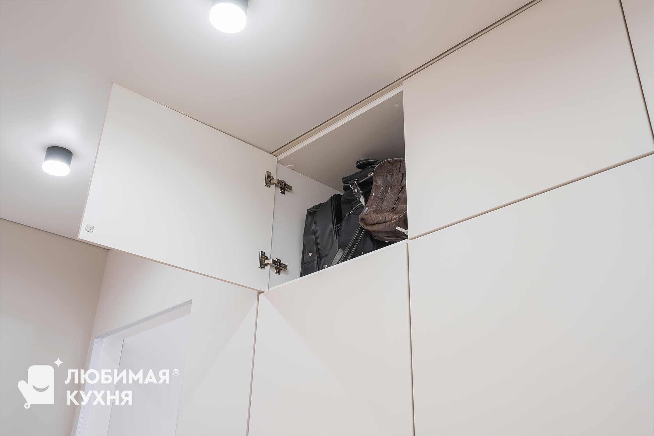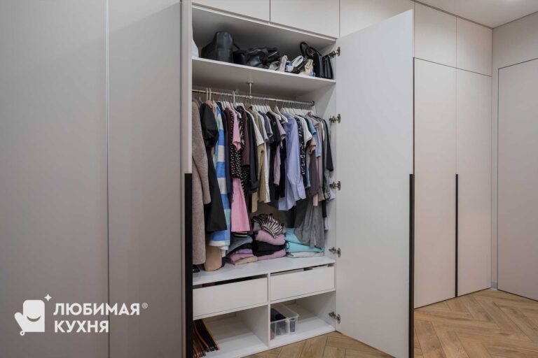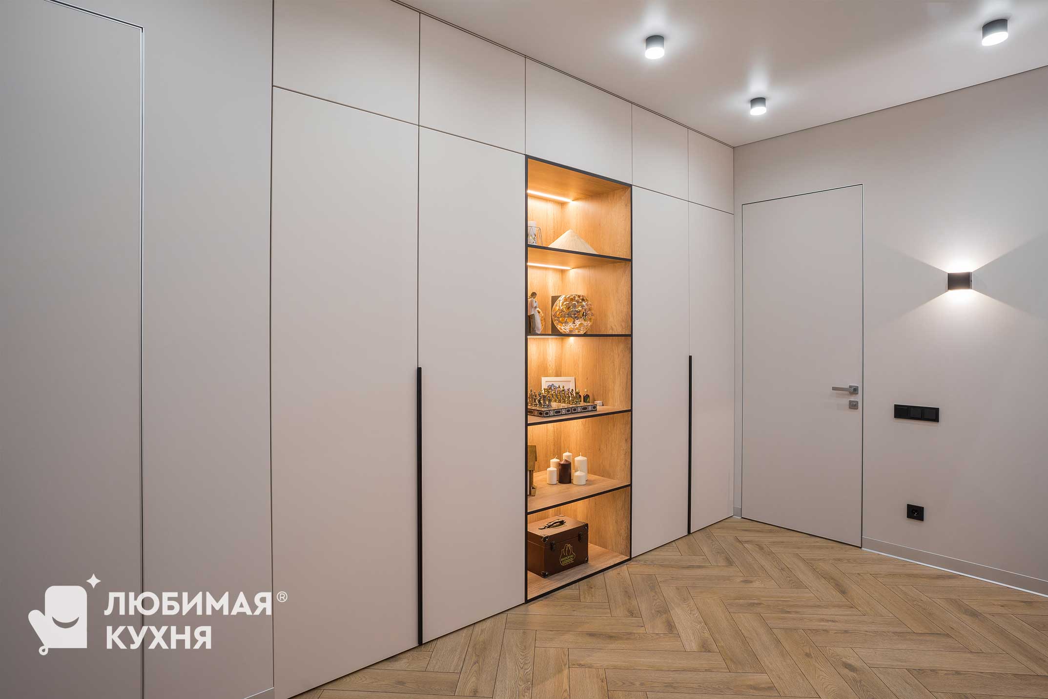 Современный встроенный шкаф с минималистичным дизайном. Шкаф выполнен в светлых тонах с гладкими фасадами, что создает ощущение простора и не перегружает интерьер лишними деталями. Открытые полки с подсветкой служат акцентом и придают динамики.