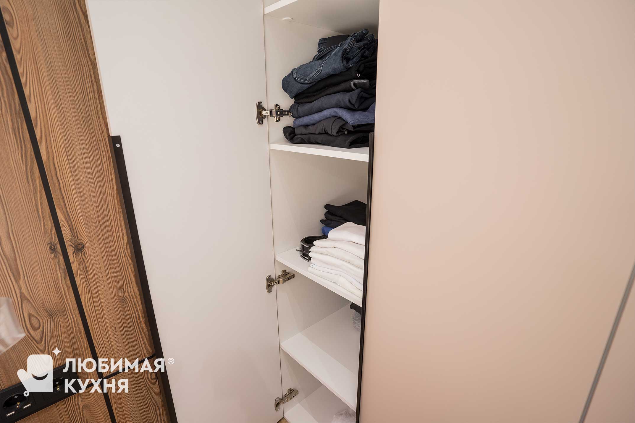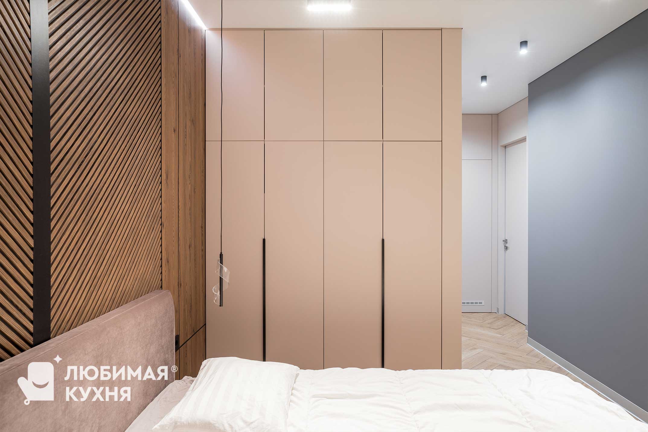 Минималистичный шкаф для спальни. Четкие, прямые линии и очень сдержанный лаконичный дизайн, цвет фасадов точно повторяет цвет стен что растворяет шкаф в пространстве.