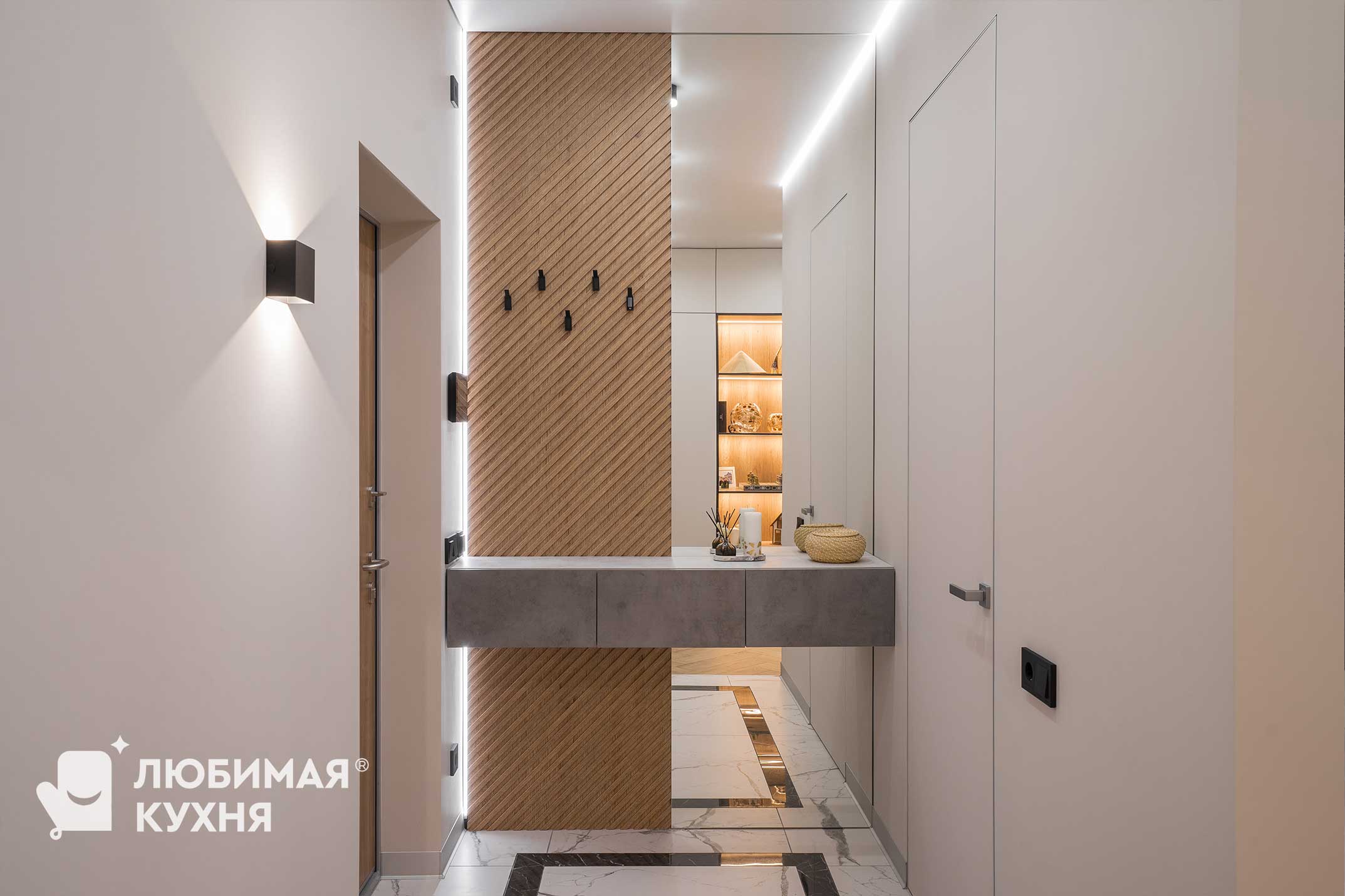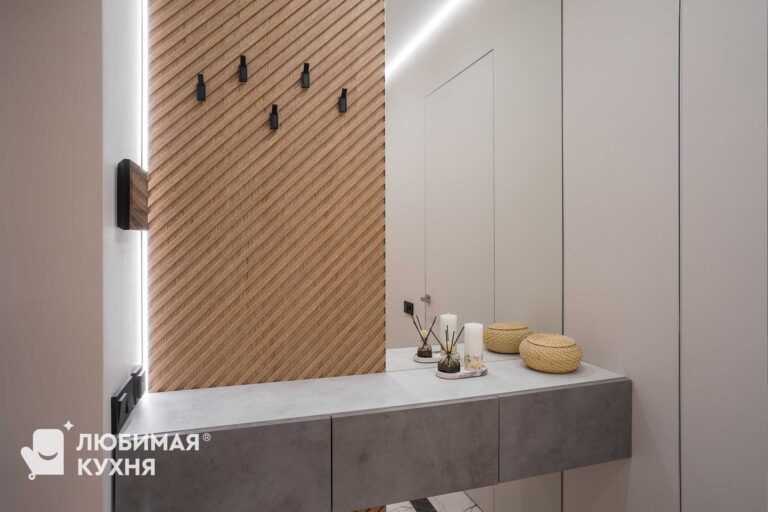 Подвесная консоль — очень удобное и минималистичное решение для прихожей. Не занимает много места, вниз можно потавить пуф для комфортного одевания обуви. А в большое зеркало можно полюбоваться на себя в полный рост.