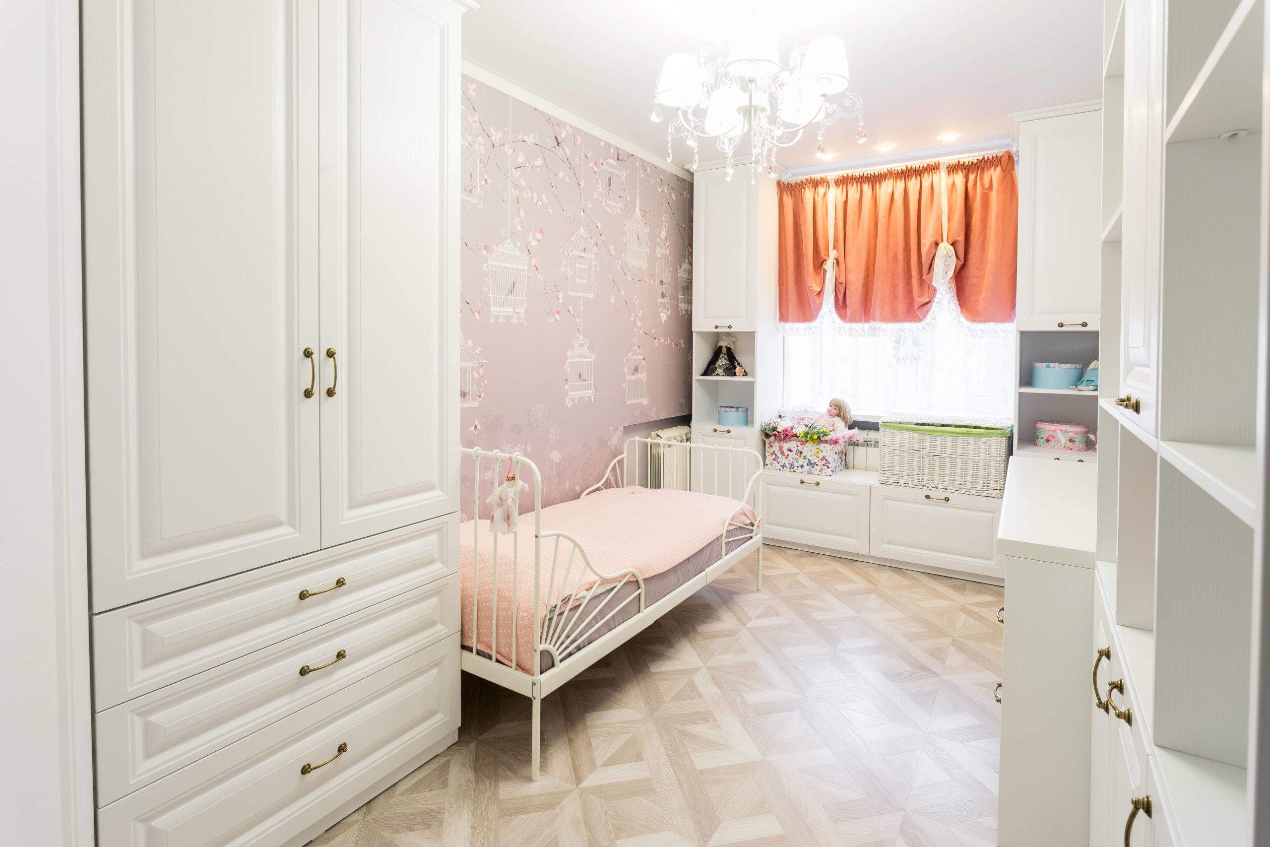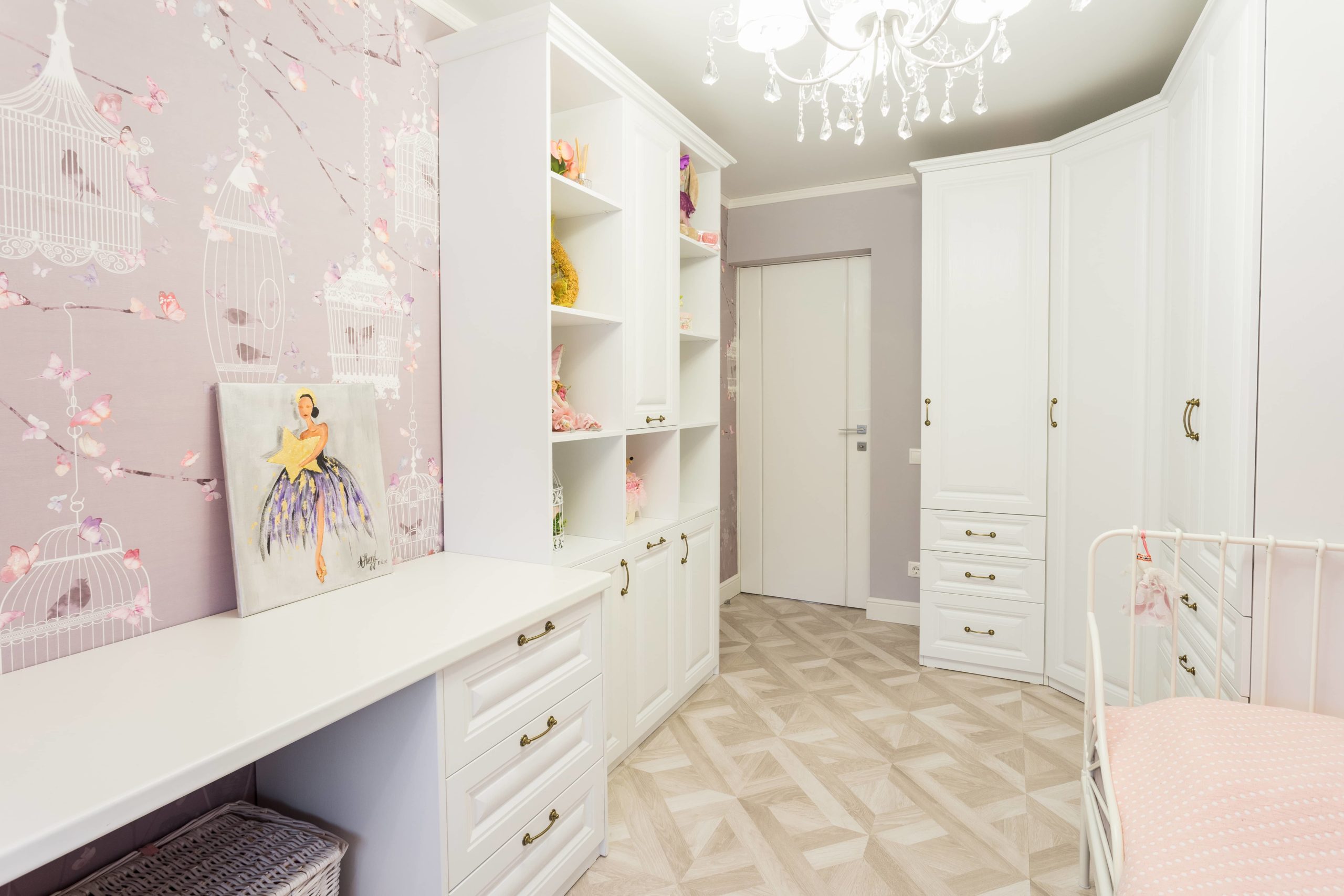Невероятно легкая и нежная детская для девочки в стиле современная классика. Вся мебель выполнена в светлых тонах. что визуально расширяет пространство. Изящные фасады с фрезеровкой как бы обрамляют всю комнату, создавая атмосферу спокойствия и уюта. Детская состоит из углового шкафа-купе, письменный стол, стенка с местом для сидения, шкаф с открытыми полками для книг и игрушек.