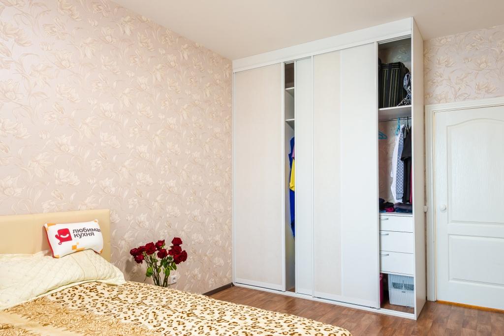 Шкаф-купе выполнен в теплых, пастельных тонах — идеальный вариант для спальни! Шкаф-купе состоит из трех секций. В левой расположены полки, в средней секции штанга для длинной одежды. Правая секция скомплектована тремя выдвижными ящиками. Дополнительно, в средней секции установлена раздвижная полка для обуви.