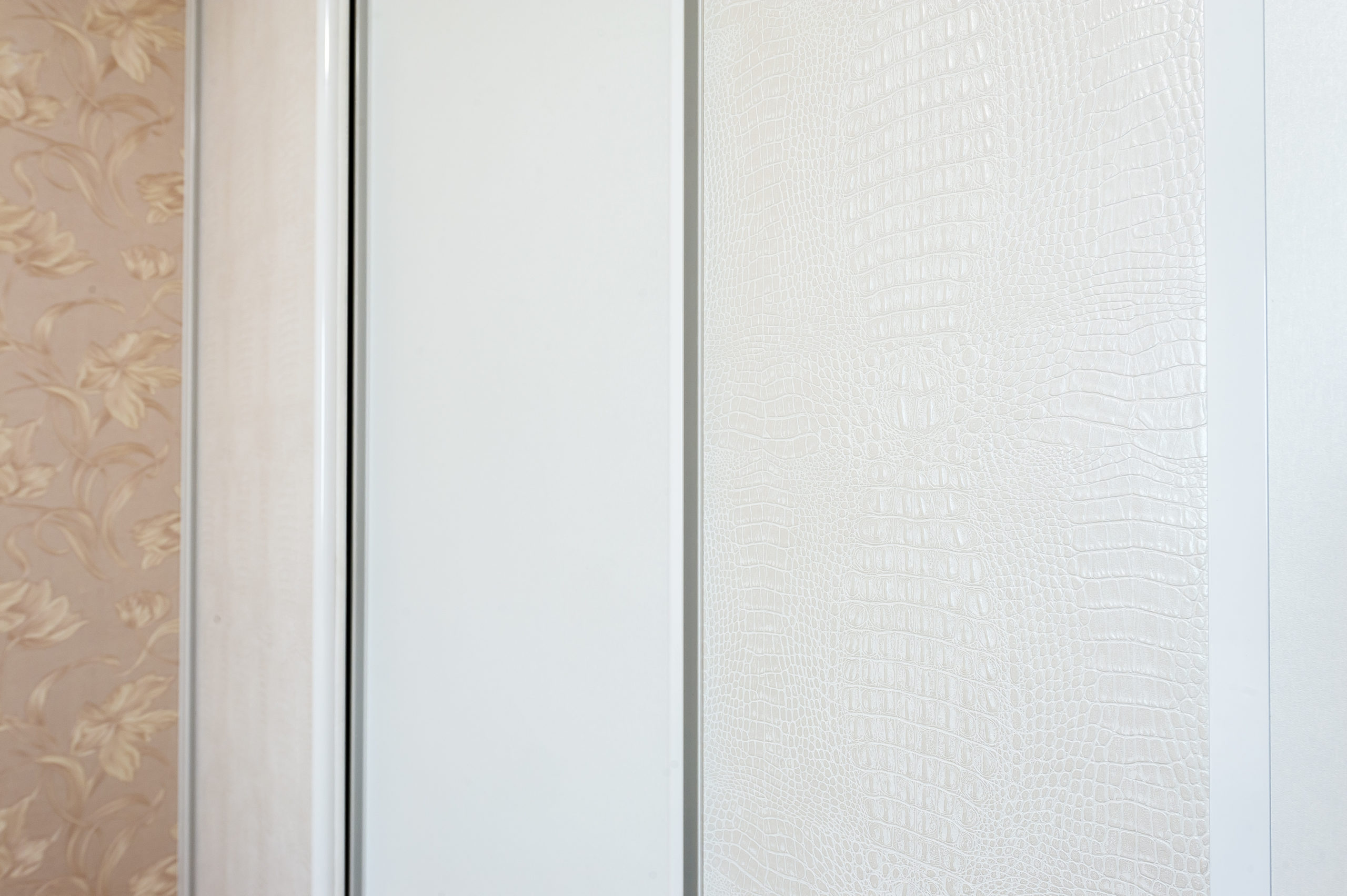 Двери: ЛДСП белый и деко-панели, в цвете Жемчужный перламутр. Профиль «Профи» белый глянец.
