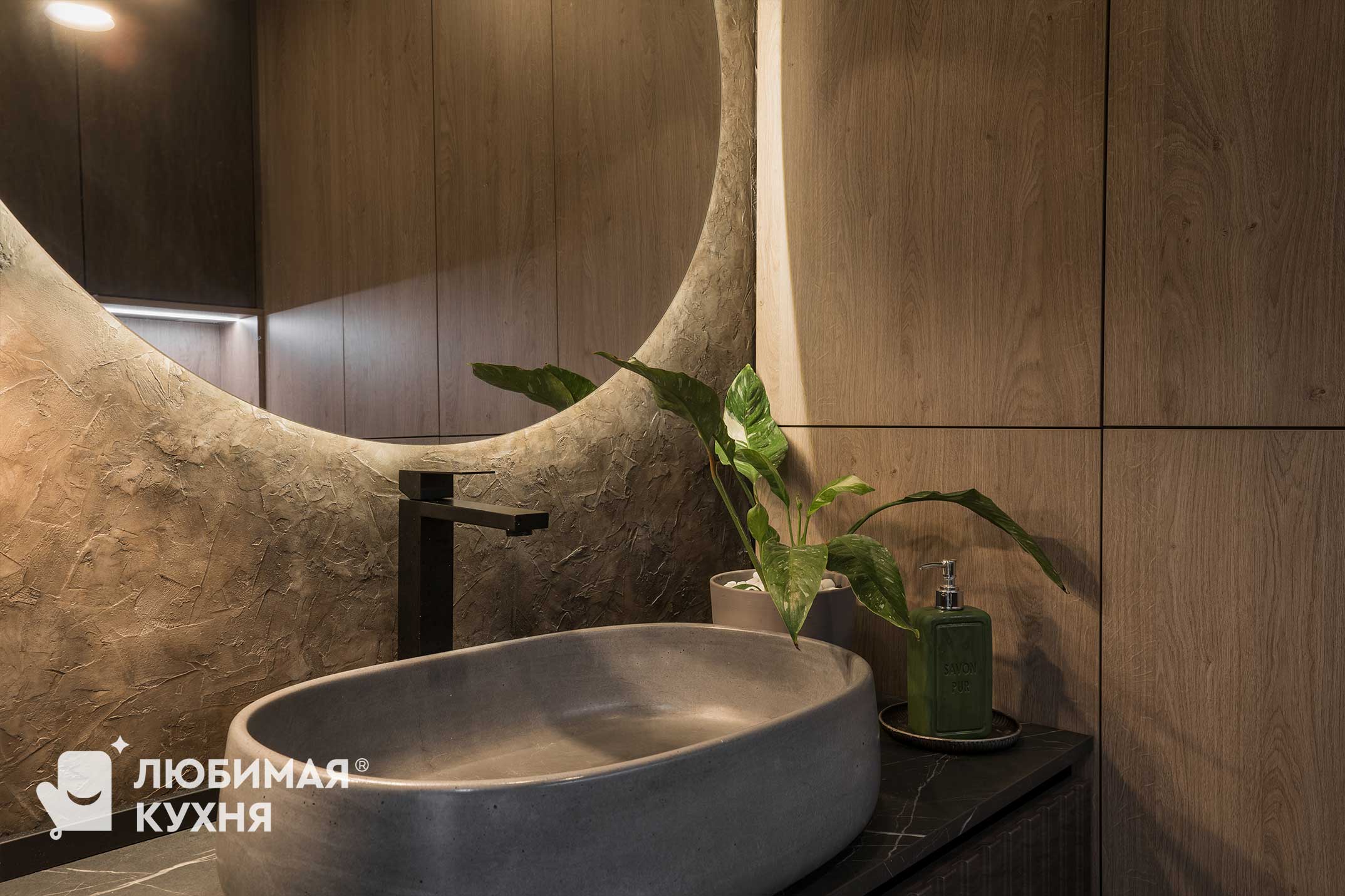 Брутальный санузел для любителей находится в уединении. Брутальная тумба с вместительными ящиками под раковину с металлической опорой и рифлеными фасадами плавно переходит в невероятно вместительные пеналы, в которых предусмотрены системы хранения. Над инсталляцией — полка с подсветкой и шкафом. Каждый сантиметр данного санузла использован по максимуму благодаря грамотной планировке.