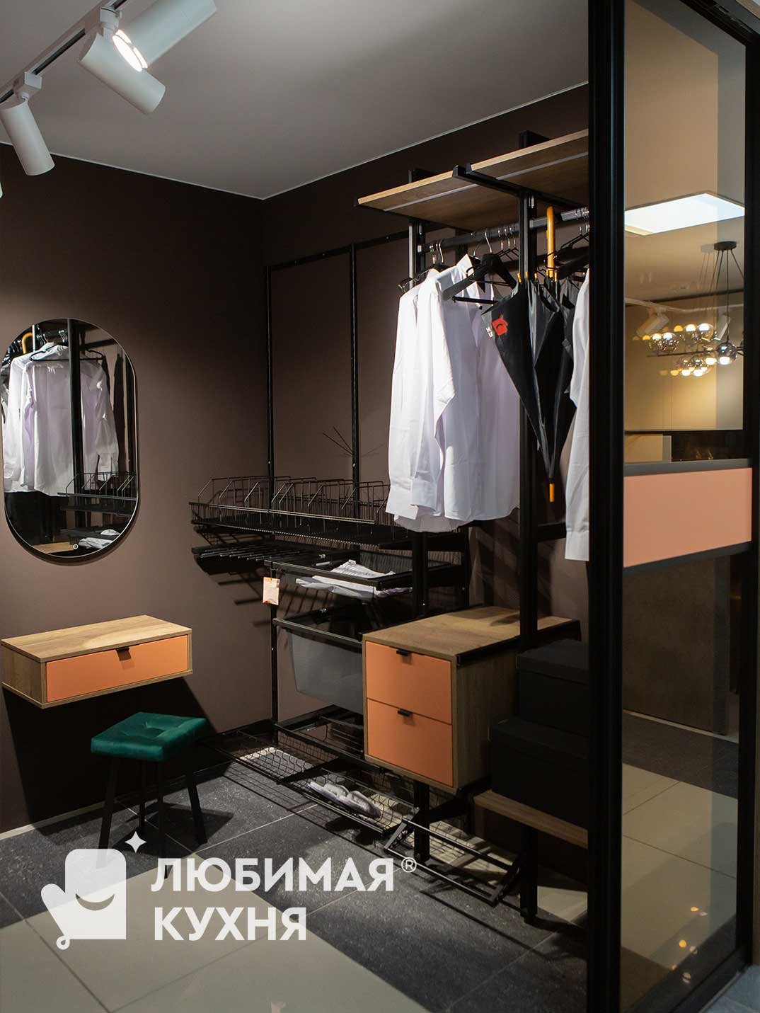 Внутренне наполнение: гардеробная система Аристо, корпусная мебель ЛДСП Дуб Галифакс натуральный, фасад ТРП Терракот Шагрень