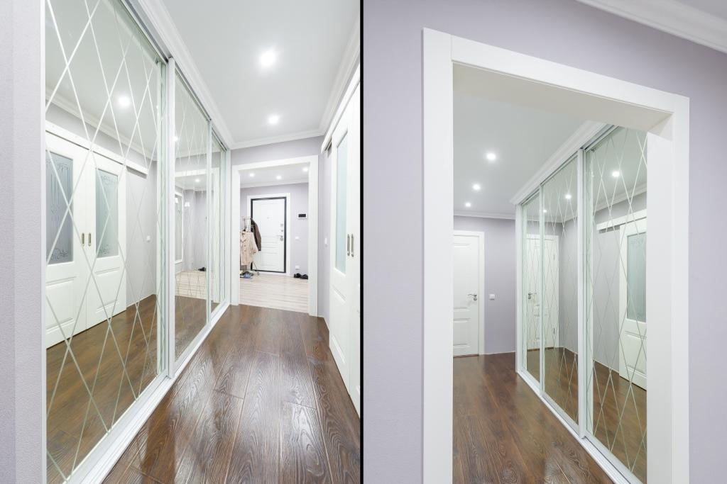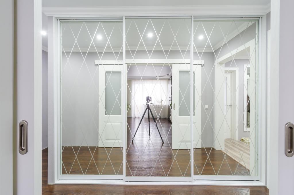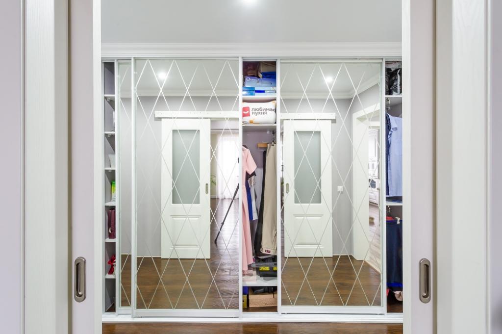 Двери: Зеркало серебро с наненесением матового пескоструйного рисунка. Профиль «Профи», цвет белый глянец.