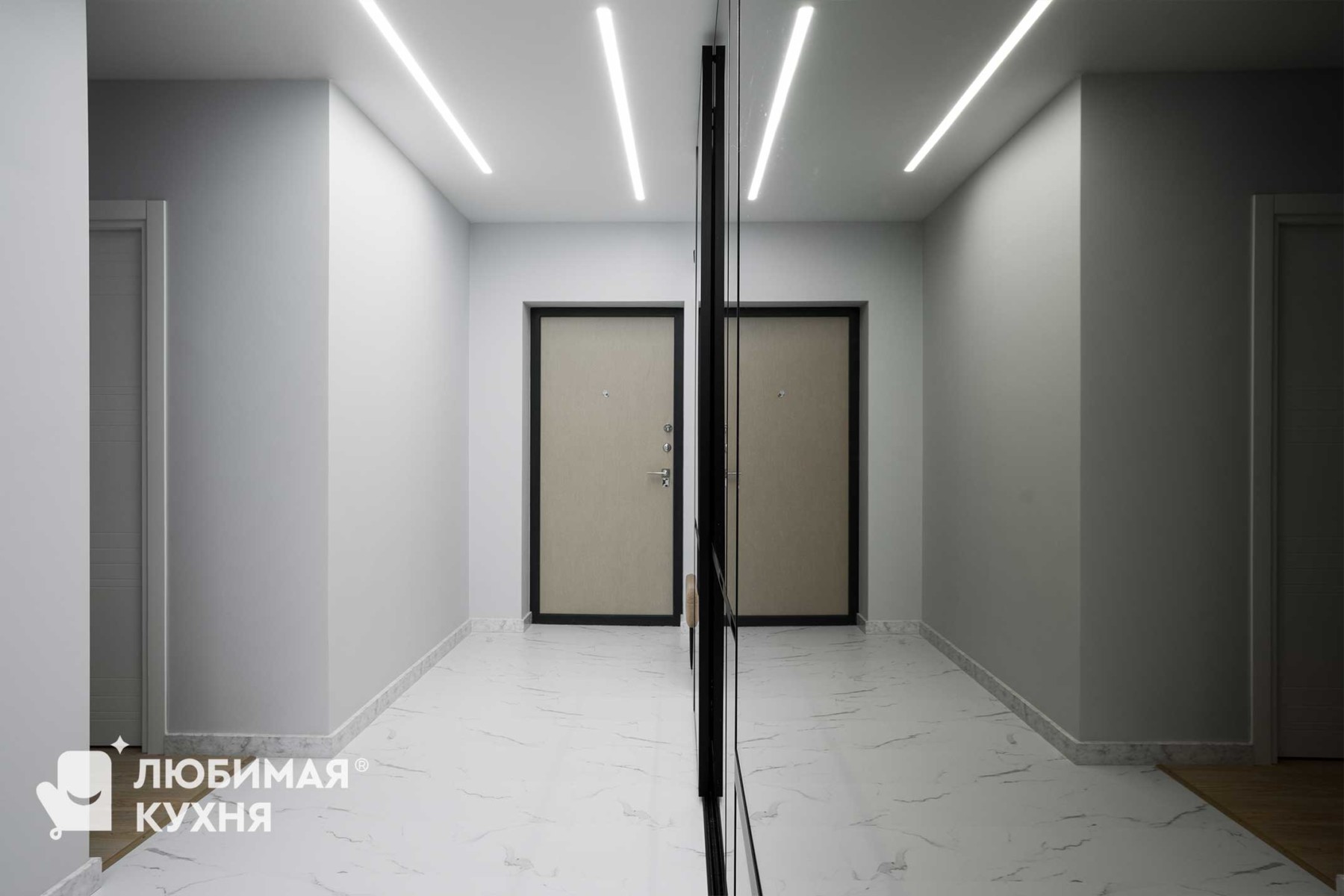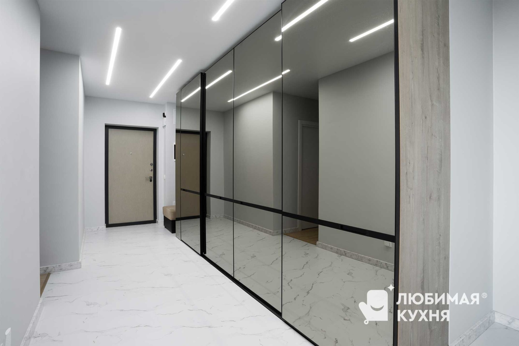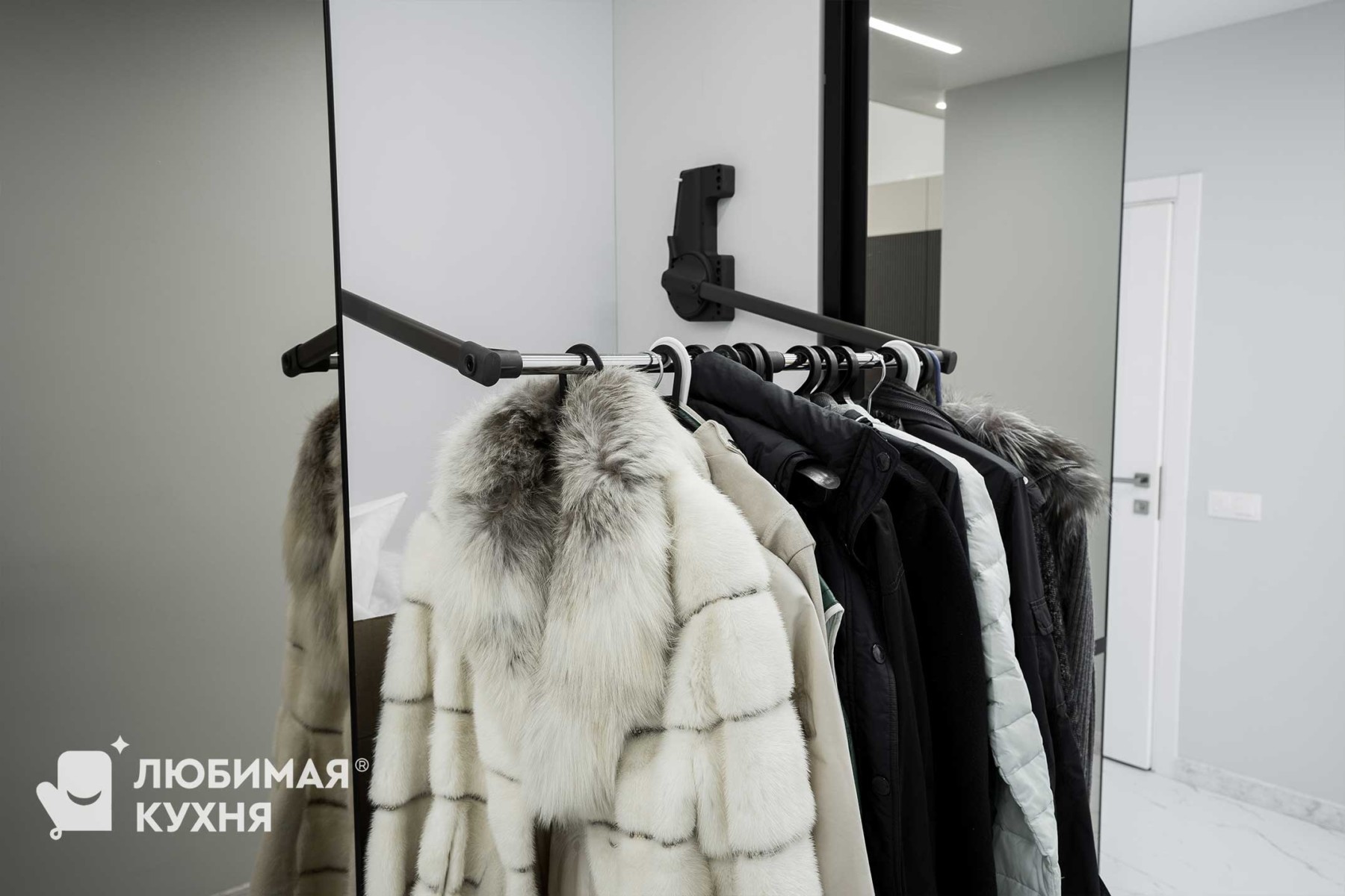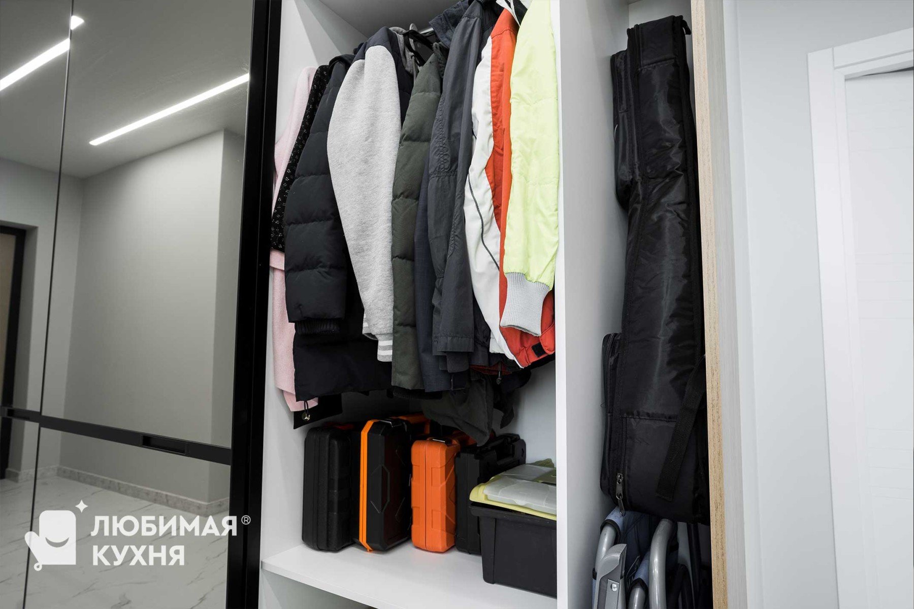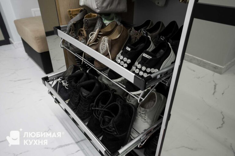 Шикарный шкаф-купе с большими зеркальными дверьми расширили границы прихожей. Кажется, что здесь существует зазеркалье. А оно и правда существует! За дверьми вмещается столько всего. Мы расширили границы его вместимости благодаря грамотному и современному наполнению — пантограф, корзины для обуви, полки и ящики нужного размера. Мы расширили границы удовольствия от пользования шкафом благодаря современным материалам и фурнитуре — двери легко и бесшумно открываются и закрываются без стука с помощью доводчика. Современное наполнение шкафа позволяет использовать каждый сантиметр пространства по максимуму — пантограф, корзины для обуви, полки и ящики нужного размера.