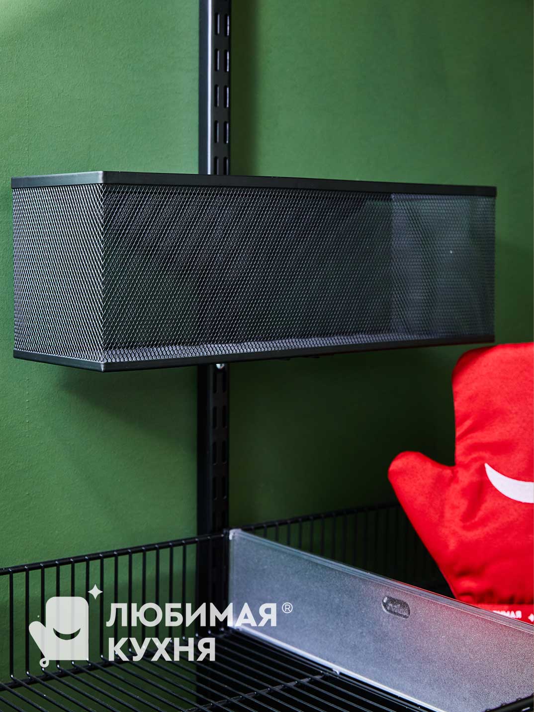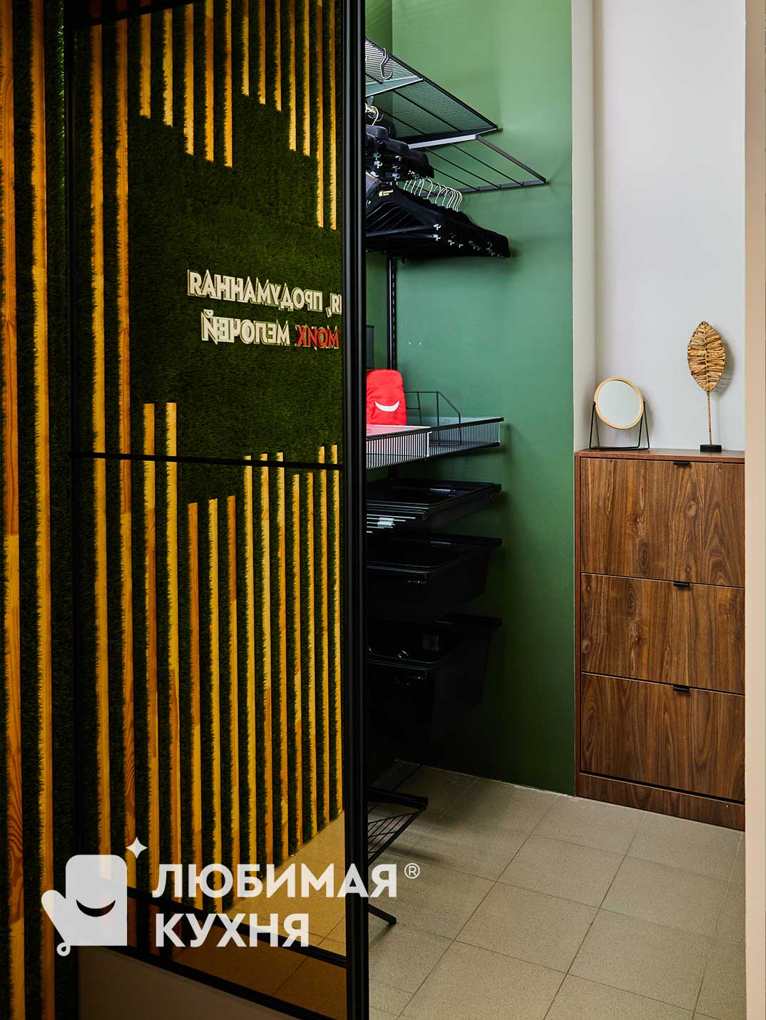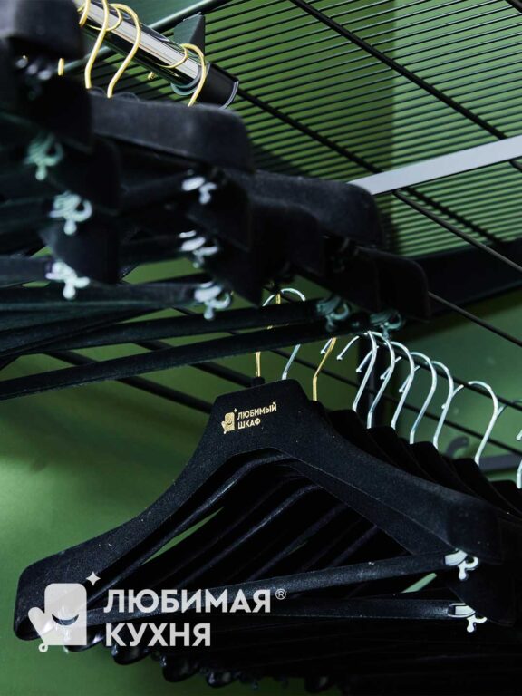 Гардеробная оформлена в современном стиле с акцентом на функциональность и эстетику. Глубокий зеленый цвет — создает уютную атмосферу, а контрастные детали, в виде черных полок и вешалок, добавляют современный оттенок. Гардеробная оборудована открытыми металлическими полками и вешалками, что обеспечивает легкий доступ к одежде. На нижнем уровне расположены выдвижные ящики для хранения аксессуаров и мелочей. Гардеробная сочетает в себе практичность и стиль, создавая комфортное пространство для хранения одежды и аксессуаров.
