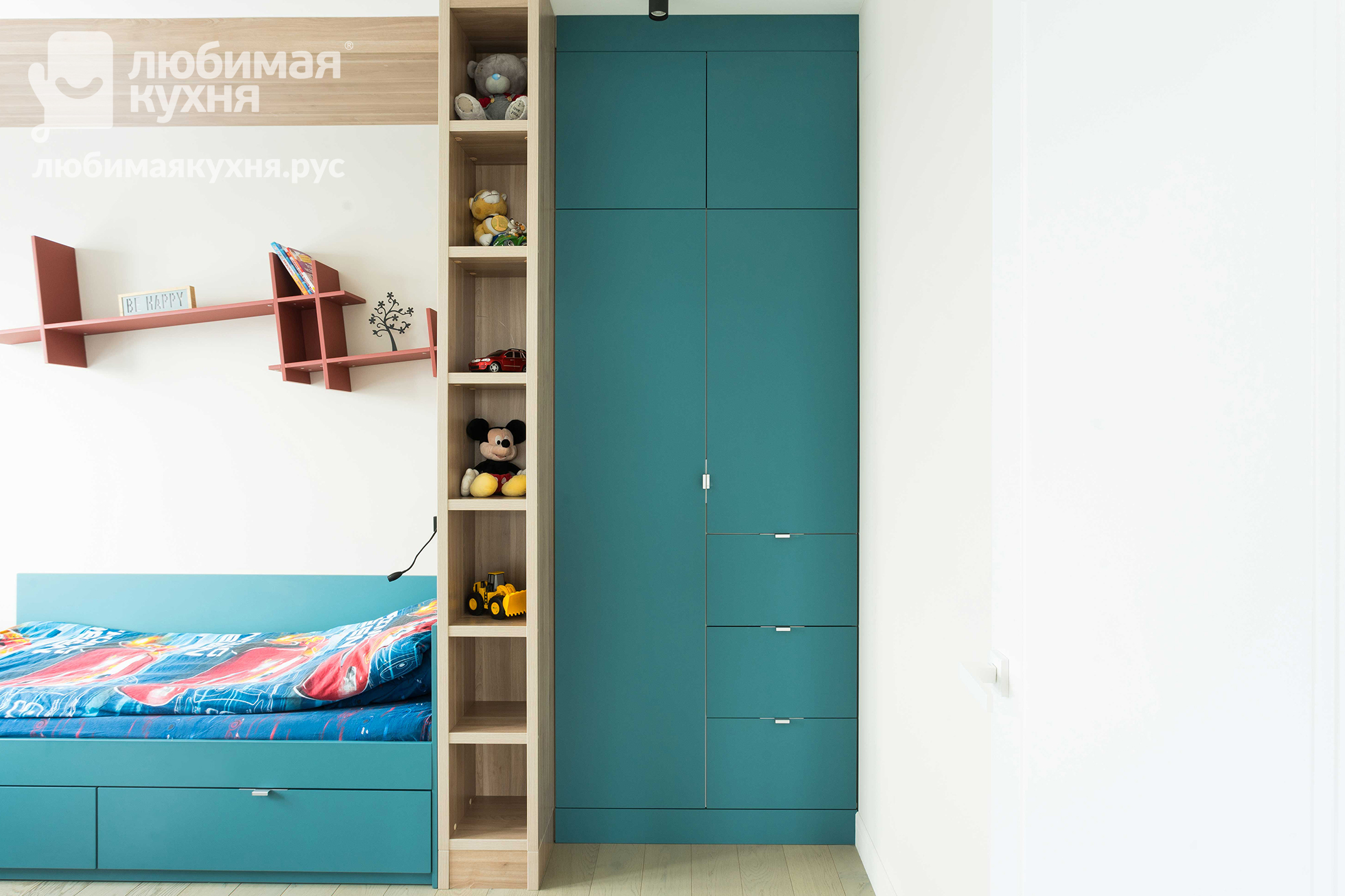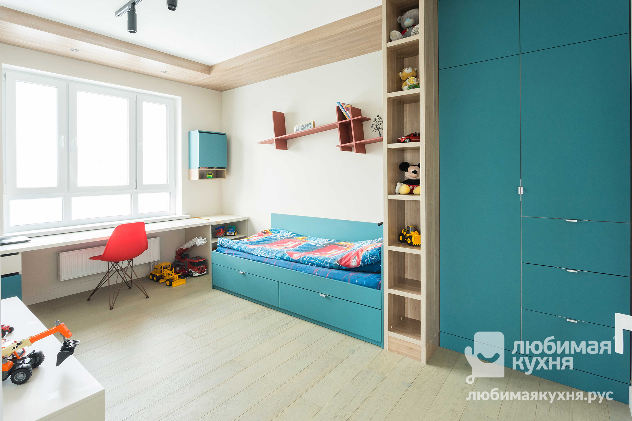 Комплект мебели для детской комнаты для мальчика в современном стиле. Вся мебель спроектирована под нужды маленького заказчика. В такой комнате ребенку никогда не будет скучно, каждый предмет мебели делит комнату на функциональные зоны — сна, учебы и игр. Шкаф состоит из 2-х отделений. В первом отделении располагаются две штанги для вещей на плечиках, во втором отделении расположены полки и выдвижные ящики. Наверху расположена антресоль.